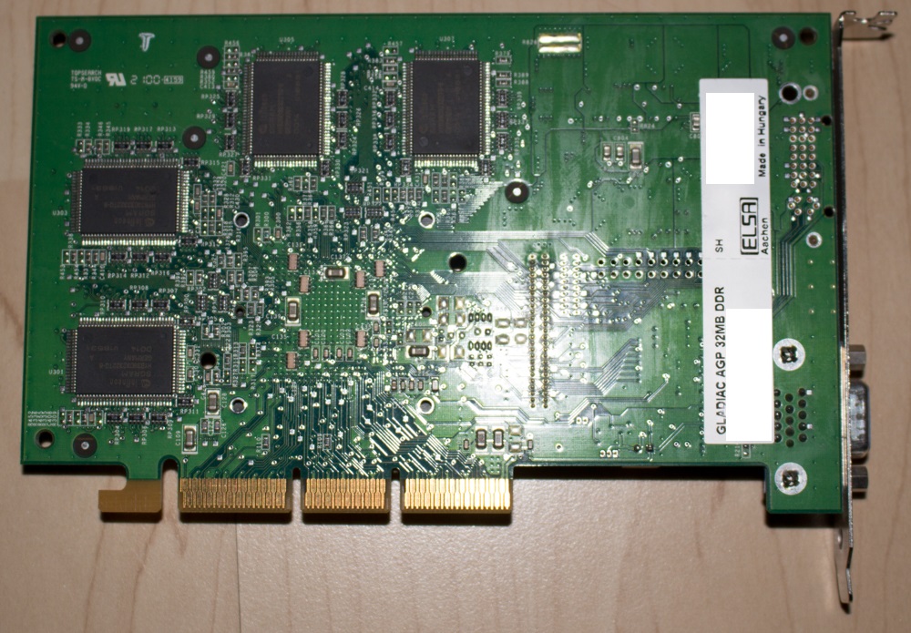 Ist offensichtlich eine AGP Karte, von nVidia - Subhersteller 'Gladiac'. 32MB RAM und 1 VGA Anschluss sind an Board, den Pins nach würde ich sagen, dass ein DVI Anschluss am Chipsatz auch möglich wäre.