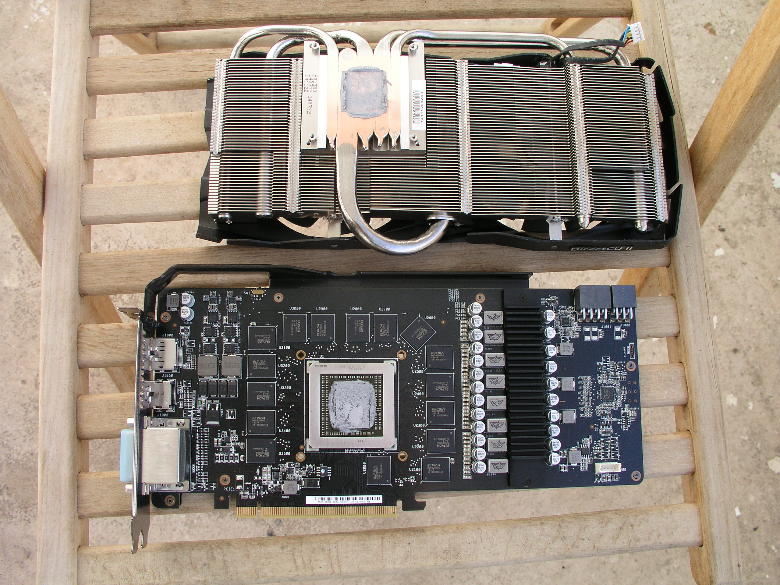Also der Kühler ist gar nicht so schlecht, die seitlichen Heatpipes kriegen ihre Wärme halt durch die Heatpipes daneben, und nicht durch den Chip selbst. Das heißt ja nicht, dass sie nutzlos sind. Die werden im Betrieb auch knallheiß. Ram-Kühler rüste ich jetzt noch nach, weil ich ja GPU-only-Wakü betreibe. Ansonsten mit dem DC2-Kühler zusammen auch nicht notwendig.