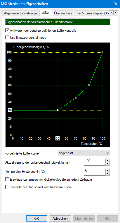 Wahlweise setzt Du die Haken in den beiden unterenen Auswahlfeldern in Deinem Bild. Was ist das eigentlich für eine gestrichelte Linie im Bild? Hab nochmal kurz nachgedacht. Das könnte die Mindestdrehzahl der Lüfter sein, wenn die erste eingestellte Triggertemeratur erreicht ist. Im BIOS der Karte wird das 50 oder 60 Grad sein. Dann laufen die Lüfter an und müssen mit 30% drehen. Das kann man meiner Meinung nach nicht manipulieren.