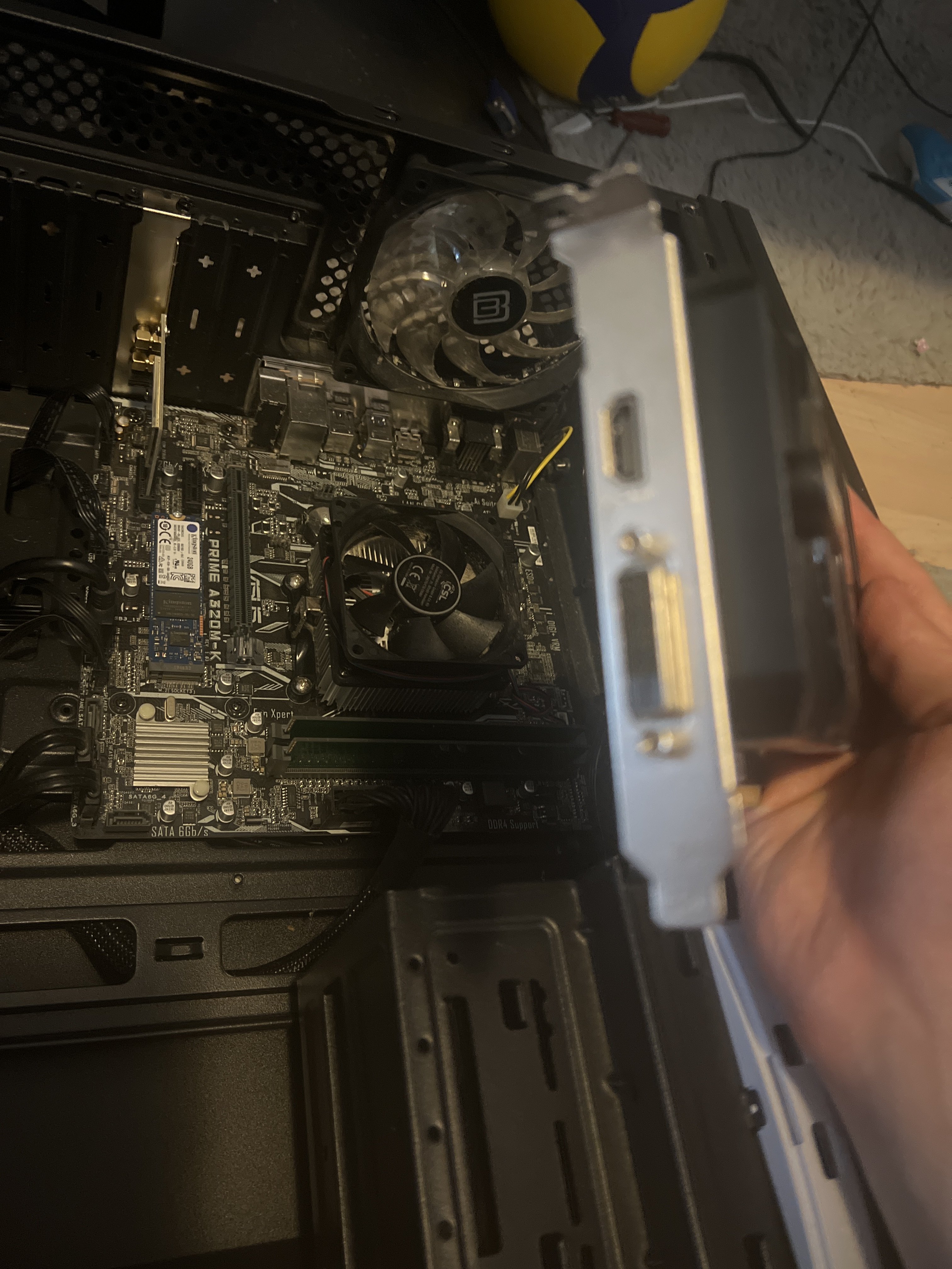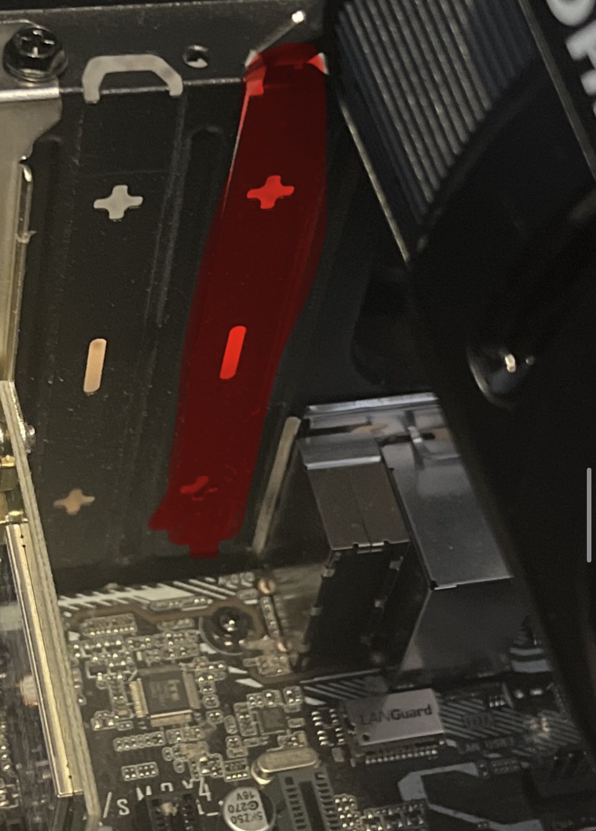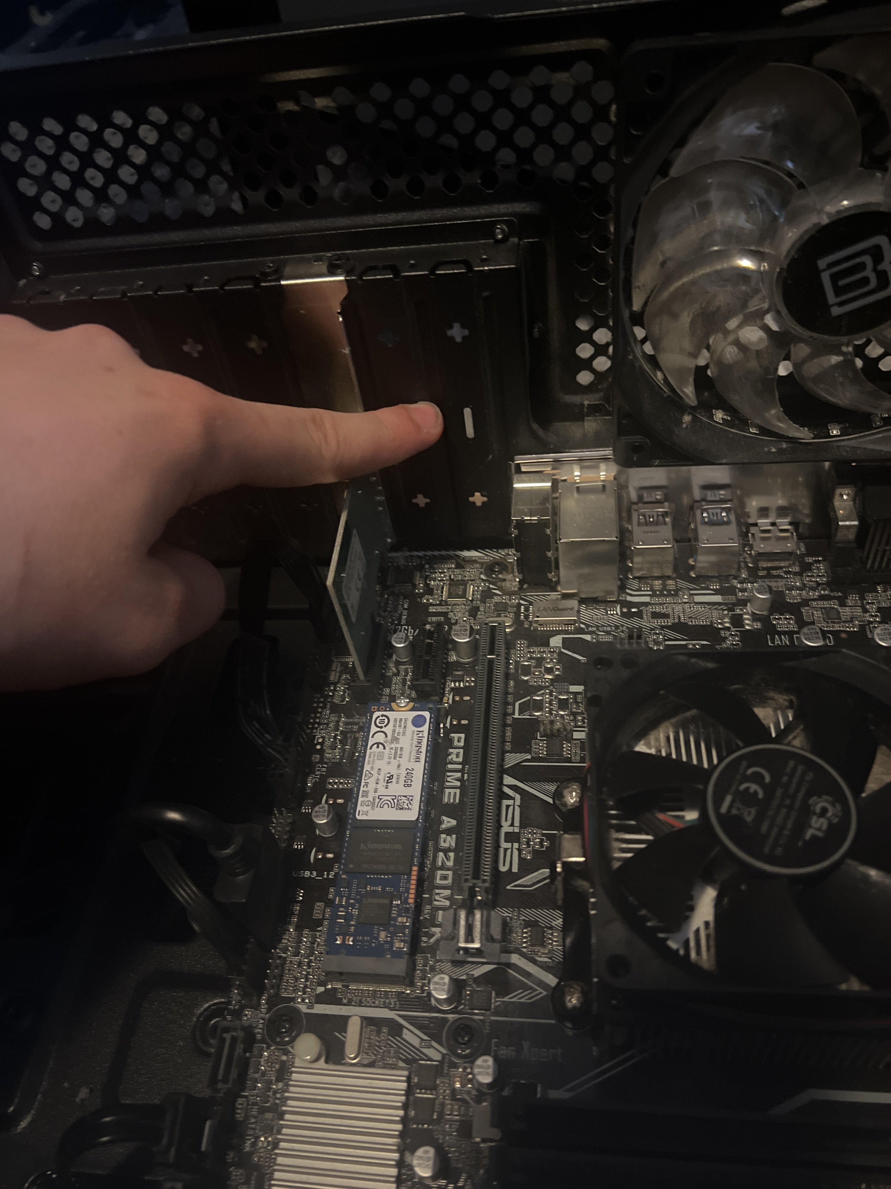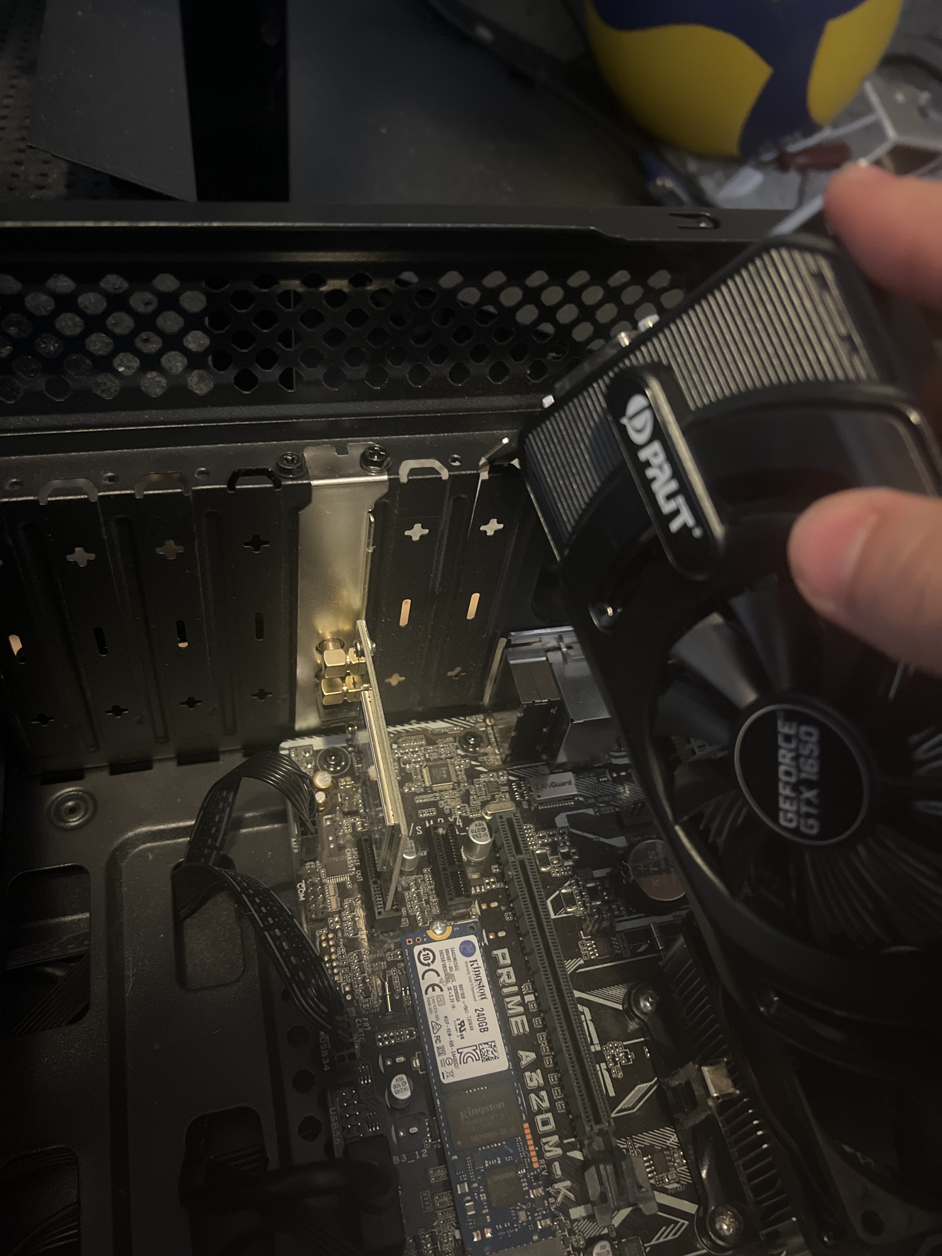 Hier ein Bild, ich will meine Neue gtx1650 einbauen, ich weiss aber nicht genau was ich abnehmen soll vielen dank.