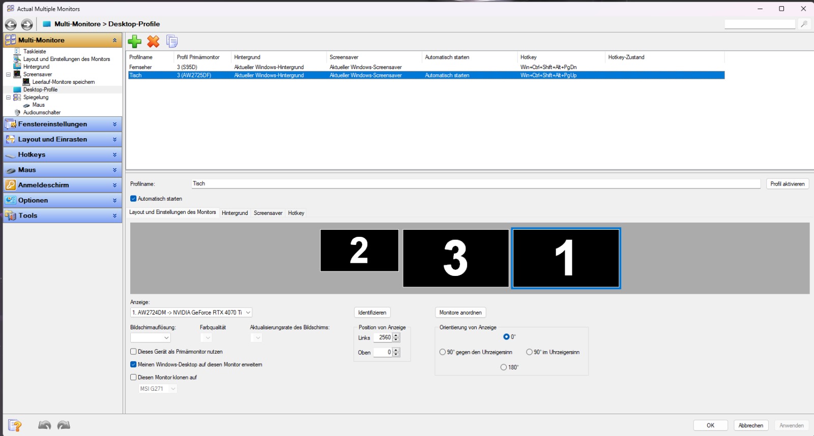 Mein Lösungsansatz an dieses Problem war nun, da ich ja nicht alle Monitore gleichzeitig betreiben muss/will, dass ich mir eine Software besorge (Actuall Multiple Monitors) und damit unterschiedliche Profile anlege, so dass nicht alle gleichzeitig Laufen müssen, jedoch kam ich da nicht ans gewünschte Ziel. Sogar noch schlimmer, mein 3. Monitor fing das Flackern an und habe da dann auch abgebrochen. Evtl. habe ich hier ja etwas Falsch gemacht, ich habe das Programm erst heute das erste mal benutzt.