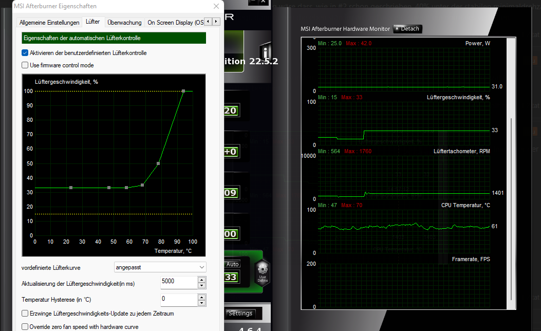 Es ist kein ernstes Problem, jedoch habe ich ein oder zwei nachfragen. Ich hatte vor längerer Zeit bei meinem alten PC schon häufiger Grafikkarten Probleme, darum überwache ich die Grafikkarte gerne mit MSI Afterburner. Normalerweise hab ich dort auch die Lüfterkurve aktiviert weil sich die Grafikkarten Lüfter sonst immer erst ab 55°C drehen.