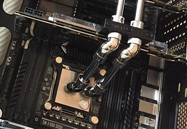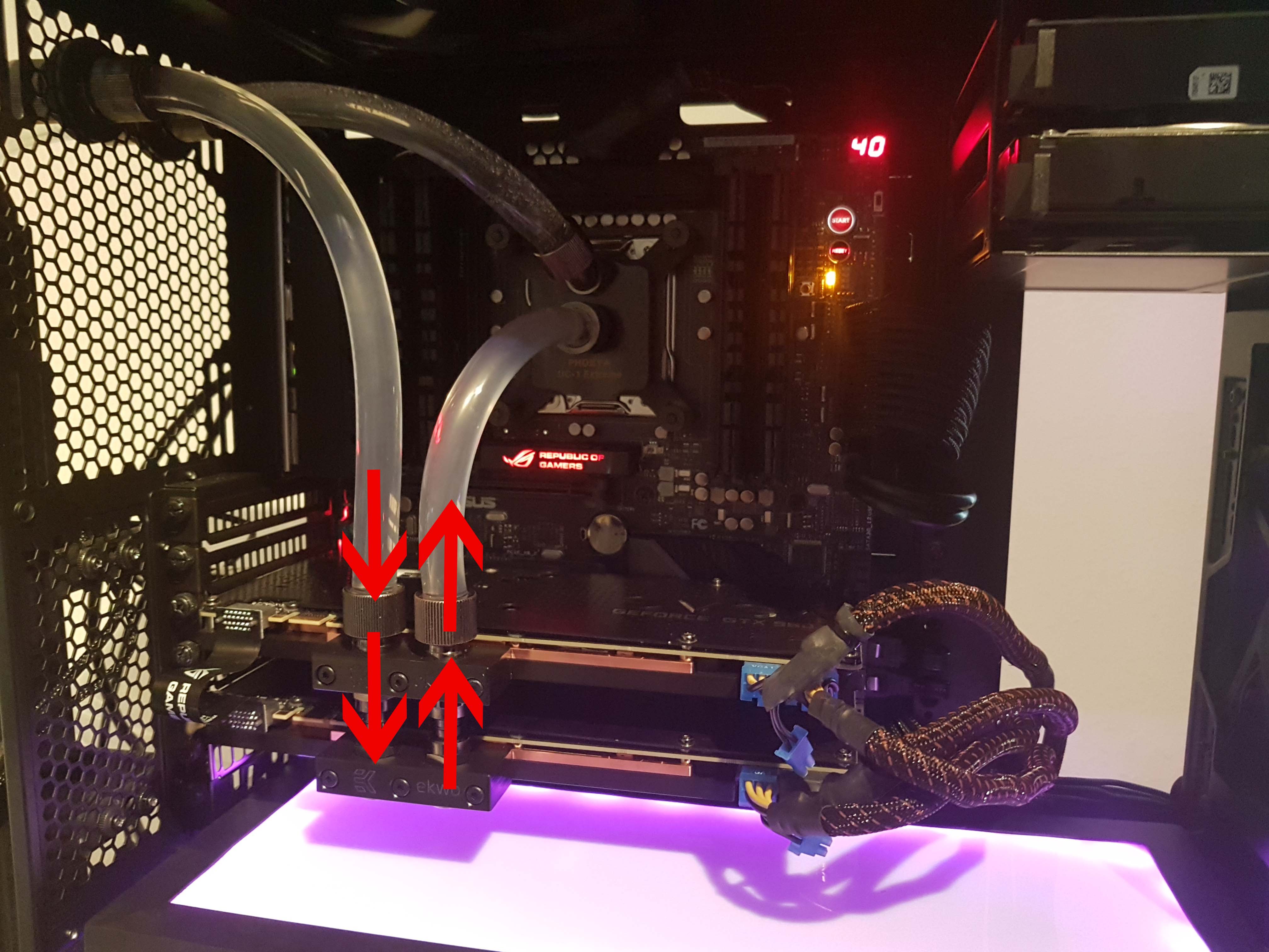 Das Waser fließt Links rein, sollte dann die erste Karte kühlen und gleichzeitig die zweite Karte bevor es dann rechts zum CPU weitergeht.
