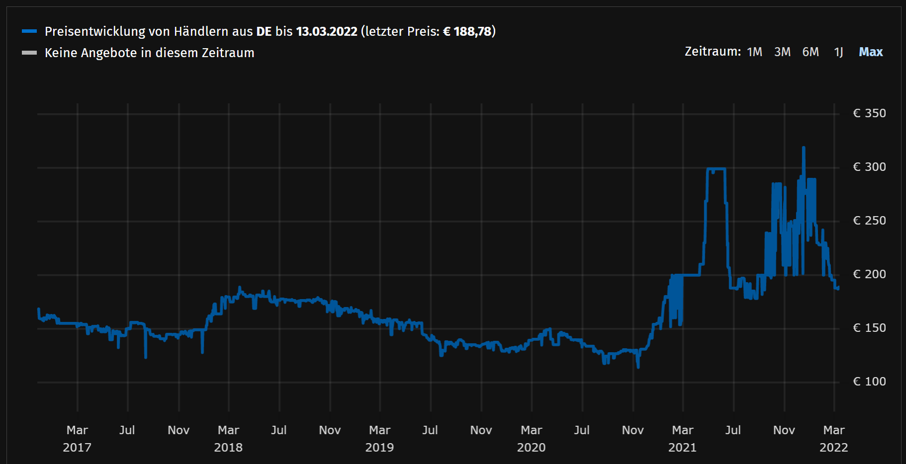 Hmm, woher die Daten nehmen, wenn nicht stehlen? ^^ Ich habe mal nach alten Modellen im Preisvergleich gesucht, gar nicht so einfach da noch was von vor Corona zu finden. Hier ein Beispiel für den Verlauf vor 2020: