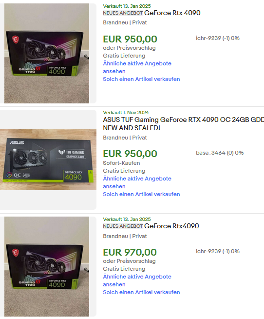ja Ausreißer gibt es immer. Sicher würde ich nicht soviel für eine alte Karte zahlen. Und wer jetzt noch neu kauft und mehr bezahlt als früher ist eh ein Trottel oder hat zuviel Geld oder einfach keine Ahnung.!Laphonso schrieb:Die 4090er stabil 1500-1800 Euro je nach Custom.