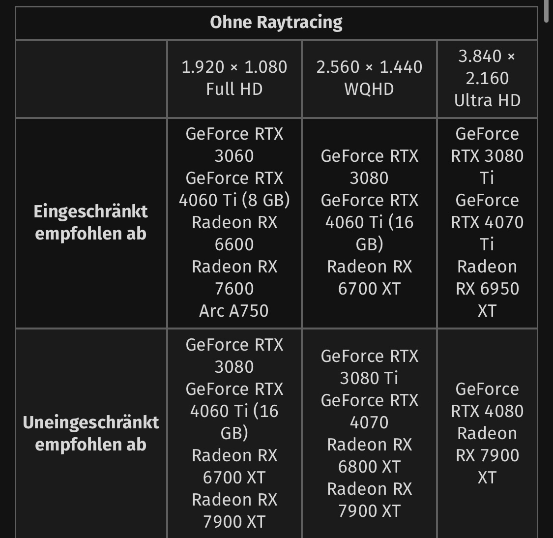Aber da geht es nicht, da sind dann 8 GB auf einmal No-Go. und 10GB das neue Minimum. Aber schlechte RT Leistung ist egal weil die kann man ja runter drehen. Schlechte Texturen No-Go eingeschränkte RT Effekte kein Problem. Sorry aber das kann man doch nicht mehr ernst nehmen.