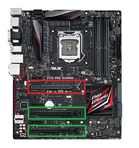 Als ich zuletzt meine Graka einbauen wollte, habe ich festgestellt, dass der obere Slot des Mainboards (rot markiert) nicht benutzt werden kann, da mein Kühler zu groß ist. (noctua nh-u14s) Gerne würde ich eine der beiden grün markierten nehmen, doch hier habe ich bei näherem betrachten festgetellt, dass dort weniger goldene platinen im inneren vorhanden sind.