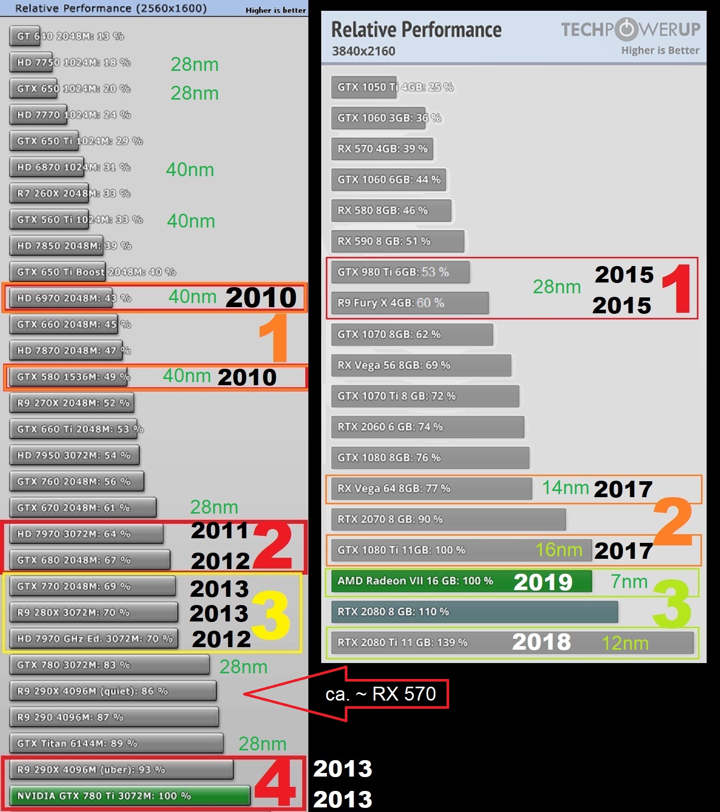 Um die Karten der letzten 10 Jahre besser in ein Verhältnis setzen zu können habe ich ein Schaubild angefertigt, dass zeigt, dass eine RX 570 ca. 83% schneller sein wird als die HD 7870 des TE.