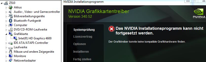 Egal ob ich den Grafikkarten Treiber von Nvidia manuell über den Gerätemanager oder automatisch über die Software ausführe, erhalte ich die Meldung das die Hardware nicht erkannt wird.