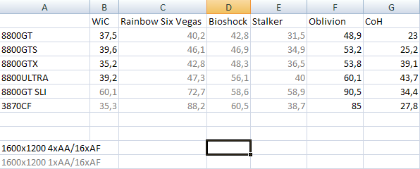 Im Anhang habe ich die Benchmarks von World in Conflict, Reinbox Six Vegas, Bioshock, Stalker, Oblivion und CoH für 1600x1200 4xAA/16xAF zusammen gefasst: