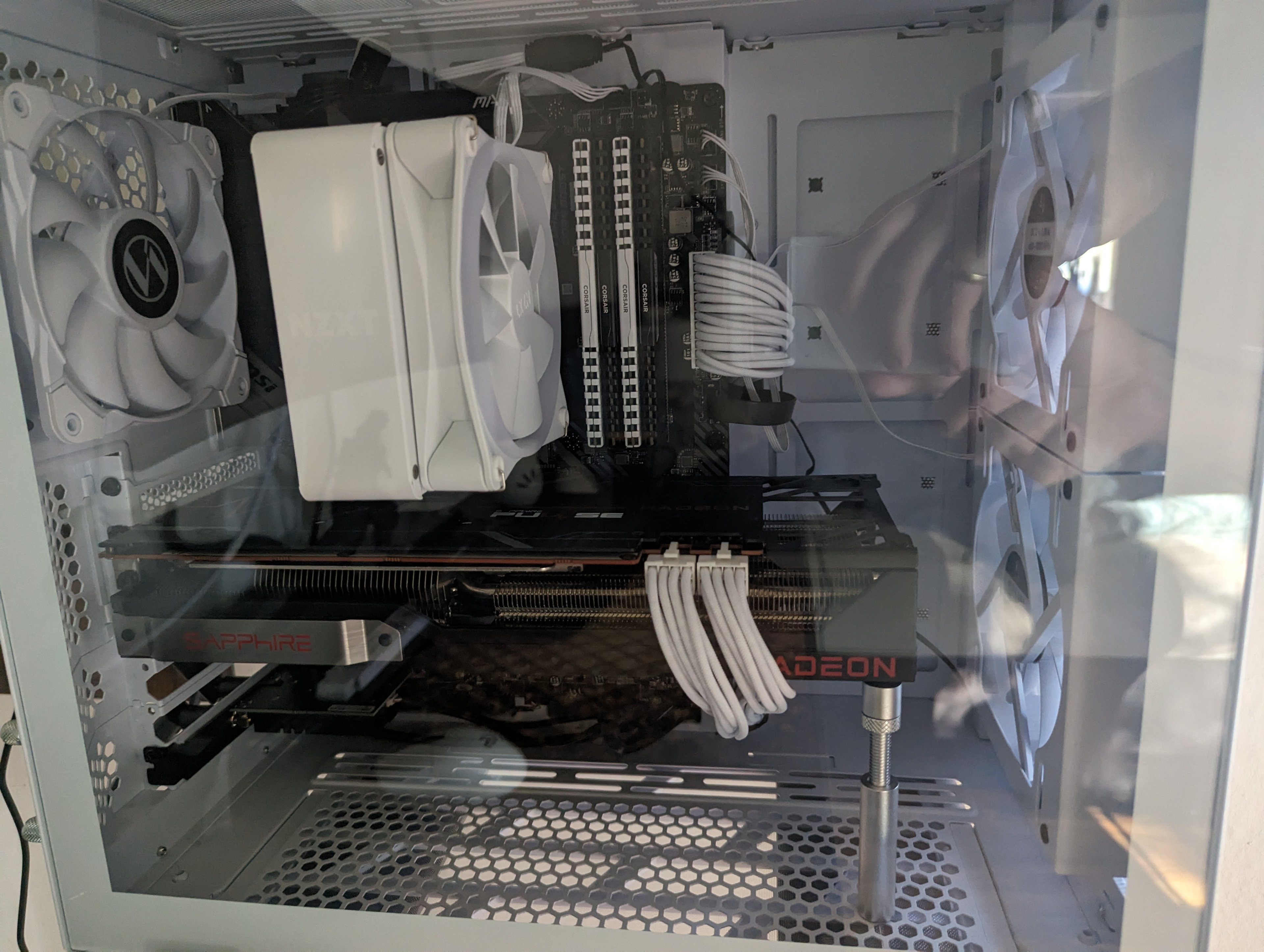 Desweiteren ist die Abdeckung des Mainboards mit dem Tomahawk Schriftzug etwa 1 bis 1,5mm zu hoch, sodass die Karte nicht vollends in den Slot gedrückt werden kann und etwas Nachhilfe benötigt. Ich habe das durch die leichte Schrägstellung des Grafikkartenhalters gelöst. Dieser übt nun ein wenig Druck aus, sodass das Problem vorerst beseitigt ist. Auf Dauer ist das aber natürlich auch keine Lösung.