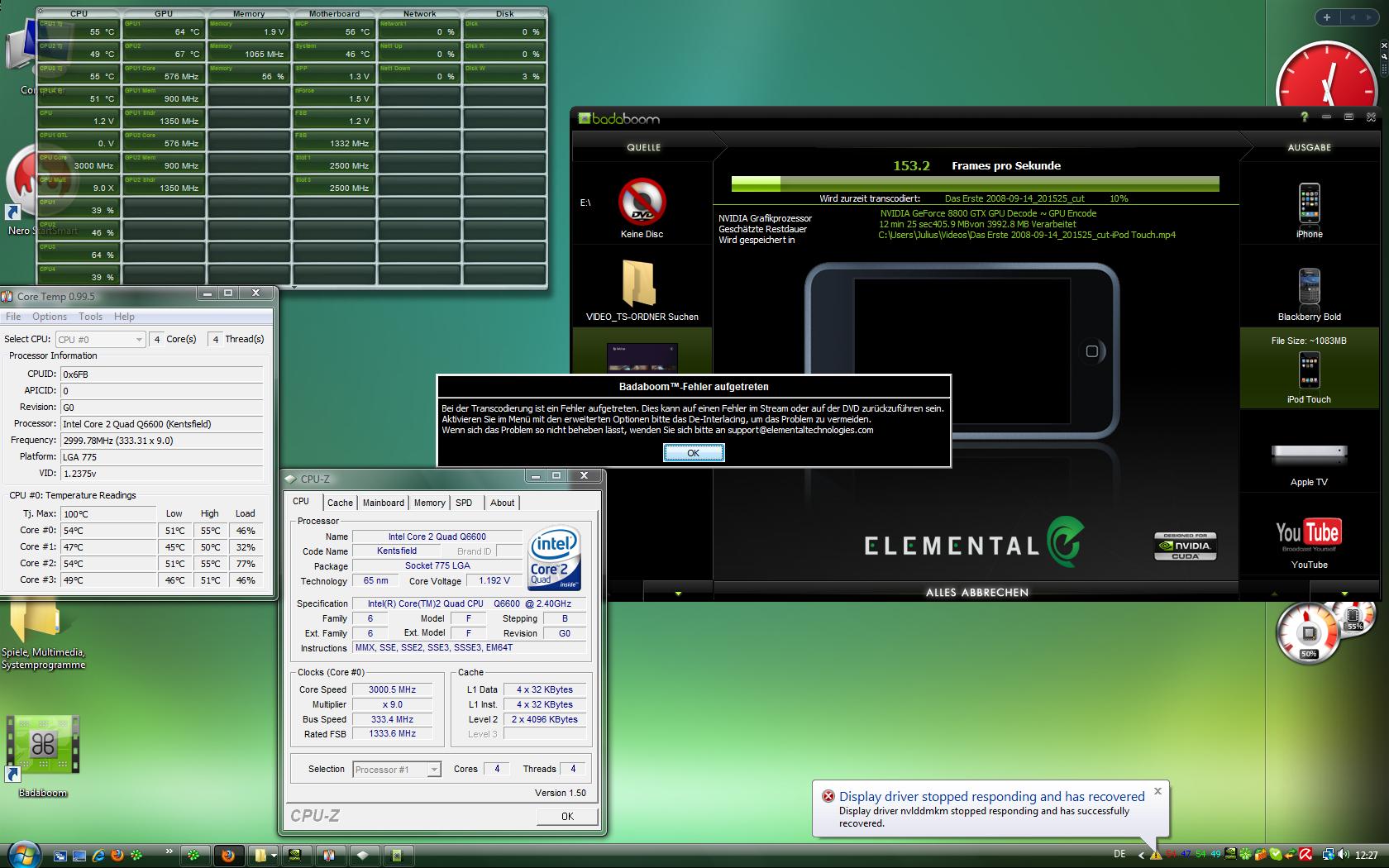 Schwarzer Bildschirm und nach grob geschätzt 5 Sekunden, erscheint wieder der normale Desktop, und unten rechts in der Taskleiste erscheint eine Systemnachricht à la: NVidia Grafikkartentreiber reagiert nicht mehr und musste neugestartet werden. Dies unterbricht aber die Konvertierung des Videos, was ziemlich nervig ist, da das Video so nicht zu Ende konvertiert wird.