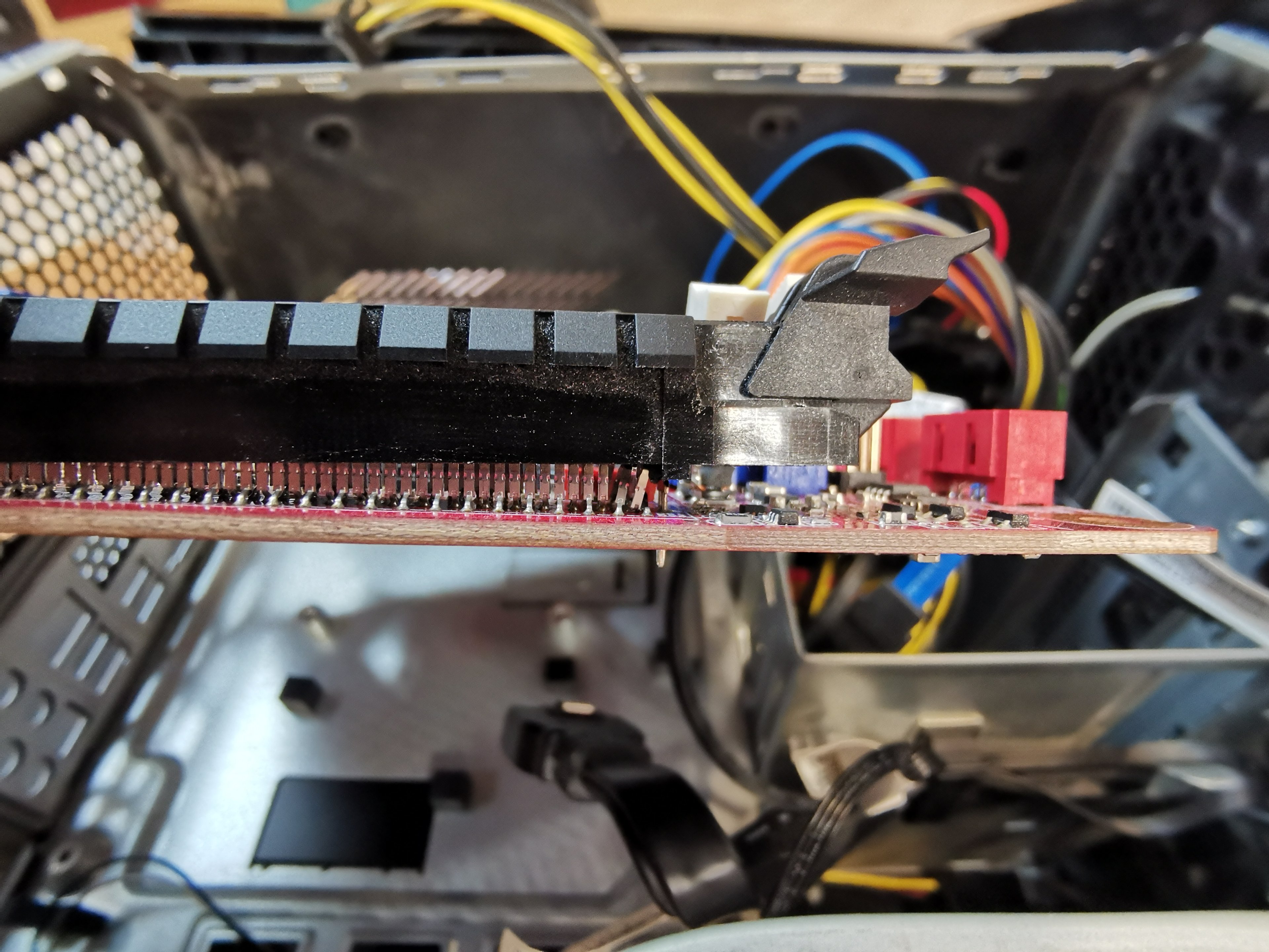 Ich könnte auch versuchen die andere Seite der Plastikhalterung zu lösen, indem ich das Verlötete auf der Rückseite mit einer Zange quetsche oder mit einem Lötkolben löse (noch nie gemacht aber wir haben eins), und somit hoffentlich nach oben schieben kann, aber ich habe bisher weder vom Löten noch von PCIe Slots eine Ahnung und vor allem ist es fraglich, ob ich die Pins dann wieder an Ihren Platz bekomme, zumal diese ja verbogen sind. Im Endeffekt mach ich es damit wahrscheinlich einfach nur komplett kaputt? Wäre aber zumindest die günstigste Möglichkeit wenn es klappen würde...