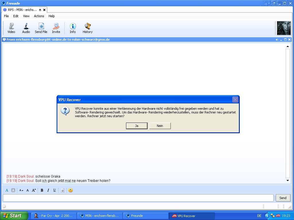 Also ich hab ein merkwürdiges Problem mit meiner Graka, erst dachte ich es läge am neuen offiziellen ATI Treiber, also meine Graka freezt bei anspruchsvollen Spielen, also mit guter Grafik, manchmal, bei WOW läuft alles fast immer ohne Probleme, aber auch da hab ich das in bestimmten Gebieten, in Far Cry ists ganz schlimm. Mit original Treiber gibts Freeze und VPU Recover wurde zurückgesetzt, irgendwann dann Graka verklemmung konnte nicht gelöst werden Hardwareredndering wurde deaktiviert oder so ähnlich (für genaue Fehlermeldung, siehe Anhang) Beim Omega Treiber gibts auch die Freezes aber da kommt keine Fehlermeldung danach und das Game läuft danach einfach weiter. Auf jeden Fall stört das wenn man mittem im Gefecht auf einmal nichts machen kann und wenn alles wieder geht ist man tot. Als Server ist das natürlich noch besonders scheisse weil bei den Freezes fliegen alle vom Server. Die Graka ist nicht übertaktet oder sonst was.