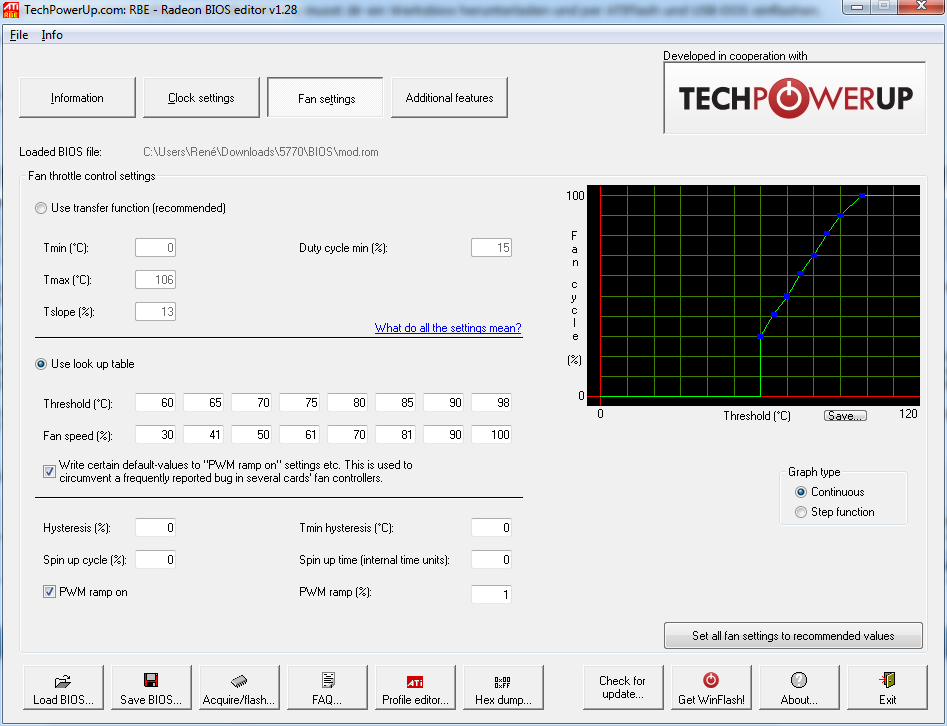 Nachdem ich in die Aktion schon einige Zeit gesteckt hatte, wollte ich mit Hilfe des Radeon Bios Editors zumindest etwas an der Lüfterdrehzahl ändern -> BIOS geladen, das ganze auf 'User look up table" gestellt, die Werte übernommen, weil die sich ganz gut angehört haben und erneut geflasht -> Resultat: keine Veränderung^^