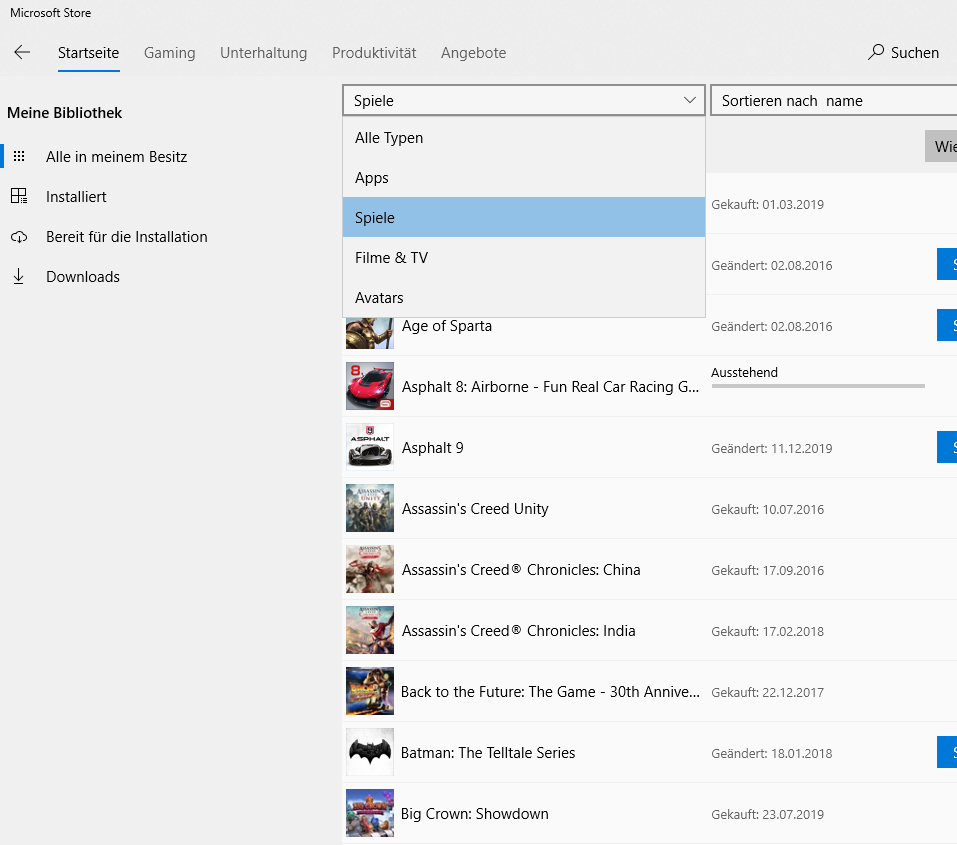 Denkste! In einer Gesamtliste sind alle Käufe/Abospiele (egal ob Xbox 360, Xbox One, UWP-Apps oder x86-Spiele) durcheinandergewürfelt, lediglich die "Nicht-Spiele-Apps" und Einzel-DLCs kann man wegfiltern: