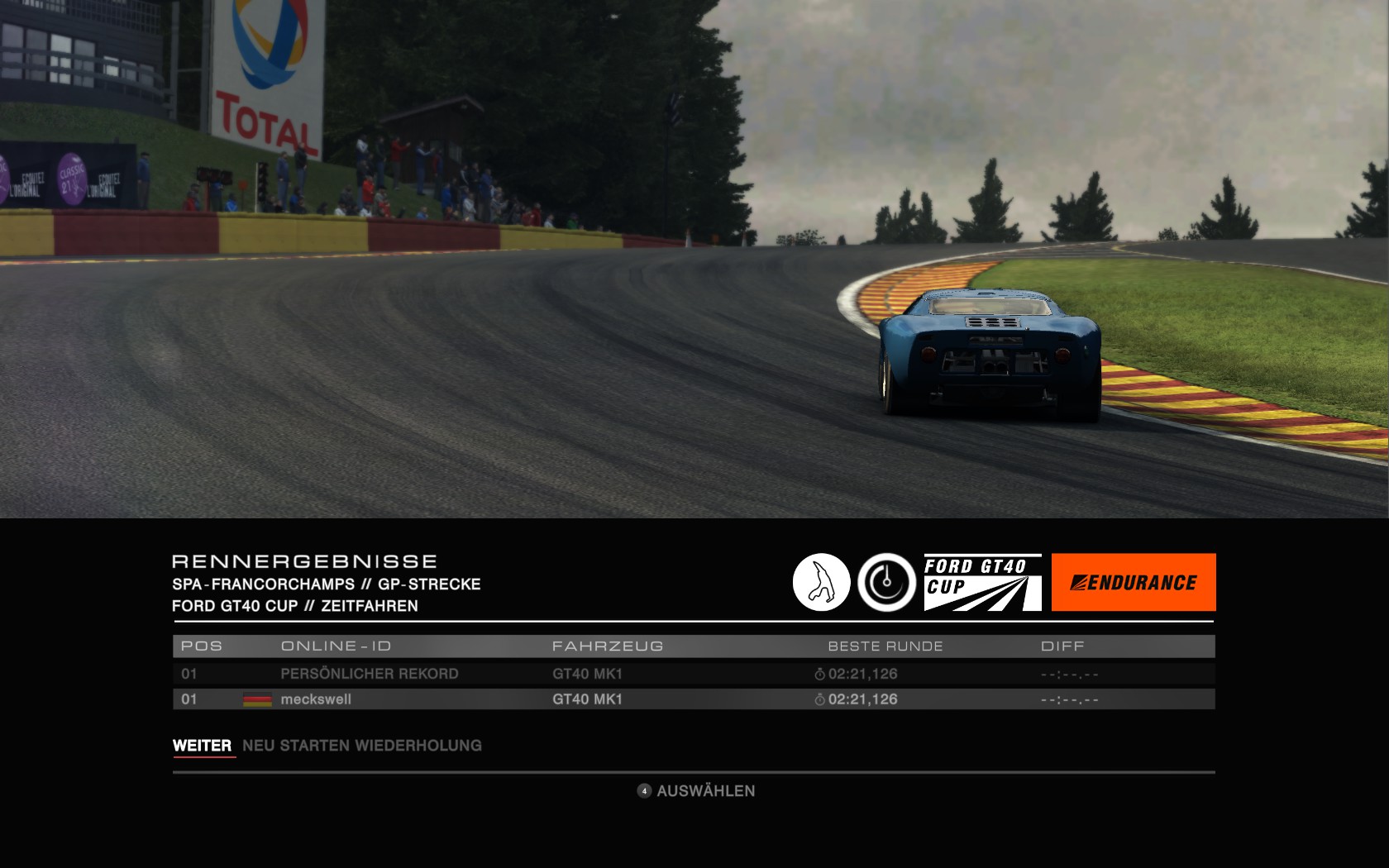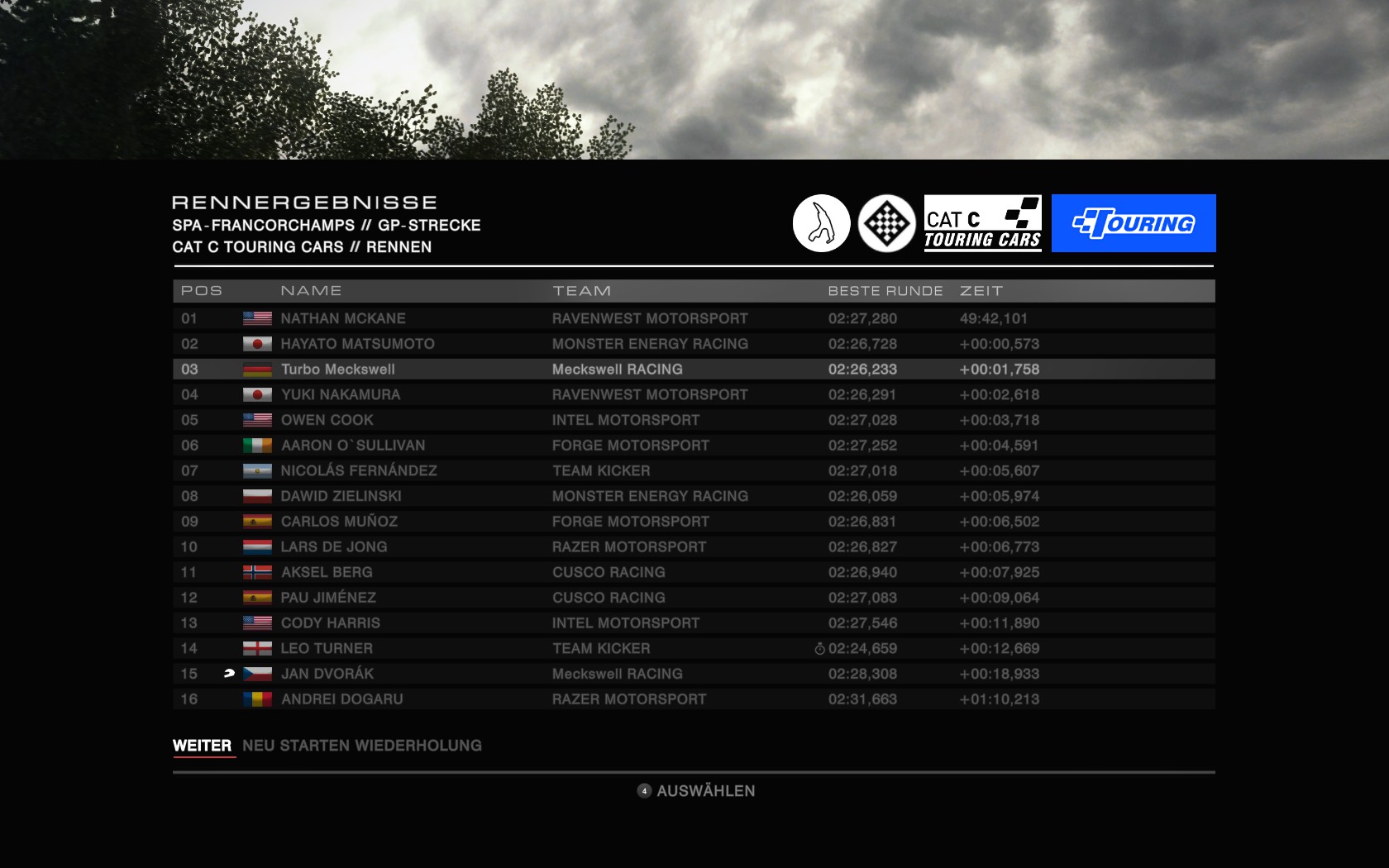 Ich habe mal ein längeres Rennen probiert, Tourenwagen Cat. C in Spa - GP Strecke 20 Runden. KI auf sehr schwer, ohne Training und Quali. Hatte dann Startplatz 4 wurde aber durchgereicht bis auf 12.