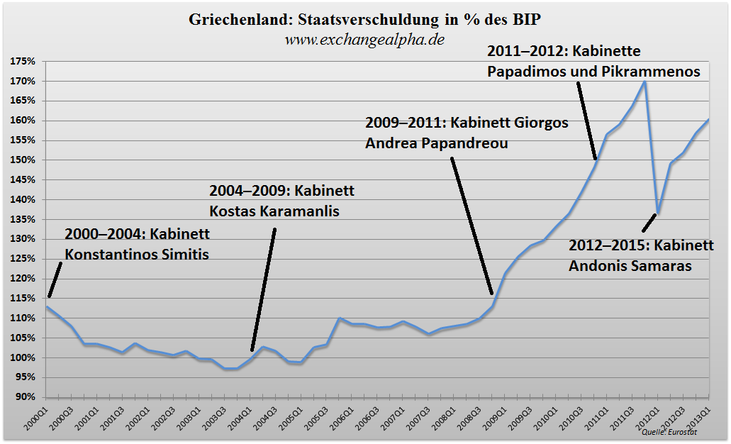 Gleichzeitig legt man ein Programm auf, dass Griechenland auf die Beine helfen soll. 5 Jahre später stellt man fest, dass 1. die dem Programm zu Grunde liegenden Prognosen hoffnungslos zu optimistisch waren und dass die Auswirkungen der Sparmaßnahmen auf die Produktion grob unterschätzt wurden und 2. dass die Regierungen, die das Unheil in der Vergangenheit angerichtet haben, nicht unbedingt die richtigen sind, den Karren aus dem Dreck zu ziehen (Stichwort: Lagarde-Liste).