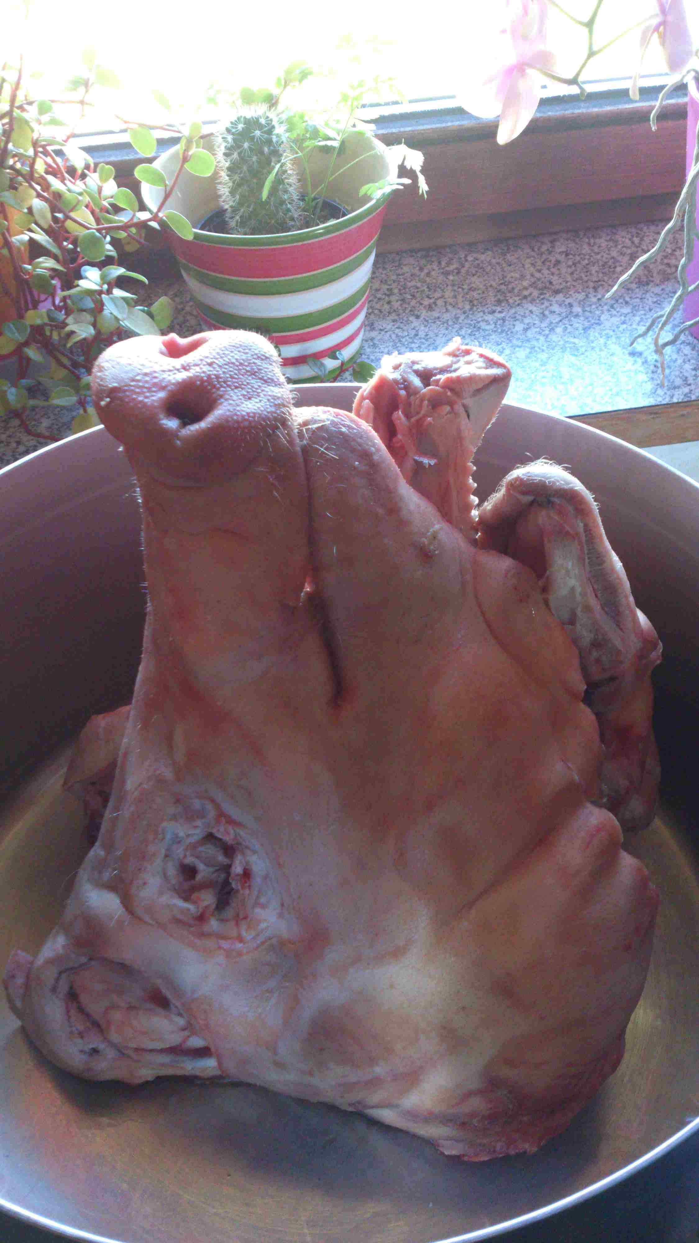 Ich hab am Wochenende endlich meinen Schweinskopf gekocht. War echt nicht schlecht. Die Reste wurden dann zu Sulz verarbeitet.