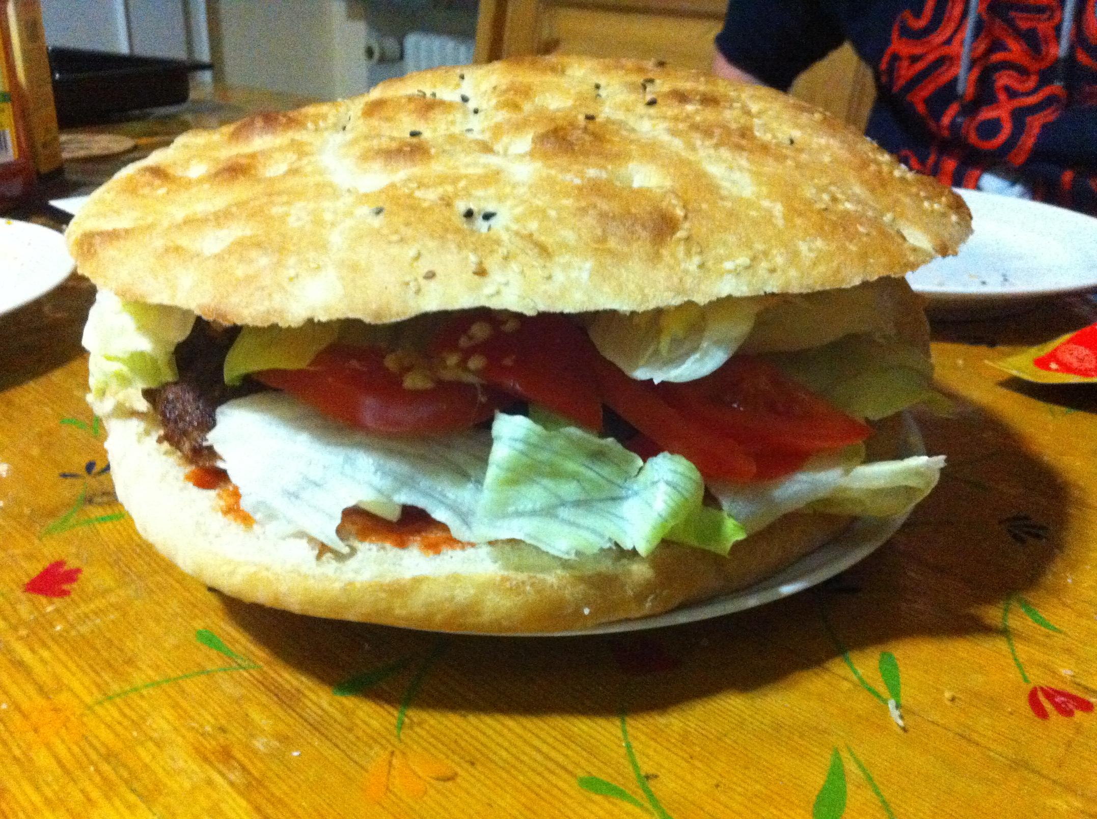 Einmal den Austriaburger mit Rinderhack, Feldsalat, Tomate, Tiroler Speck und Bergkäse auf Vinschgauern. Und als Sauce ne Vinaigrette (Senf, Öl, Balsamico, Brühe, Salz, Zucker, Pfeffer) und Bozner-Sauce (gekochtes Eigelb, Ölivenöl, Brühe, Senf, Pfeffer, Salz und etwas Eiweiiß - eventuell Meerettich, Schnitlauch und Petersilie dazu). Leider gibt es keine Vinschgauer bei uns im Harz, daher haben wir Weizen- oder Roggenbrötchen genommen, weiß ich nicht mehr genau.