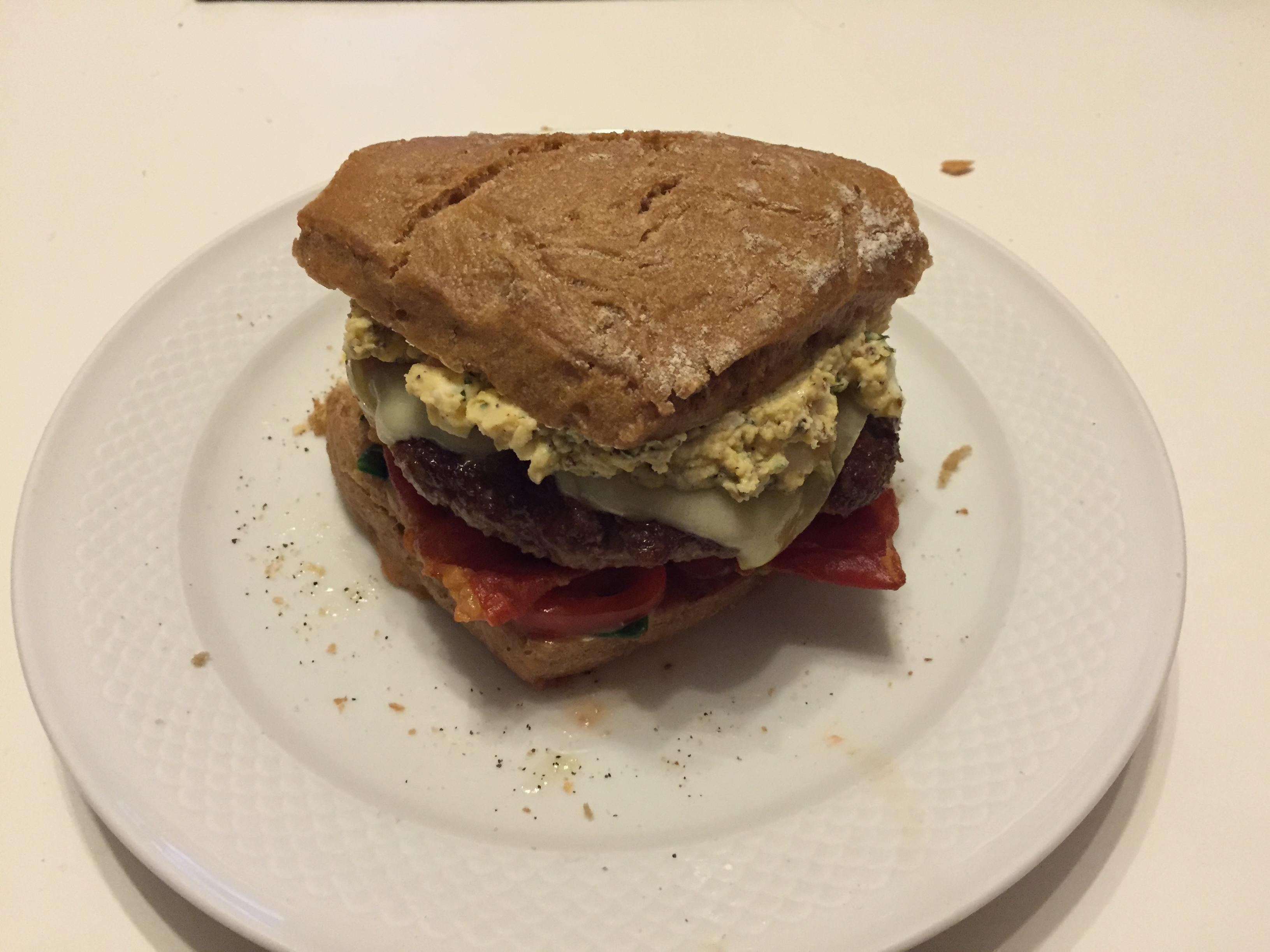 Und zu guter Letzt den Bronsonburger mit Rindfleisch, Prosciutto, Cheddar, Röstzwiebeln, frittiertem Hähnchen und sautierten Shitake-Pilzen mit Knobi und roten Zwiebeln. Die Sauce wurde aus Knobi, Dill, Pfeffer, Salz und Mayo gemacht.
