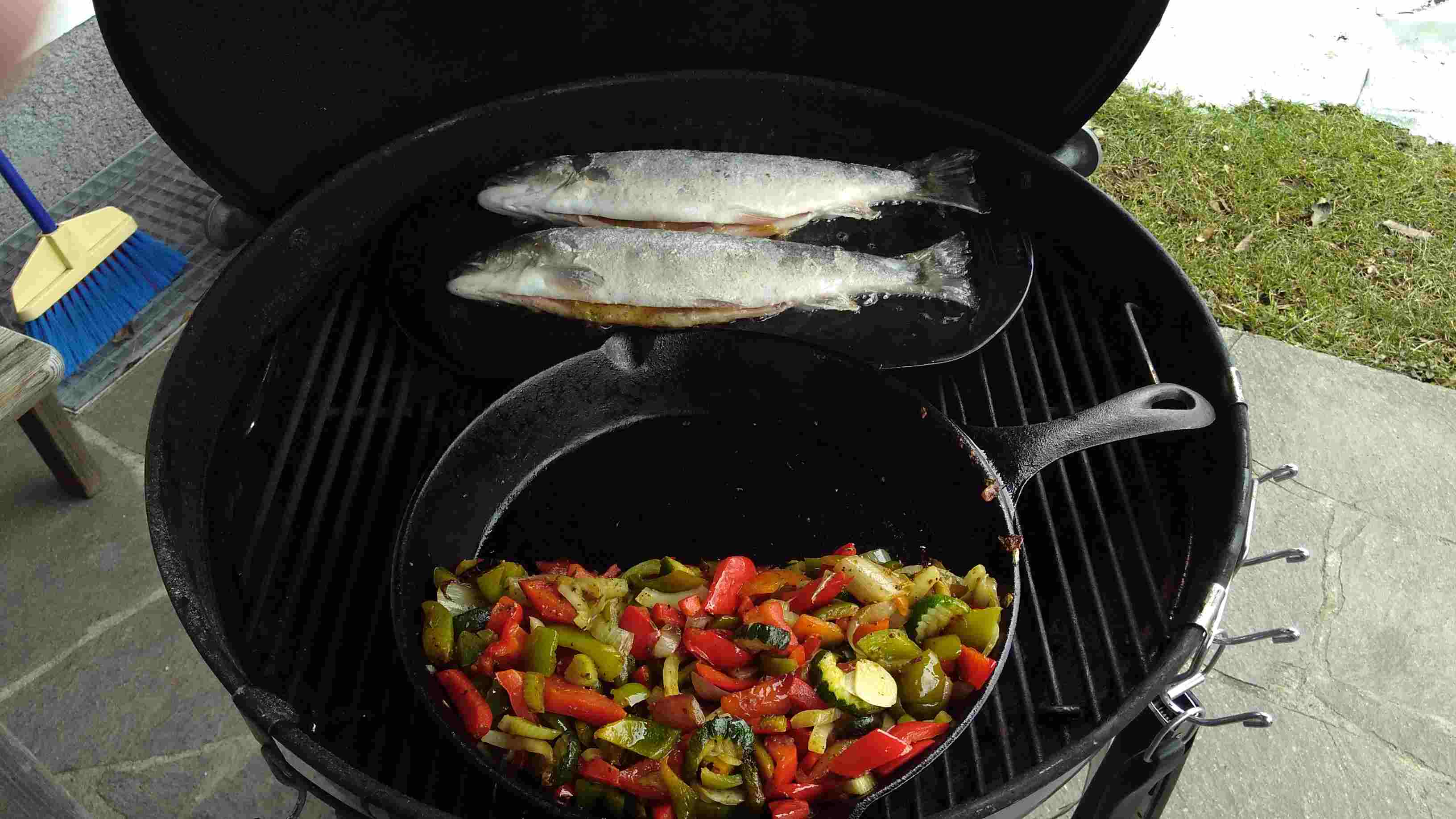 Hab am Sonntag mal wieder Saiblinge auf dem Grill gemacht. Schön mehliert und dann in der Keramikform angebraten. Die Haut war extrem knusprig. Sehr lecker. Die Fische sind von einer befreundeten Bekanntschaft aus einer Region wo es massenhaft TEiche gibt. Gefüttert werden sie mit normalen Pellets und Brot vom Bäcker (Altbacken nennt man das glaube ich).