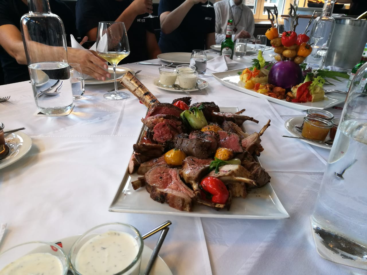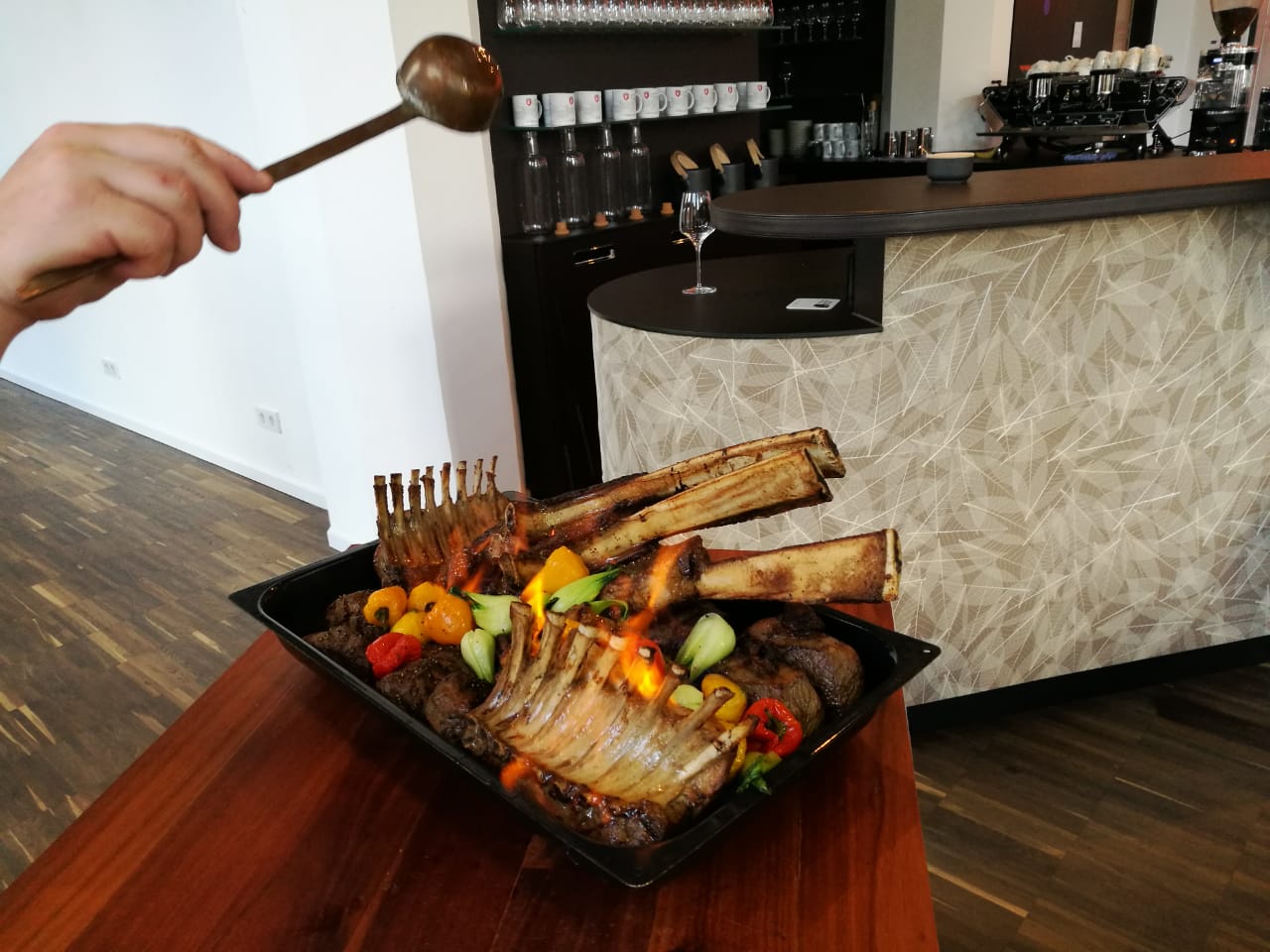 Hatten aufer Arbeit am Mittwoch noch geschäftlichen Besuch mit dem wir das ein oder andere Kaltgetränk verköstigt(vernichtet) haben und dazu hat unser Koch Tomahawk Steaks und Lamm gegrillt und dann vor unseren Augen zubereitet und flambiert. Das war schon ziemlich geil