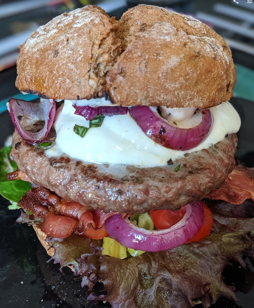 Ich habe letztens einen Burger "kreiert" und ihn "The Italian" getauft. Selbstgemachte Patties (überbacken mit Mozzarella), eine relativ weiches Ciabattabrötchen, bestrichen mit Tomaten- Basilikumsauce, belegt mit Ruccola, dann das Pattie mit dem Käse und oben drauf rote Zwiebeln, ein wenig Ketchup und eine gegrillte Scheibe Prosciutto Cotto (mit Fettrand). Fanden alle total geil.