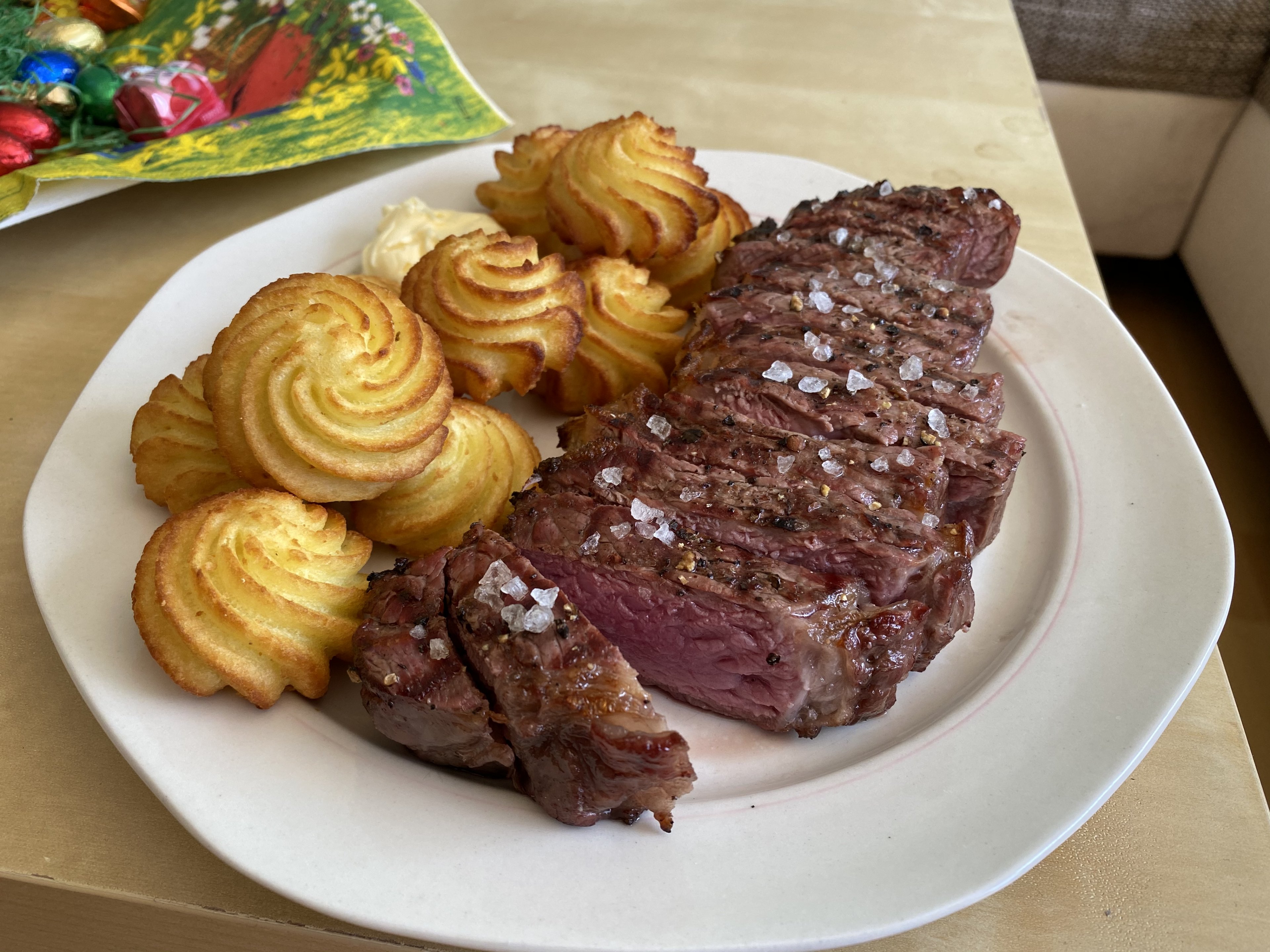 Gab dann mal in der Mittagspause nen schönes Steak mit Kroketten und Kräuterbutter, Homeoffice sei dank