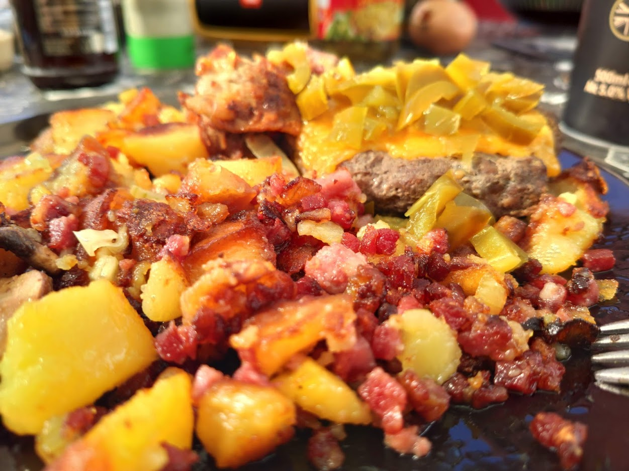 Um den Bogen zum Grillen zu bekommen, es ist einfach eine Tatsache, das der Grill ne Reinigung an der einen Seite braucht, wenn man in der Eisenpfanne Bratkartoffeln macht