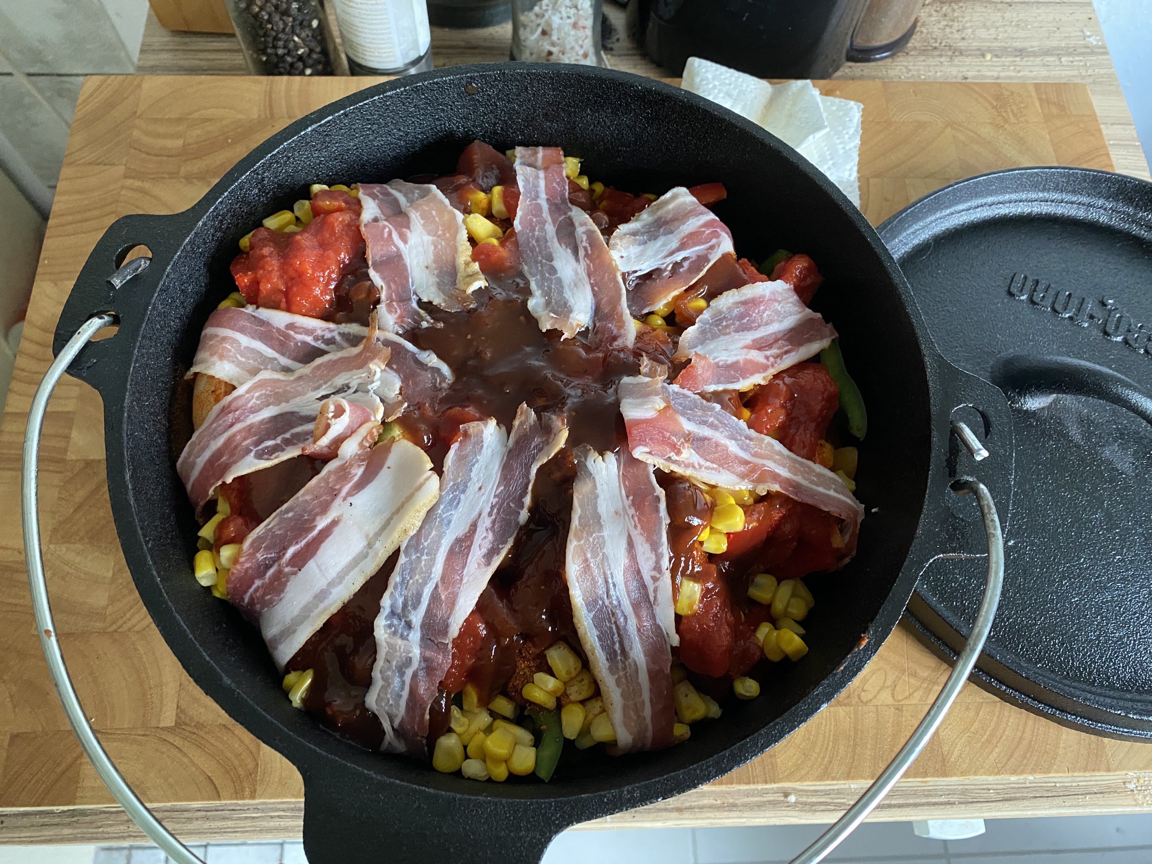 Nix wildes, hatten Freitag Pizza gemacht, da hatte ich noch bisschen Tomatensauce und Mais über, daraufhin habe ich entschieden es gibt mit einem Teil des Nackens einfaches Schichtfleisch aus dem 3,5er Dutch Oven.