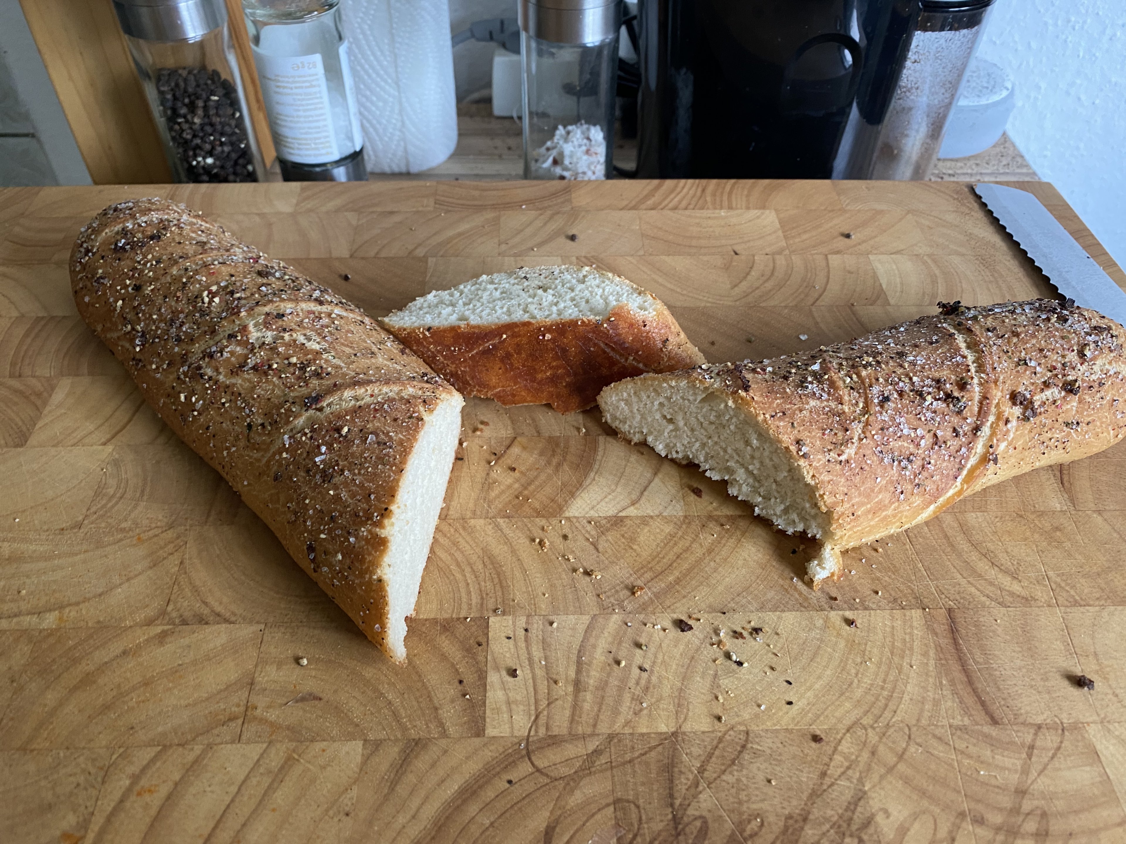 Das Baguette war ein Prototyp, das zweite ist noch in Teigform im Kühlschrank und wird morgen gemacht.