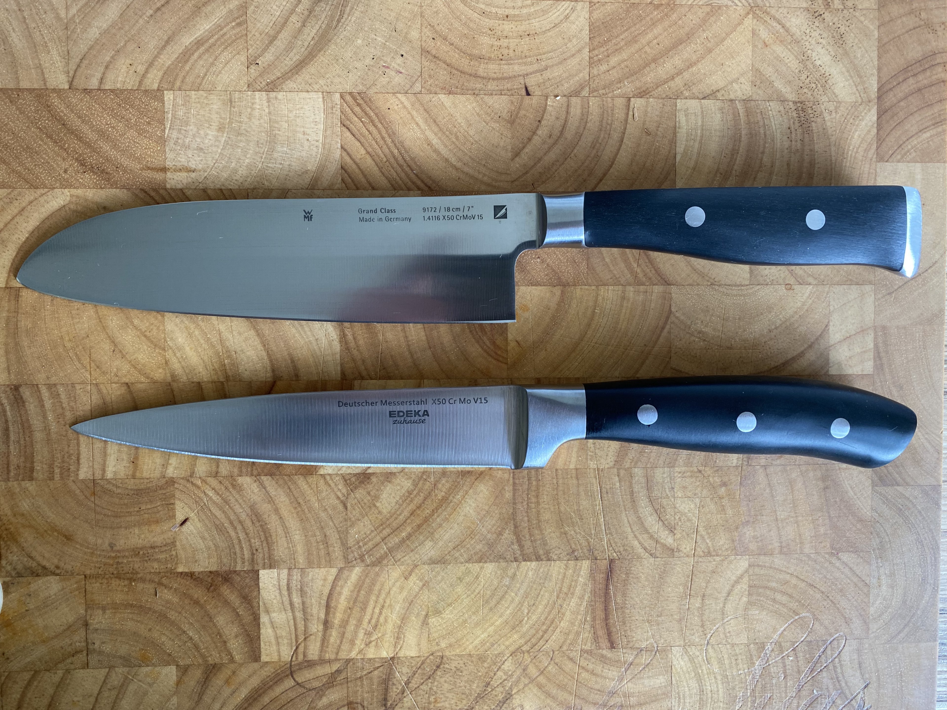Wovon ich übrigens positiv überrascht war/bin, ich hab gestern beim Fleisch kaufen direkt noch ein "Fleischmesser" vom Edeka mitgenommen, das hat ganze 10€ gekostet und ich habe echt keine großen Erwartungen gehabt aber das Ding ist sau scharf, sogar ein bisschen schärfer als mein WMF Santoku und das hat das 9 Fache gekostet.