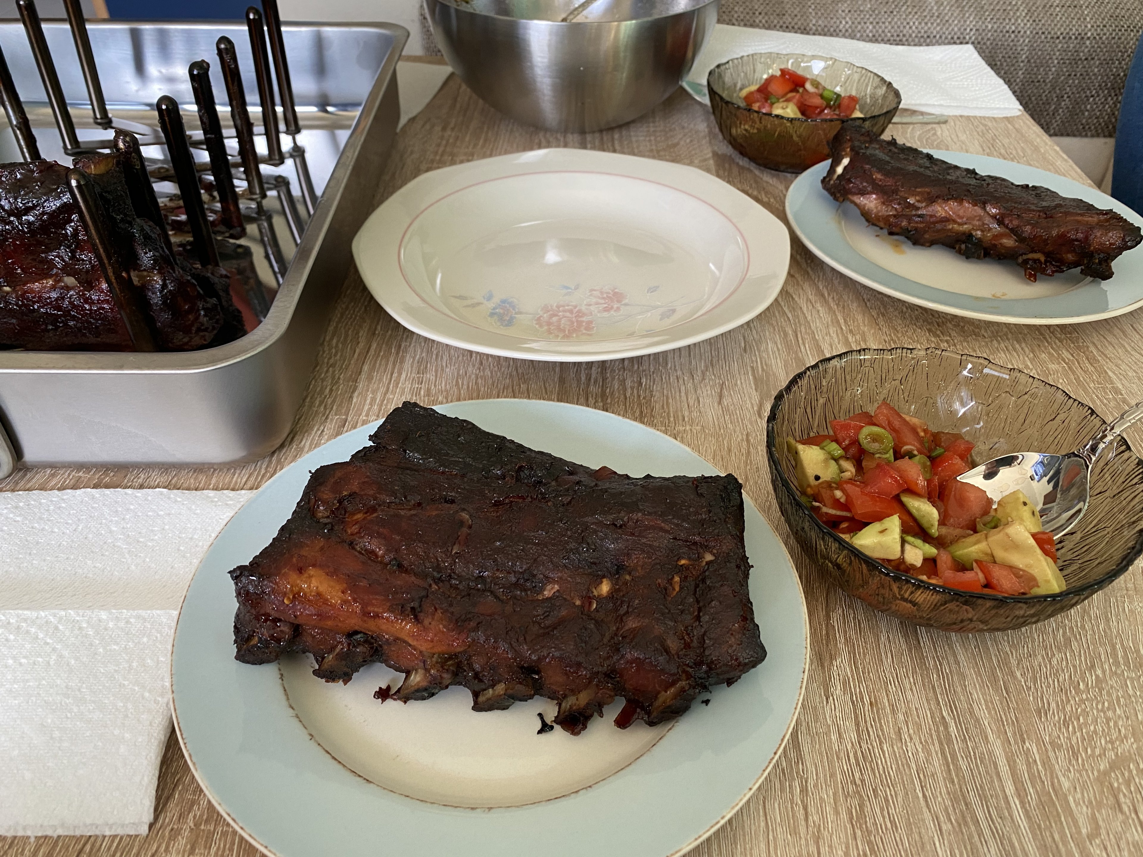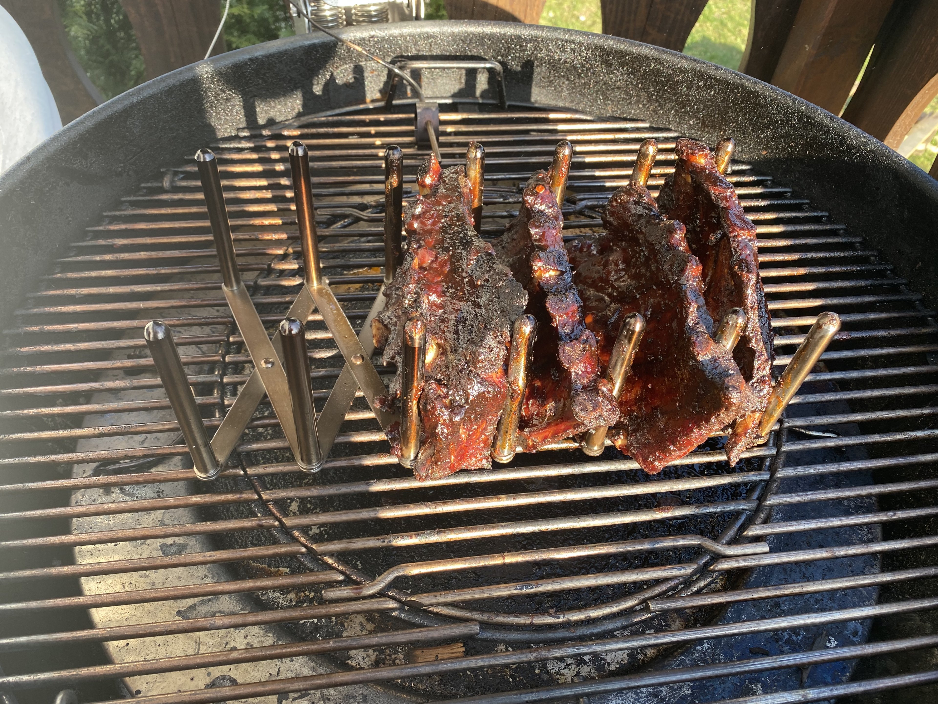 Ne, hab 3-2-1 gemacht, in den ersten 3 Stunden smoken hatte ich kein extra Wasser mit drinnen, werd ich evtl beim nächsten mal machen. Das kann man ganz gut in die deflector Platte von der Weber Kugel kippen, aber 3 Stunden wird das nicht halten