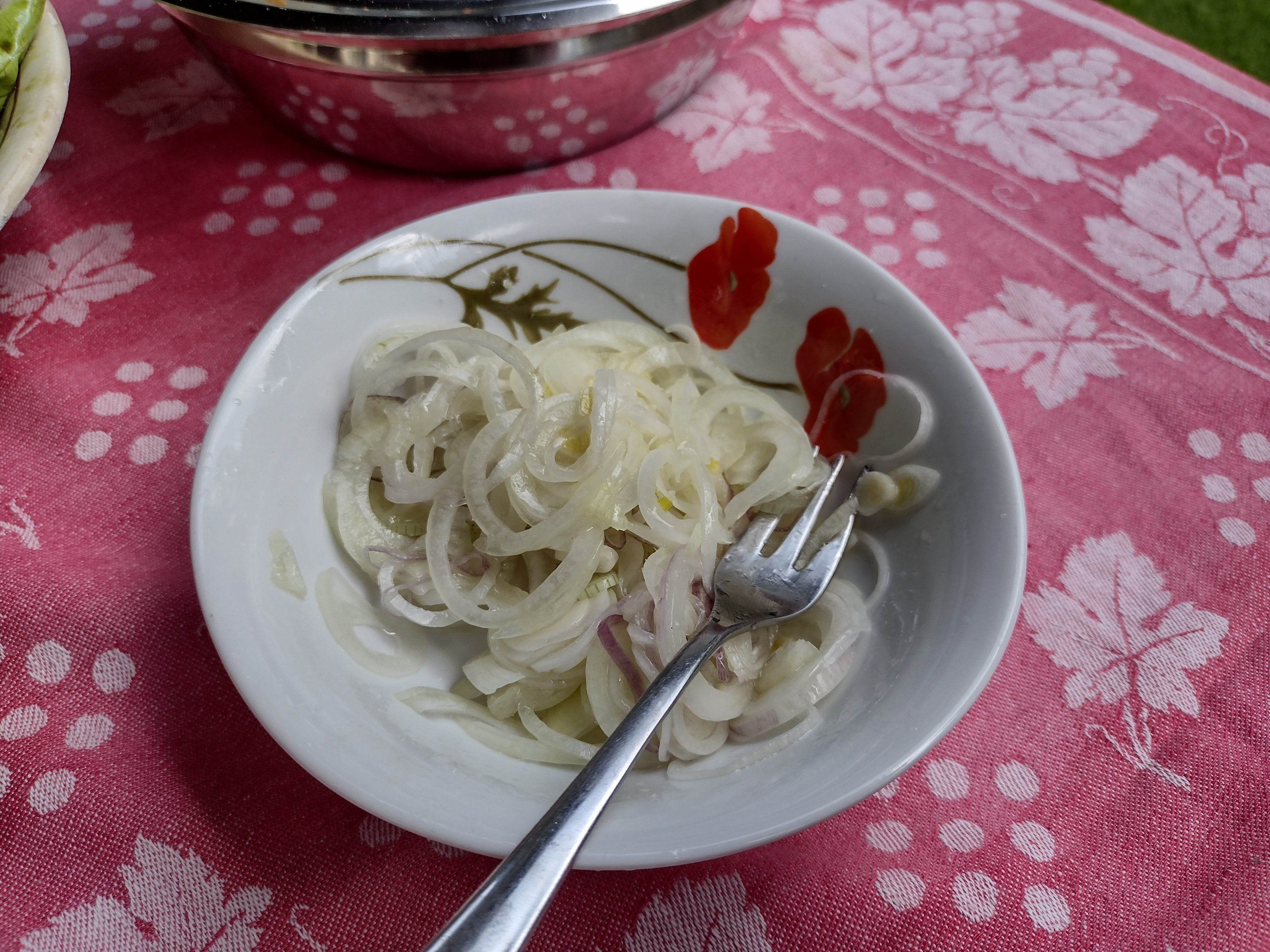 Zwiebelsalat: dünne geschnittene Ringe vom Zwiebel mit Öl und Salz (mit den Fingern etwas durchmischen)