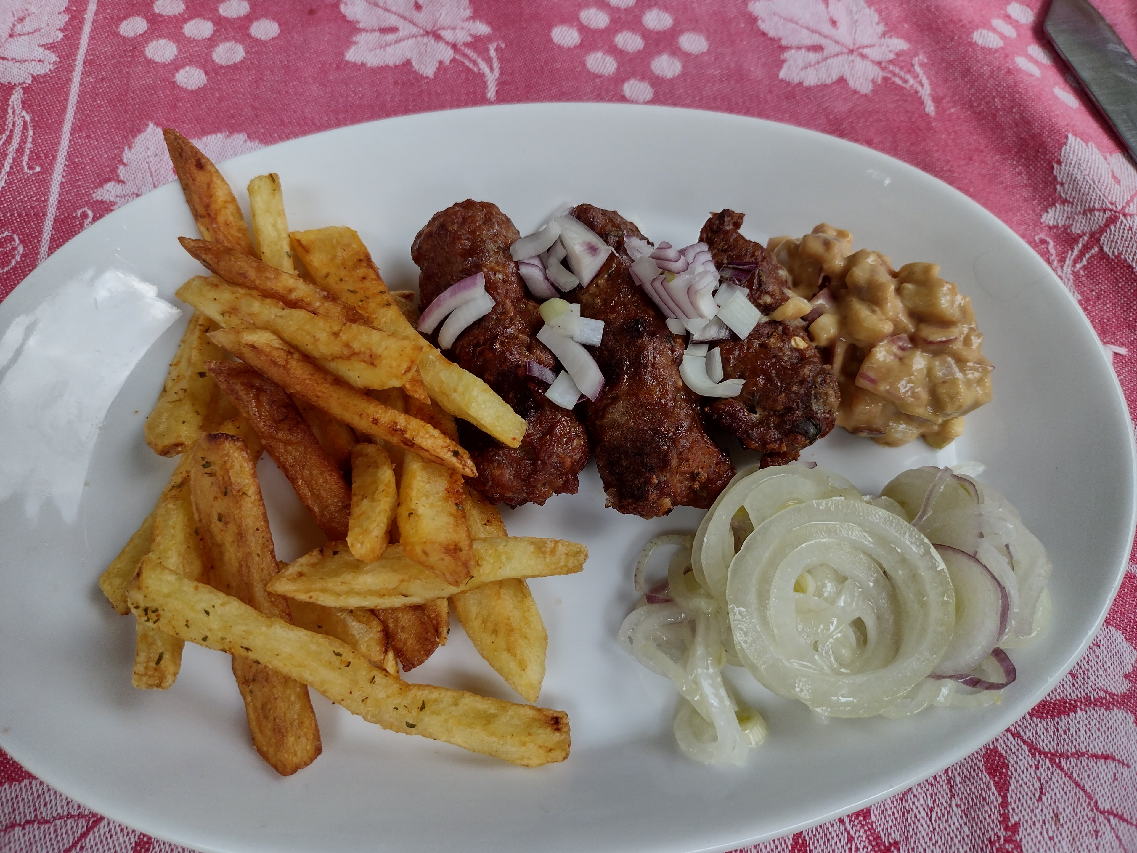 Es gab DIY Pommes, Senf/Zwiebel-Gemisch und etwas Zwiebelsalat.