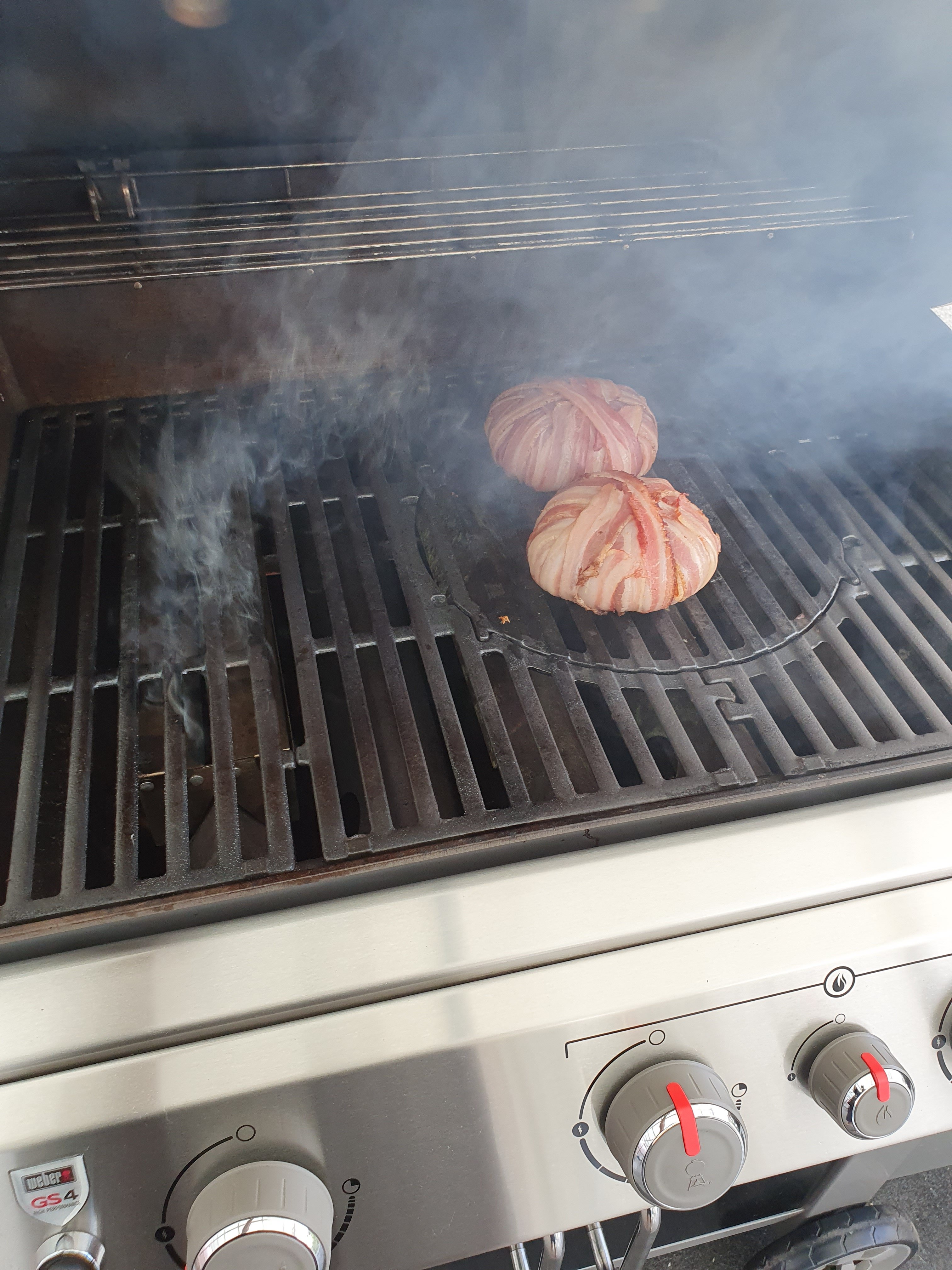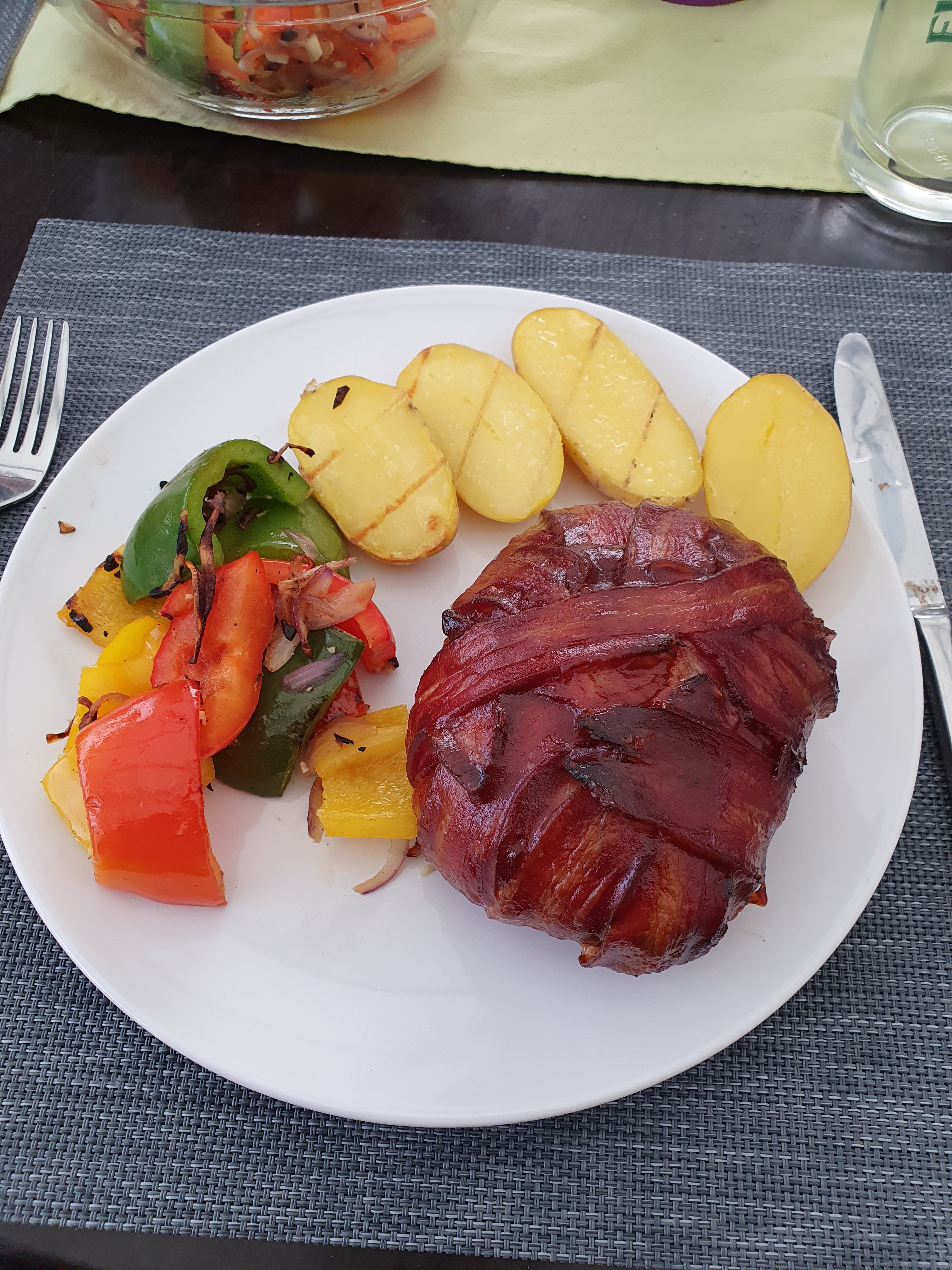 Die Kartoffeln waren natürlich 20min vorgekocht, dann mit Olivenöl bestrichen, grobem Meersalz bestreut und auf dem Warmhalterost fertig gezogen. Paprika war mariniert mit Knoblauch, roten Zwiebeln, Salz, Pfeffer, Olivenöl und dann in der Edelstahl Gemüseschale auf dem einzig aktiven Brenner in 10 Minuten scharf angebraten. Ist echt total krass mit dem Genesis 2, ein aktiver Brenner auf full pull, reicht für 180-200° Deckel. Das Teil ist total überdimensioniert, wenn ich tatsächlich mal low and slow sowas wie 3-2-1 Ribs machen will, reicht der eine Brenner auf die niedrigste Stufe um 120° Rost und 150° Deckel zu haben... 🙈