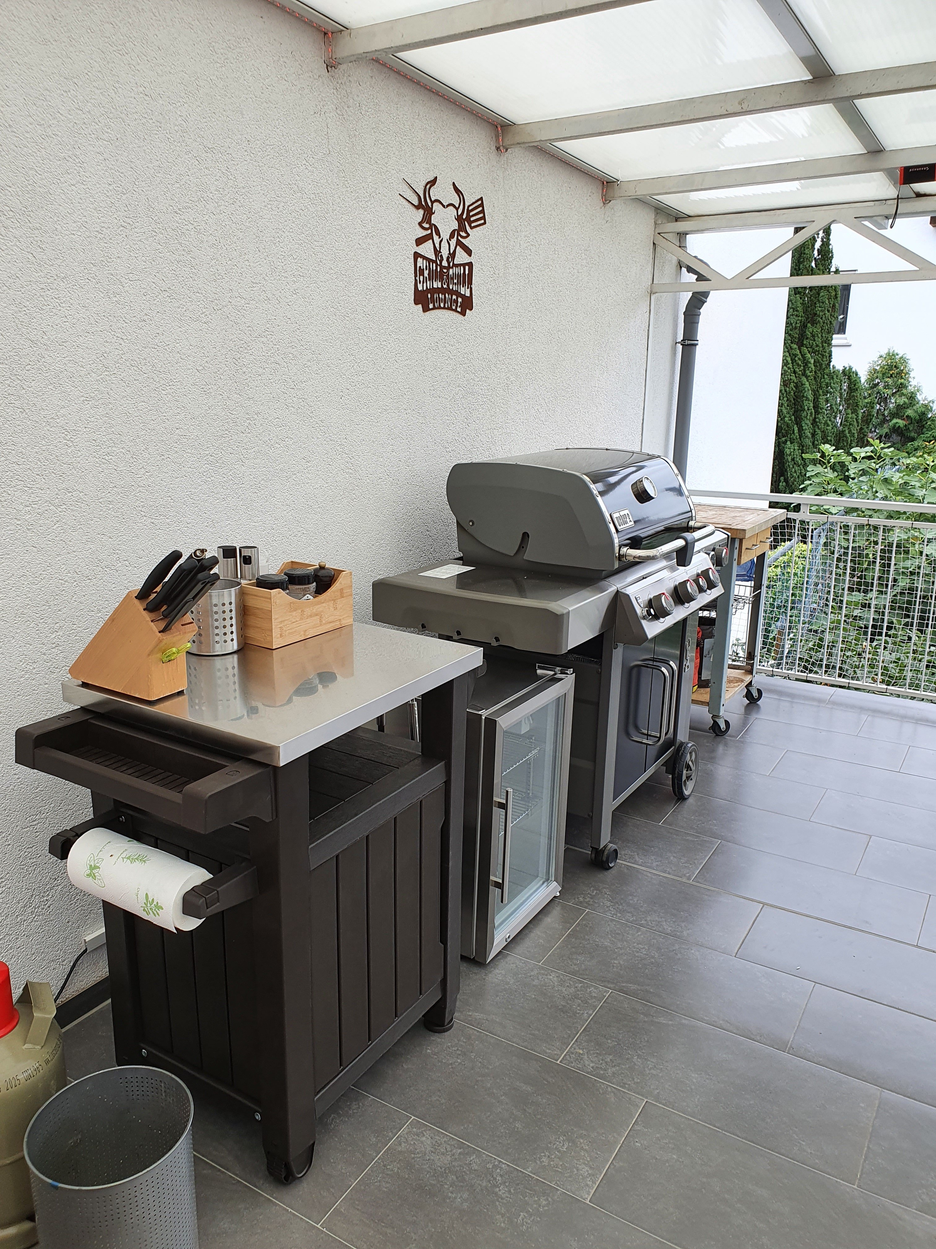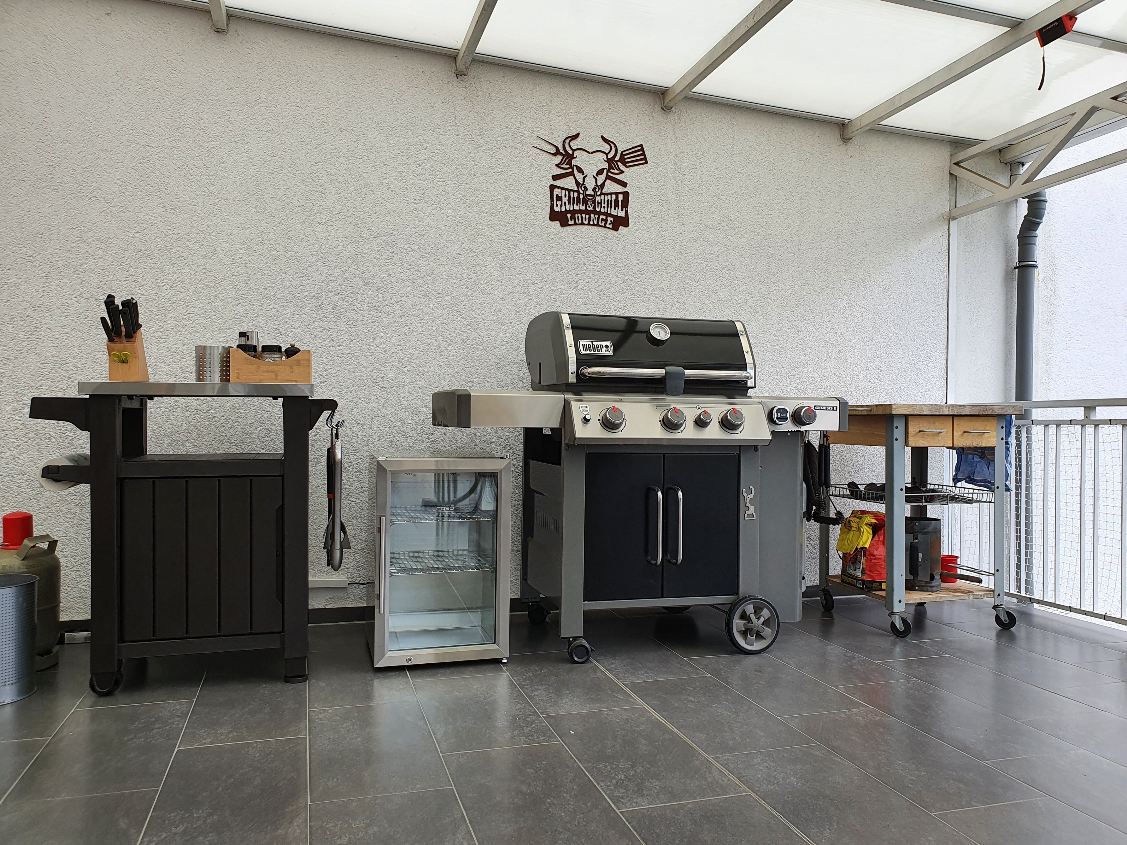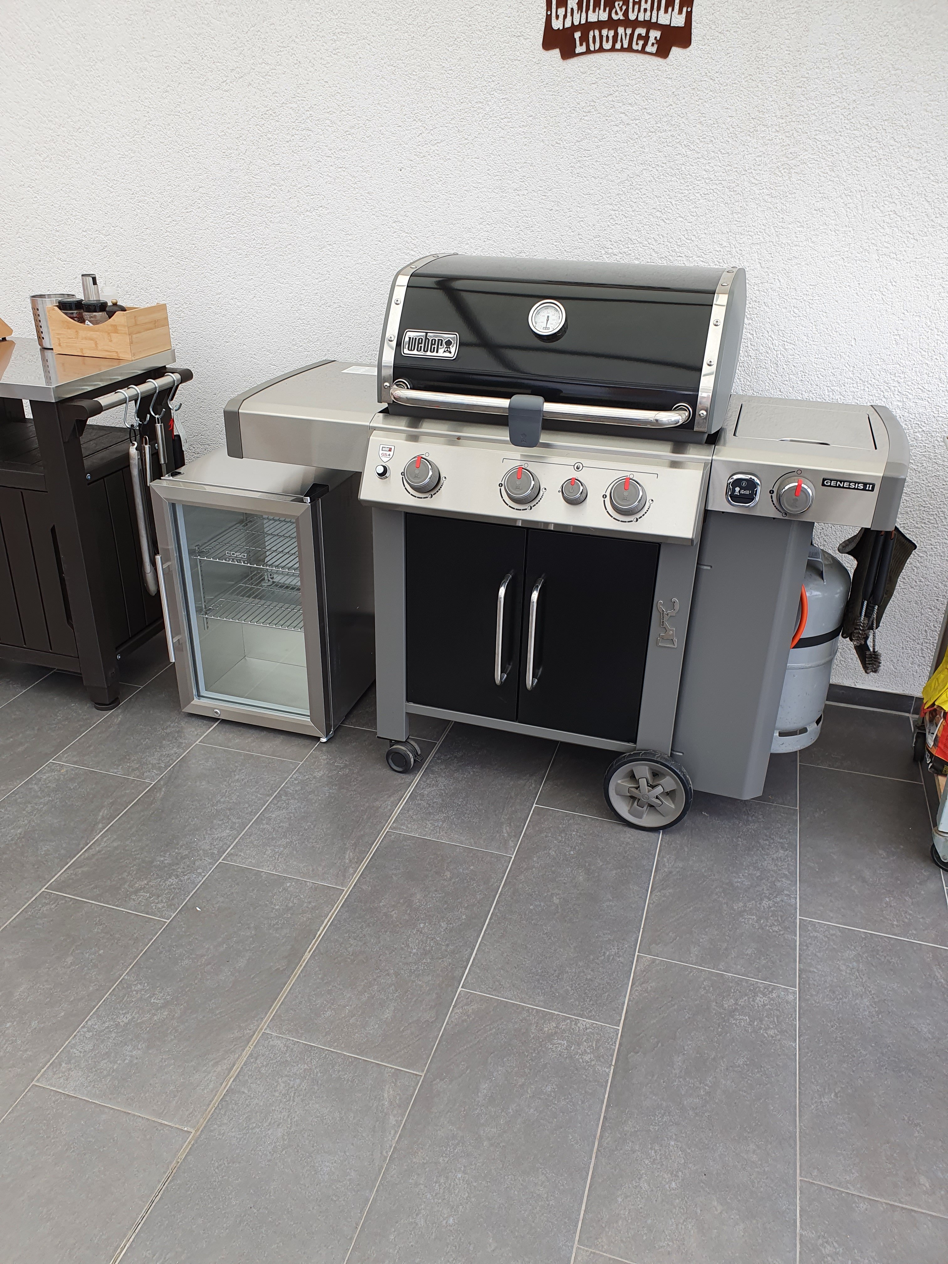 Und ja, der Outdoor Kühlschrank mit Klimaklasse ST/T musste sein, ich hab zwar nen separaten Getränkekühlschrank, aber ich hab echt keinen Bock mehr die ganze Zeit hoch und runter zu rennen, wenn mal meine Kumpels da sind, die Schlagzahlen fahren, dass es nicht mehr feierlich ist. Wirkt klein, aber man bekommt da locker 24 Flaschen 0.5er Bier rein und 2 Flaschen Wein, plus 6 Flaschen Wasser. Heute direkt so ausprobiert und entsprechend so eingestellt, mit den Zwischenböden.