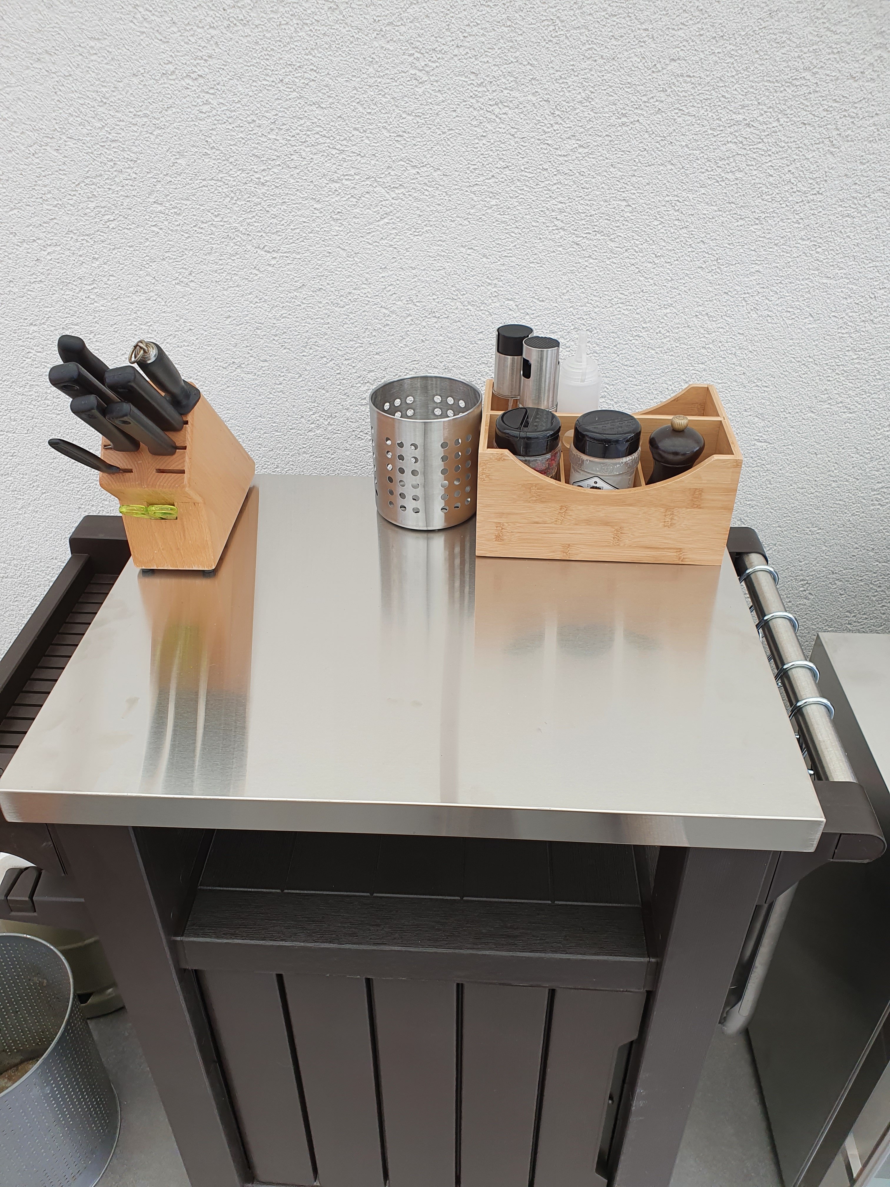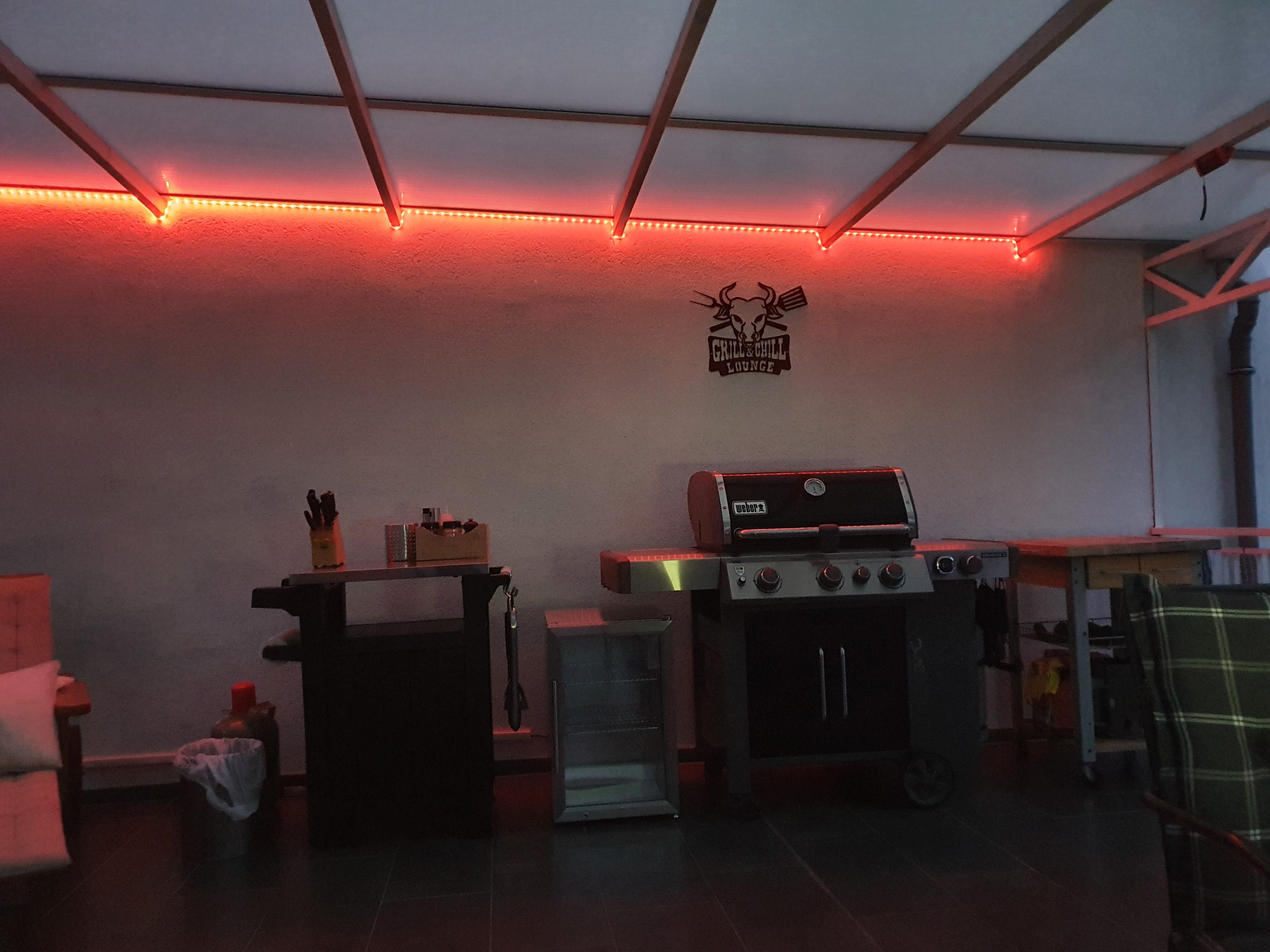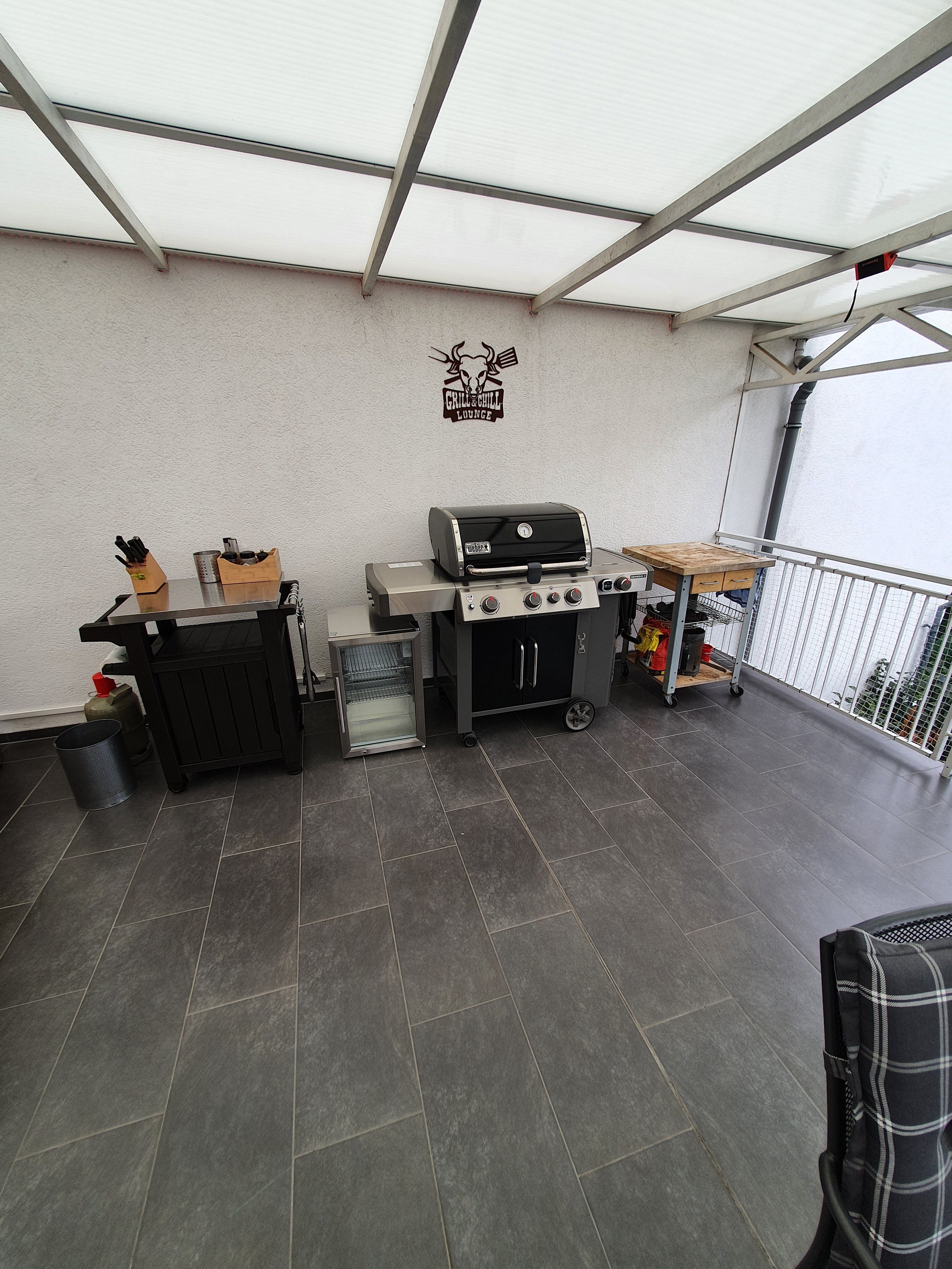 Und ja, der Outdoor Kühlschrank mit Klimaklasse ST/T musste sein, ich hab zwar nen separaten Getränkekühlschrank, aber ich hab echt keinen Bock mehr die ganze Zeit hoch und runter zu rennen, wenn mal meine Kumpels da sind, die Schlagzahlen fahren, dass es nicht mehr feierlich ist. Wirkt klein, aber man bekommt da locker 24 Flaschen 0.5er Bier rein und 2 Flaschen Wein, plus 6 Flaschen Wasser. Heute direkt so ausprobiert und entsprechend so eingestellt, mit den Zwischenböden.