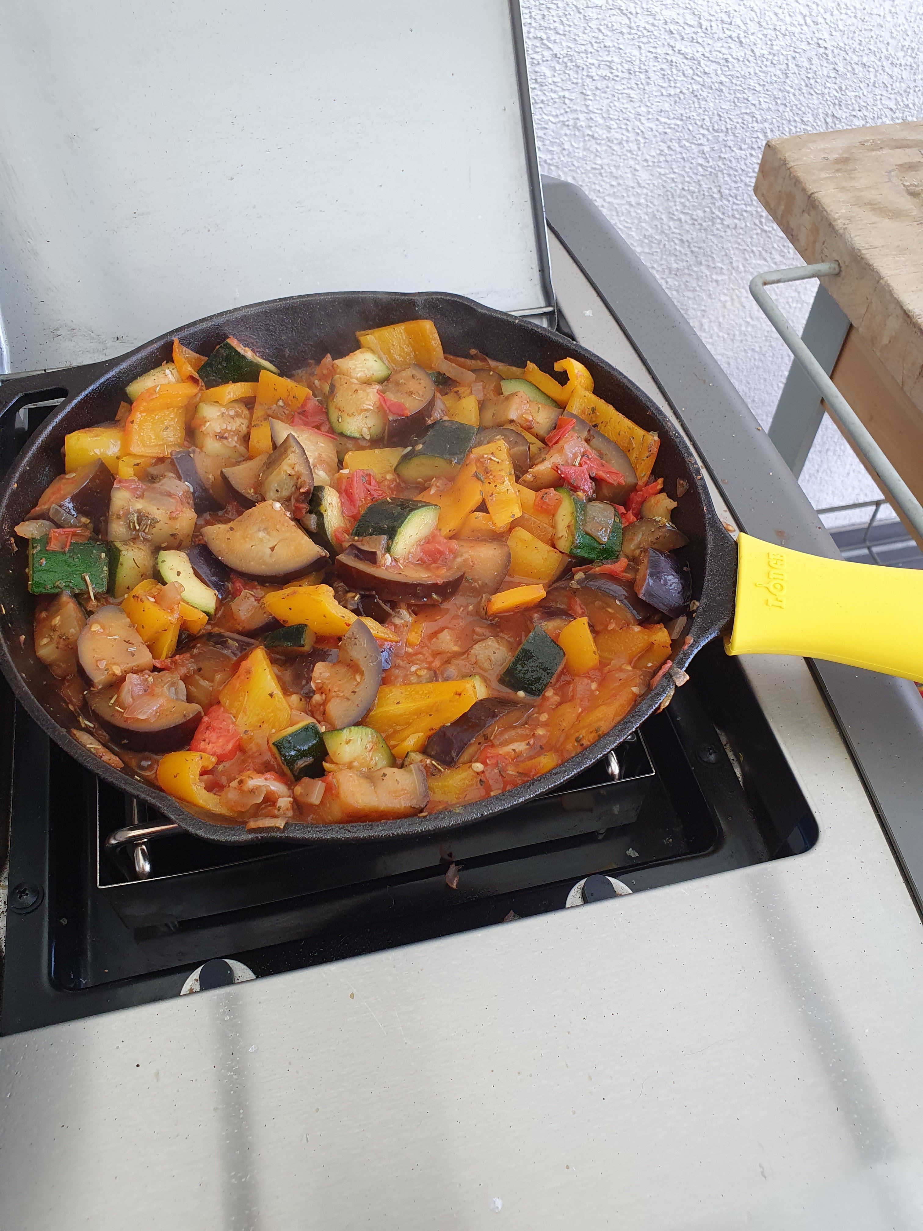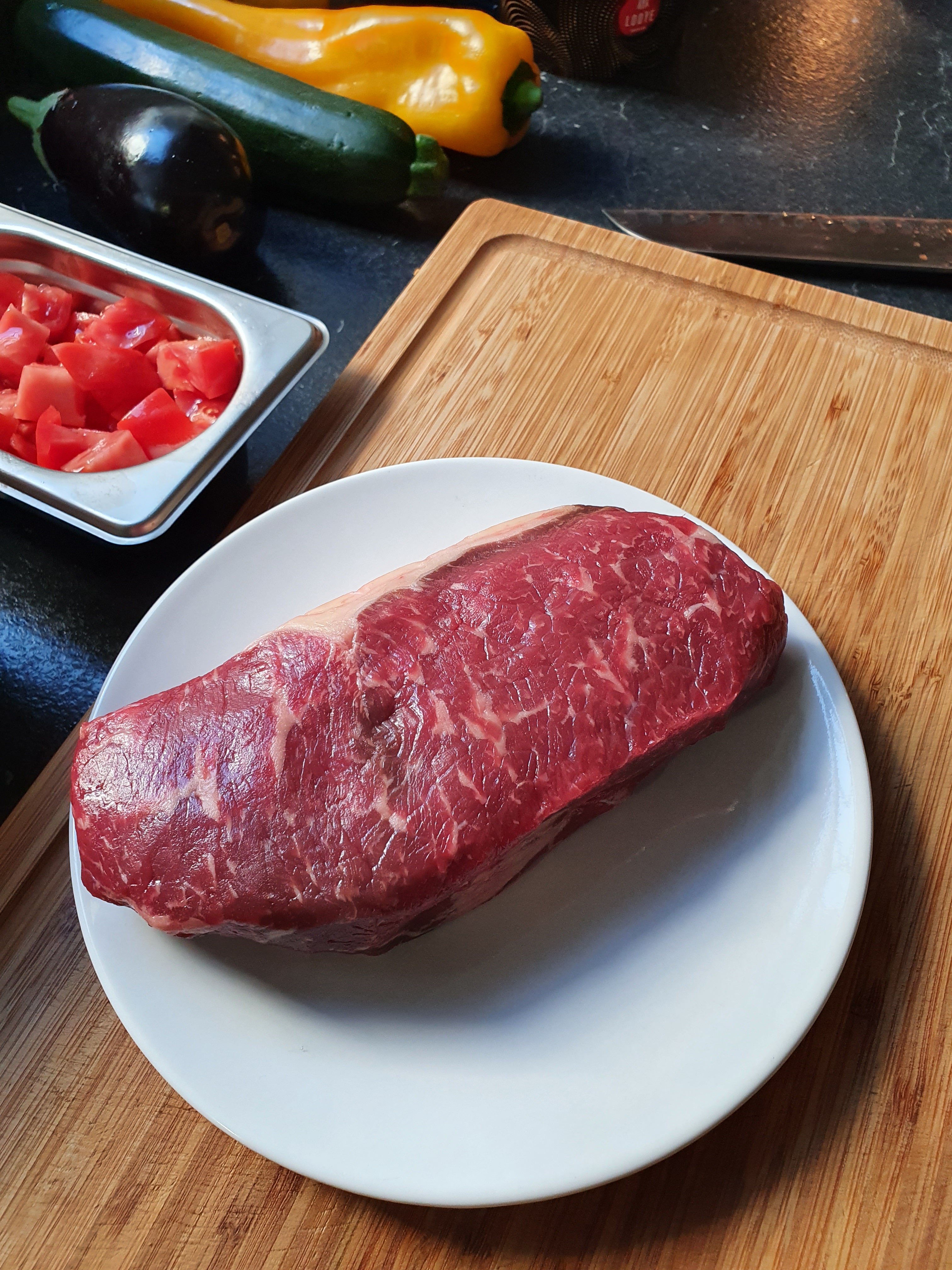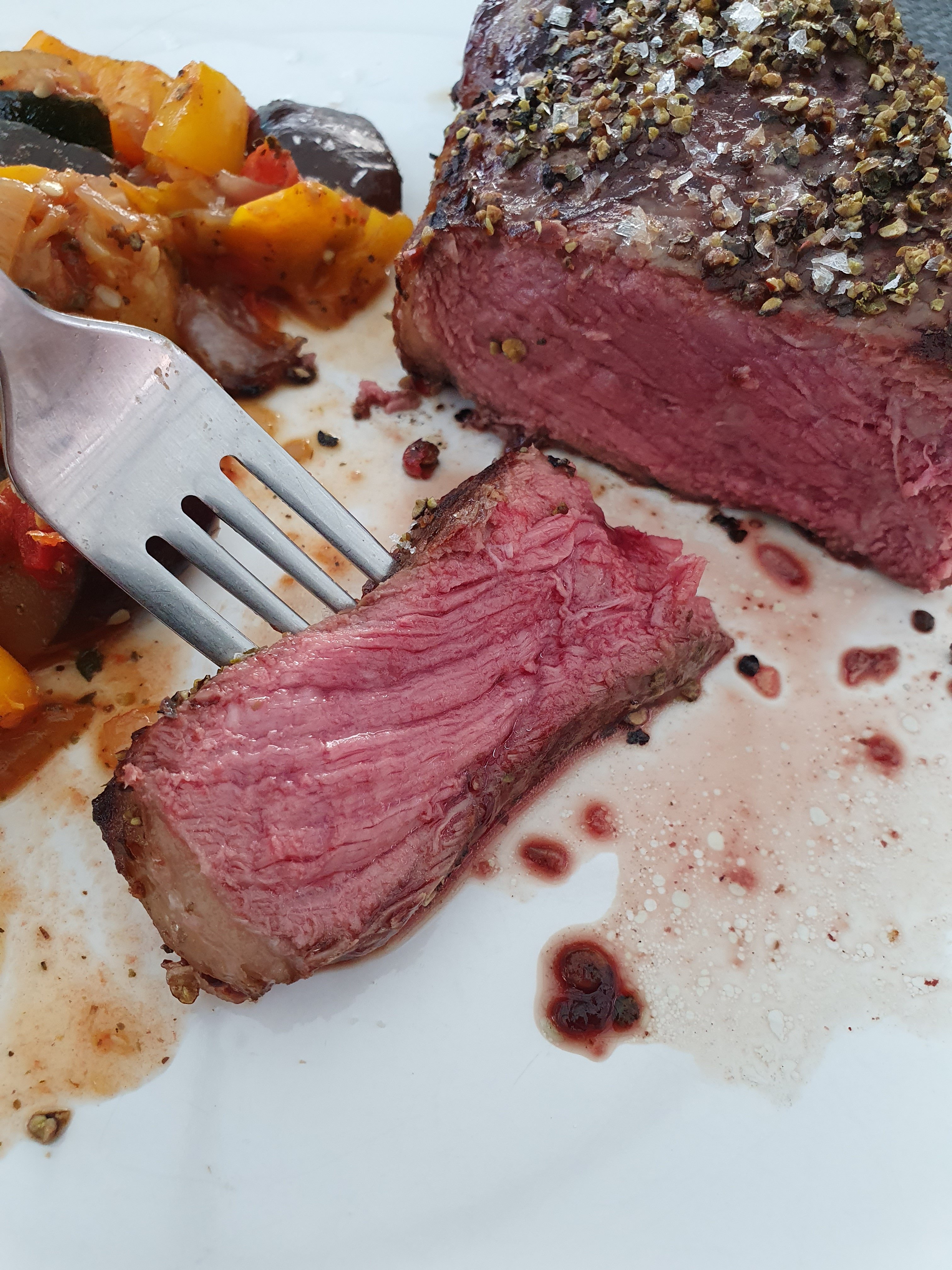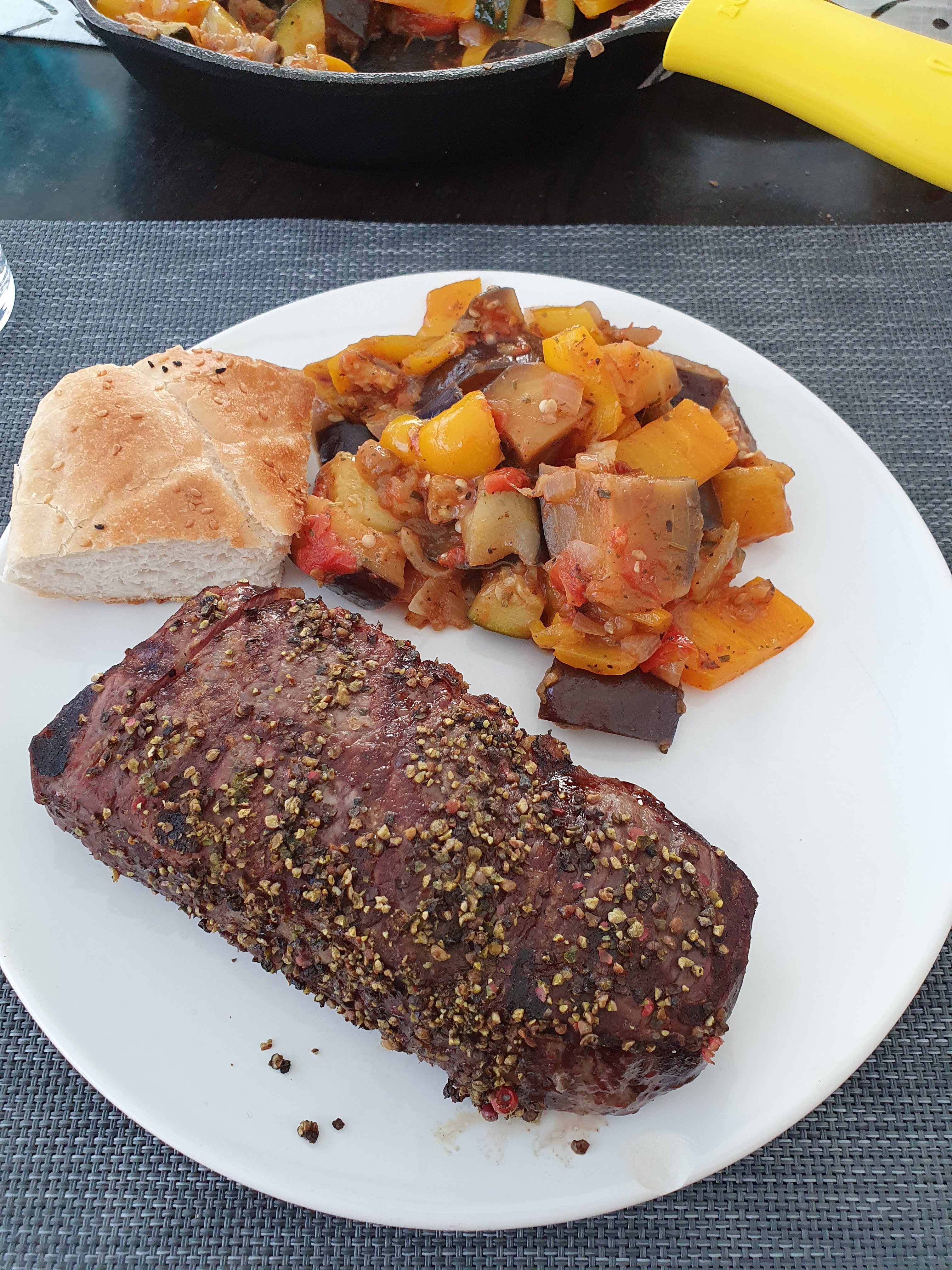 Sensationelles Preisleistungsverhältnis muss ich sagen und obschon eigentlich vom Simmentaler, geil zart und saftig. Hab es bei 370° Deckel/800° Rost auf der Sear Zone scharf angeballert von jeder Seite 2 Minuten, dann raus und kurz in grobem Steakpfeffer gewälzt, dann ganz langsam bei 120° indirekt auf 55° Kern gezogen und 3 Minuten ruhen lassen. War echt wirklich richtig gut. Und das Gemüse fürs Ratatouille war komplett alles hier aus dem Ort, heute morgen frisch gekauft beim Bauer, war auch super lecker.