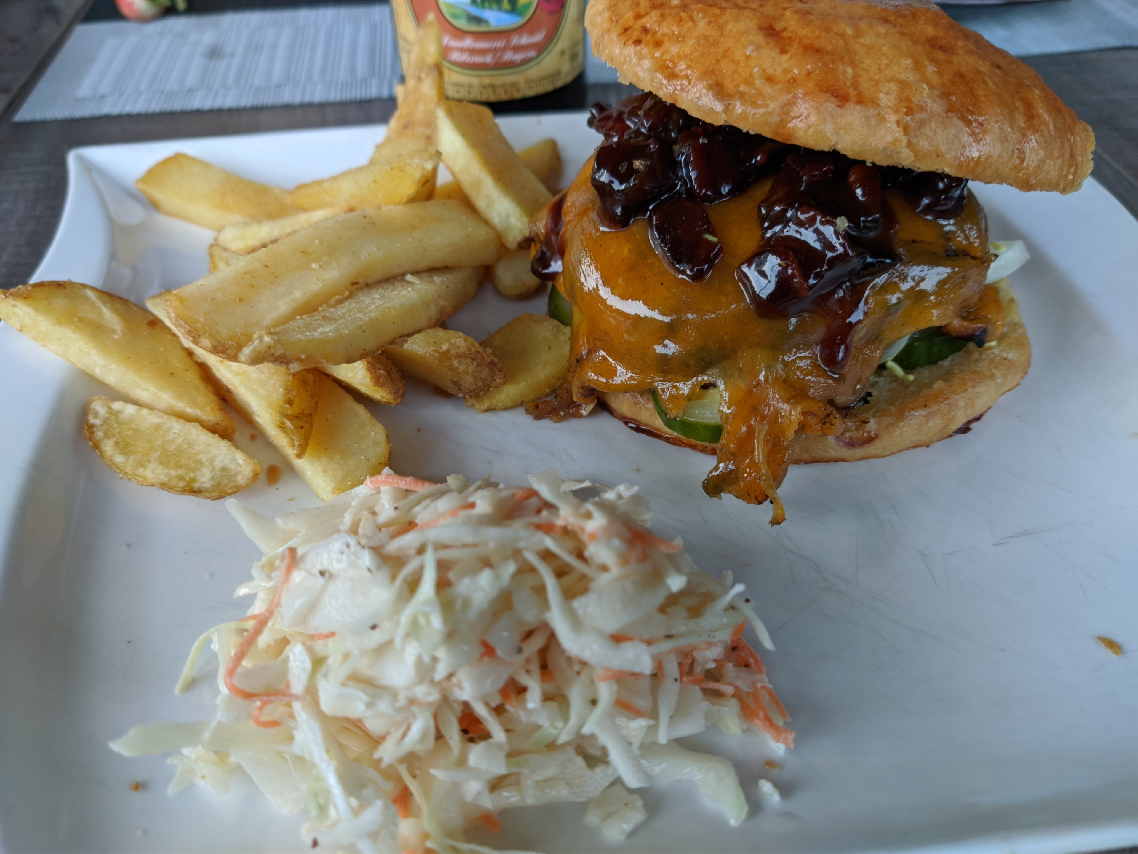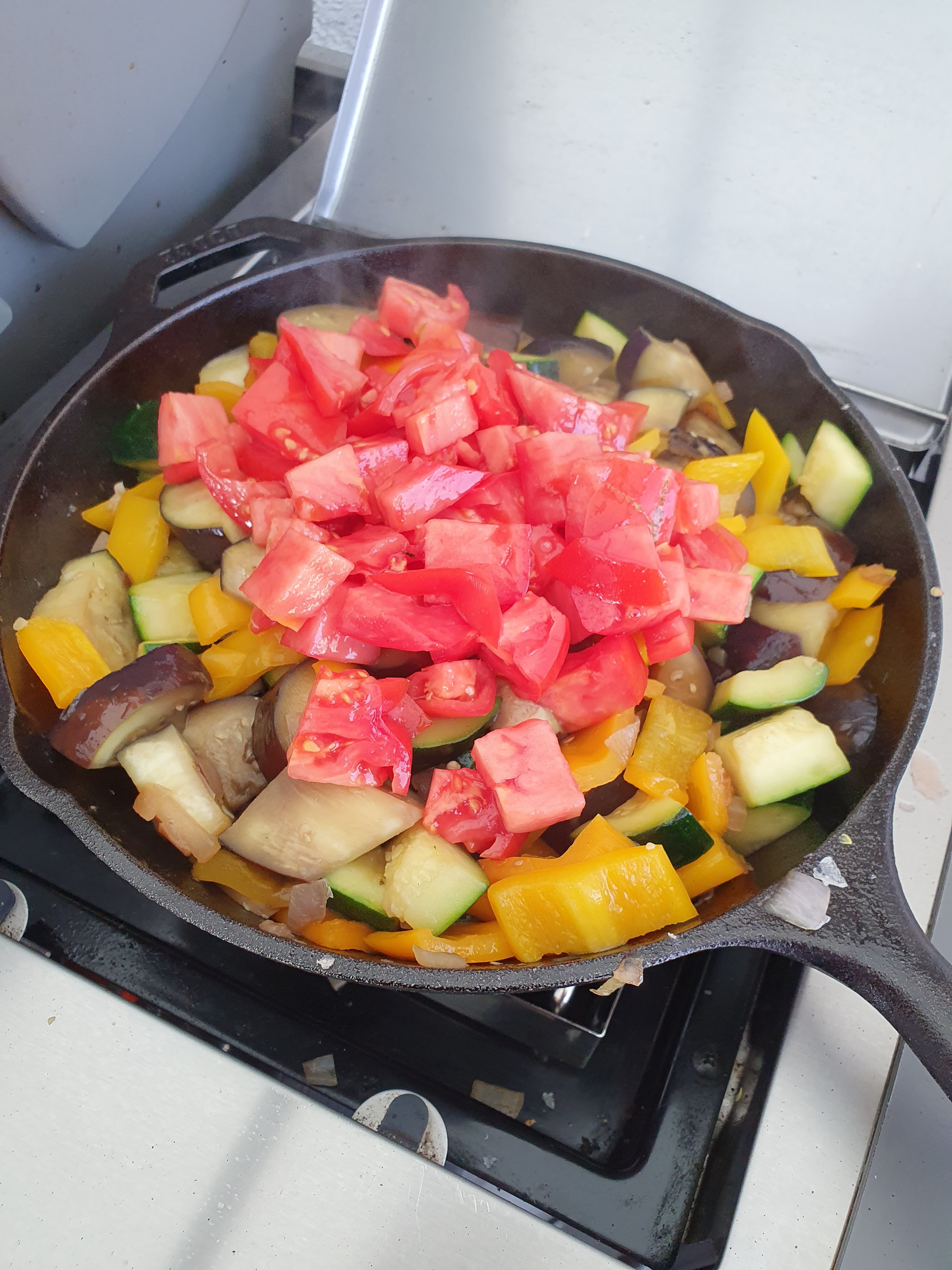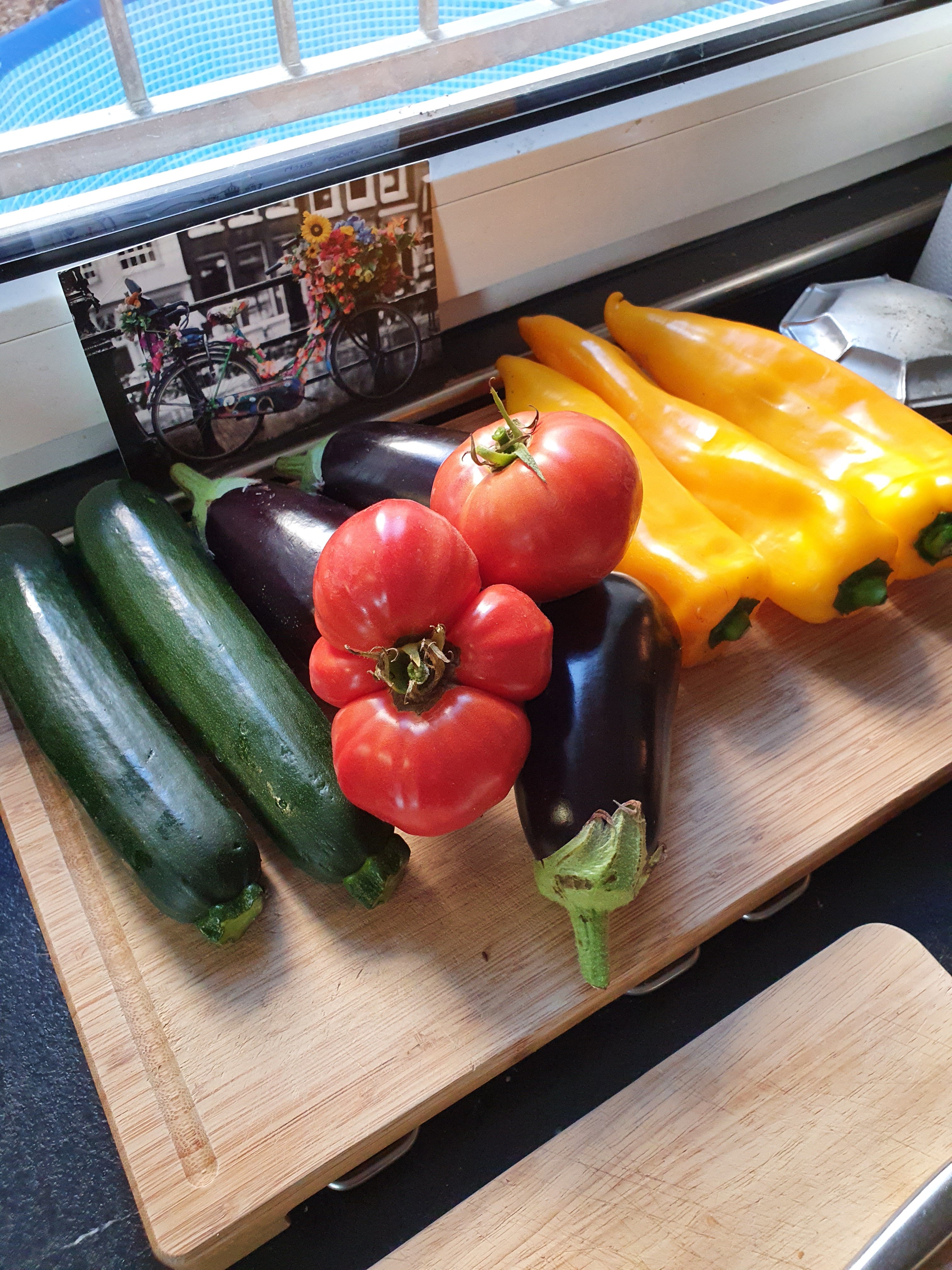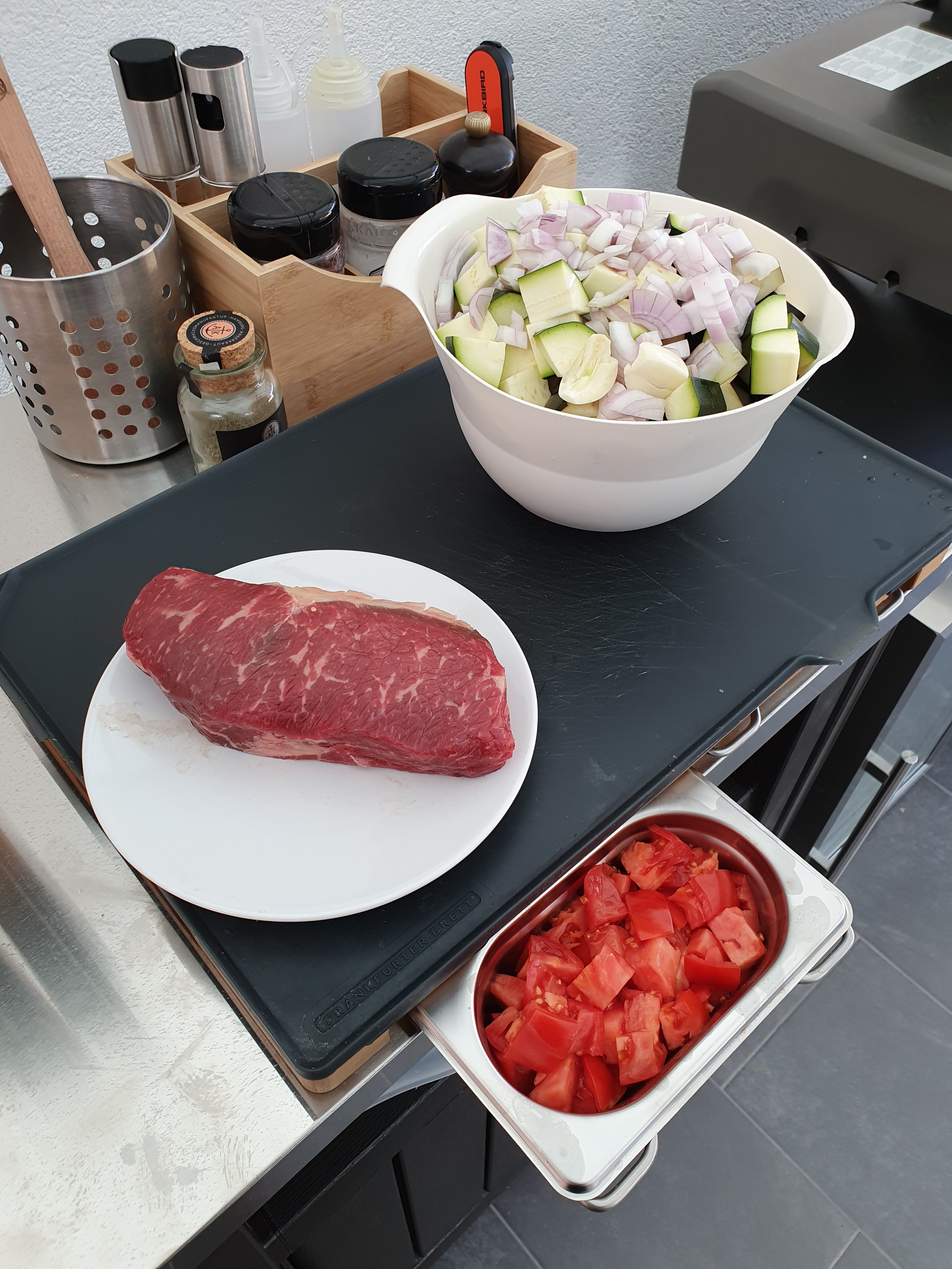 Sensationelles Preisleistungsverhältnis muss ich sagen und obschon eigentlich vom Simmentaler, geil zart und saftig. Hab es bei 370° Deckel/800° Rost auf der Sear Zone scharf angeballert von jeder Seite 2 Minuten, dann raus und kurz in grobem Steakpfeffer gewälzt, dann ganz langsam bei 120° indirekt auf 55° Kern gezogen und 3 Minuten ruhen lassen. War echt wirklich richtig gut. Und das Gemüse fürs Ratatouille war komplett alles hier aus dem Ort, heute morgen frisch gekauft beim Bauer, war auch super lecker.