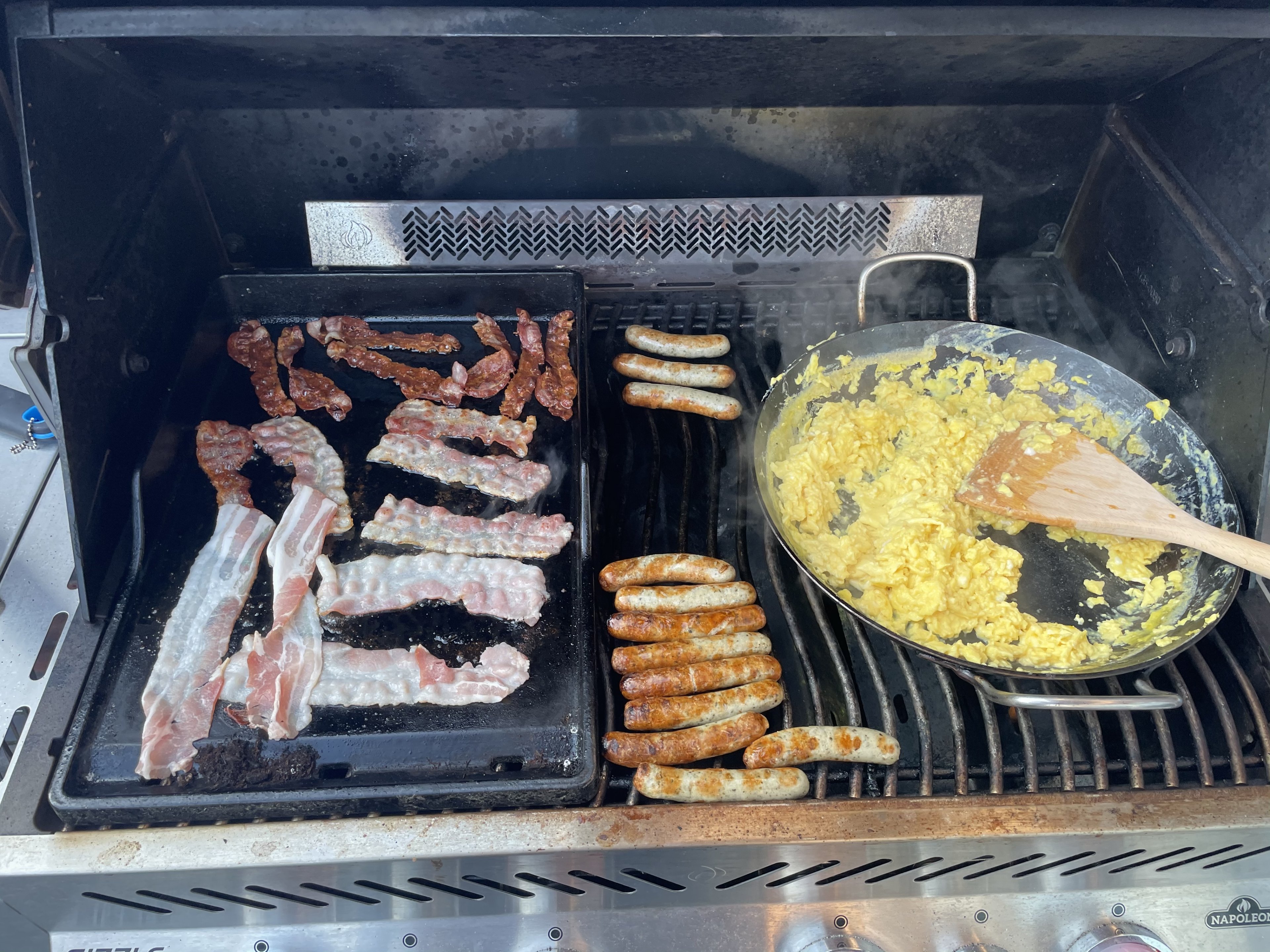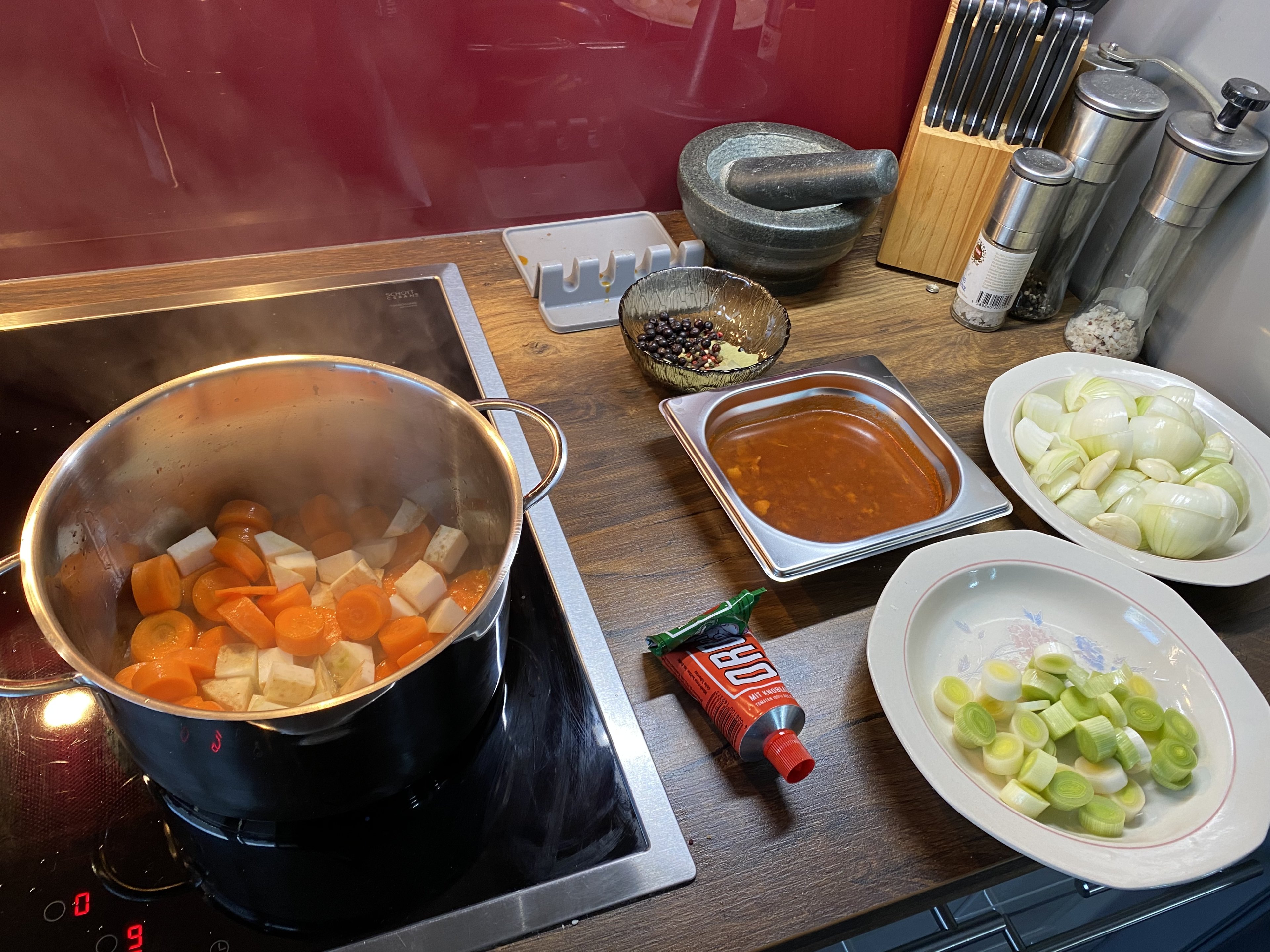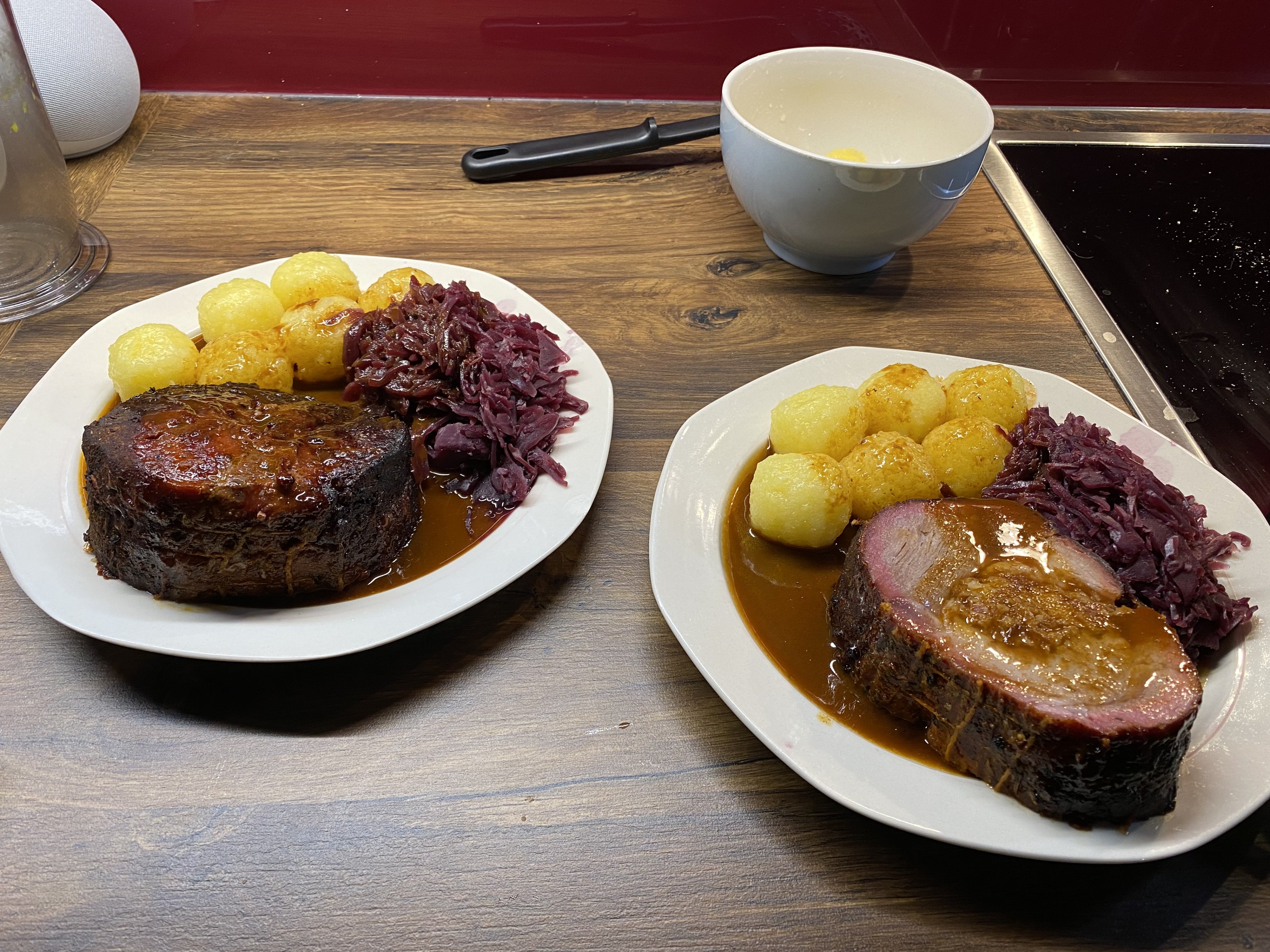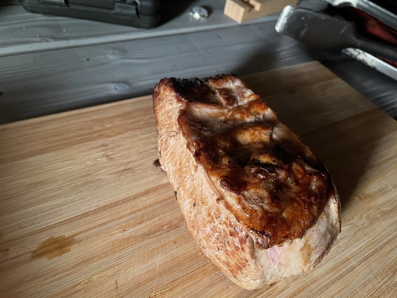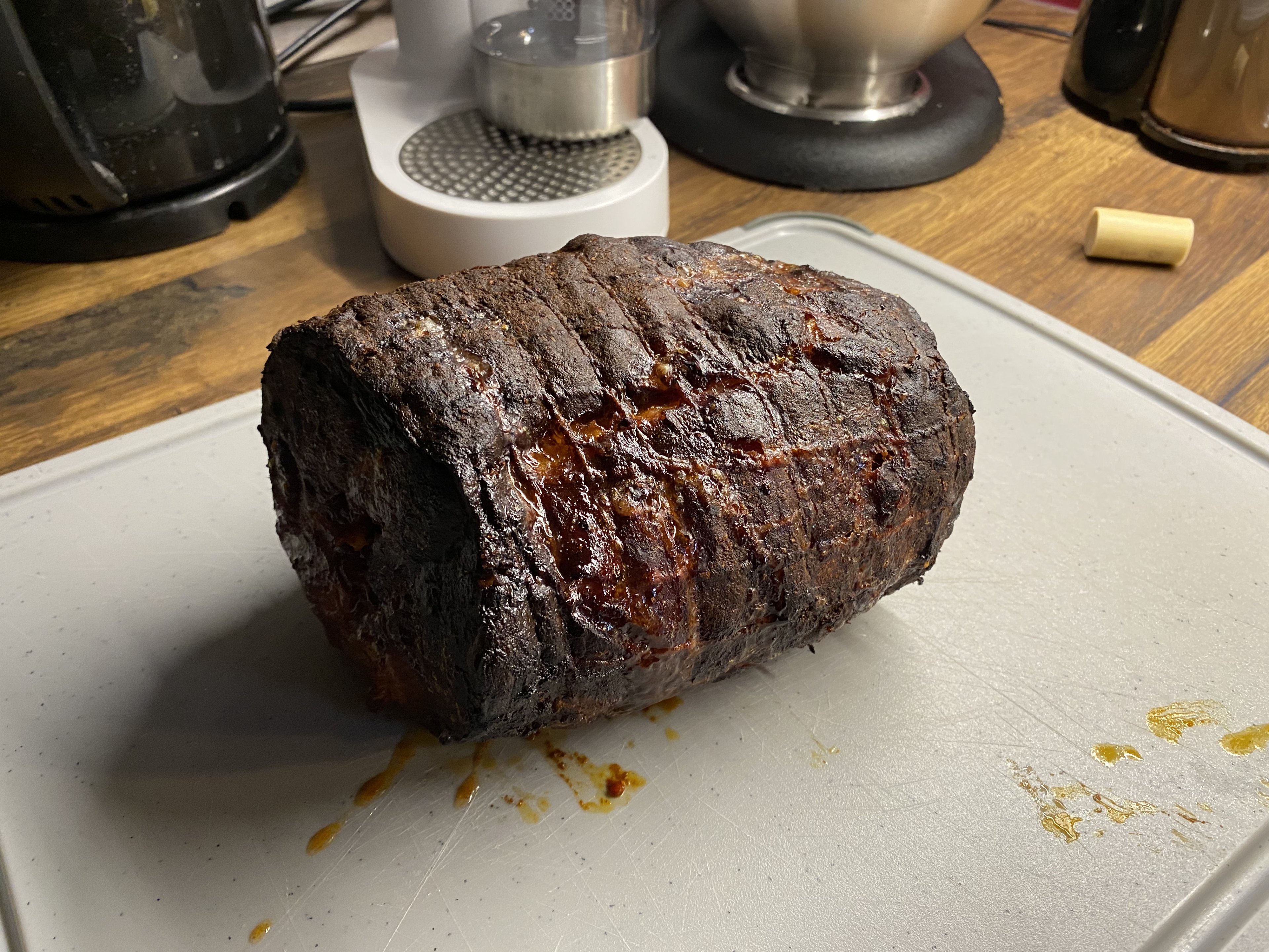 Ich hab sowieso noch nen Spießbraten einvakuumiert im TK und dachte mir, da es heute sowieso immer mal wieder regnen soll, könnte ich den ja im Dampfgarer vorgaren und dann später auf der Kugel fertig ziehen lassen + bisschen smoke.