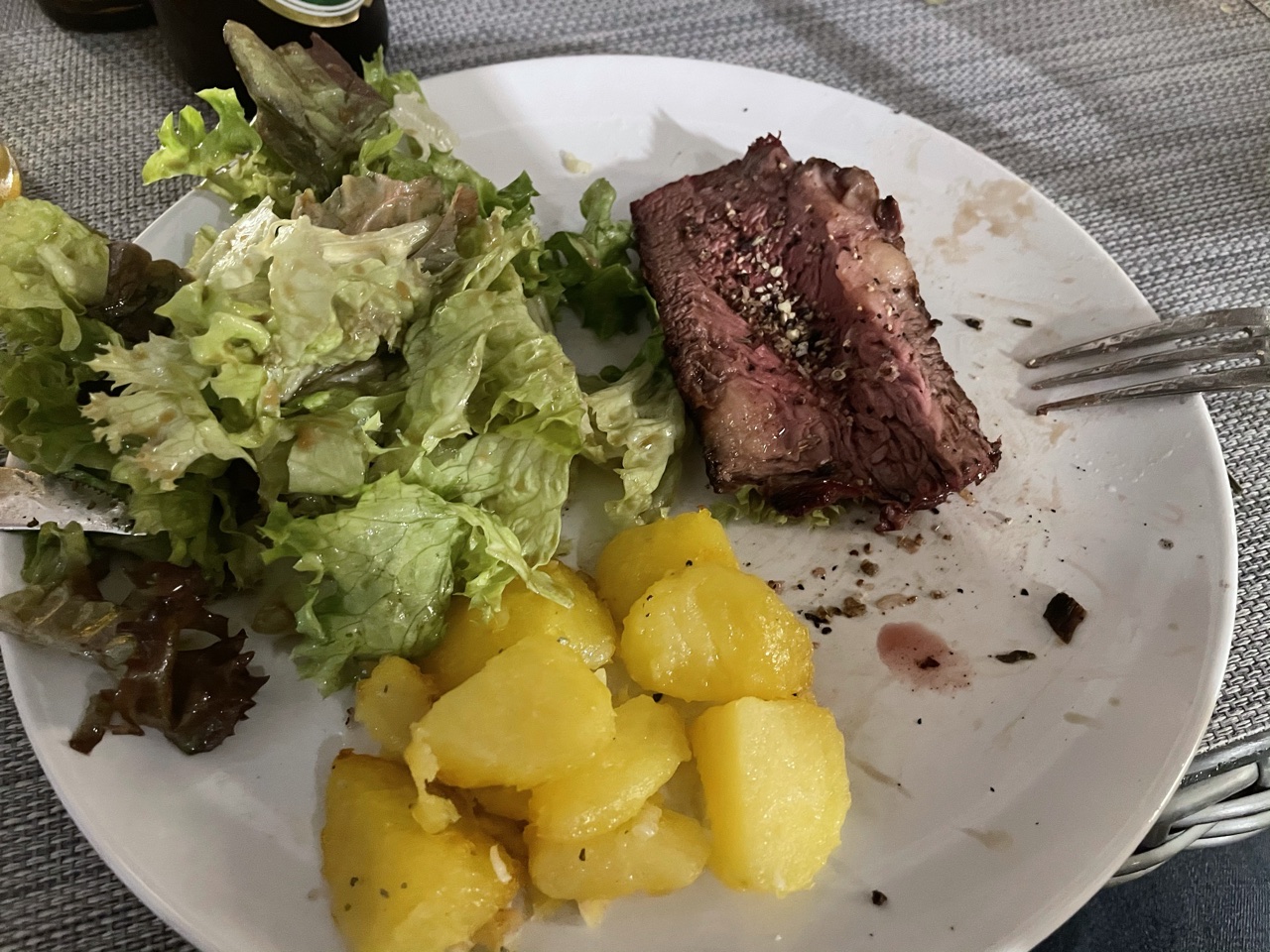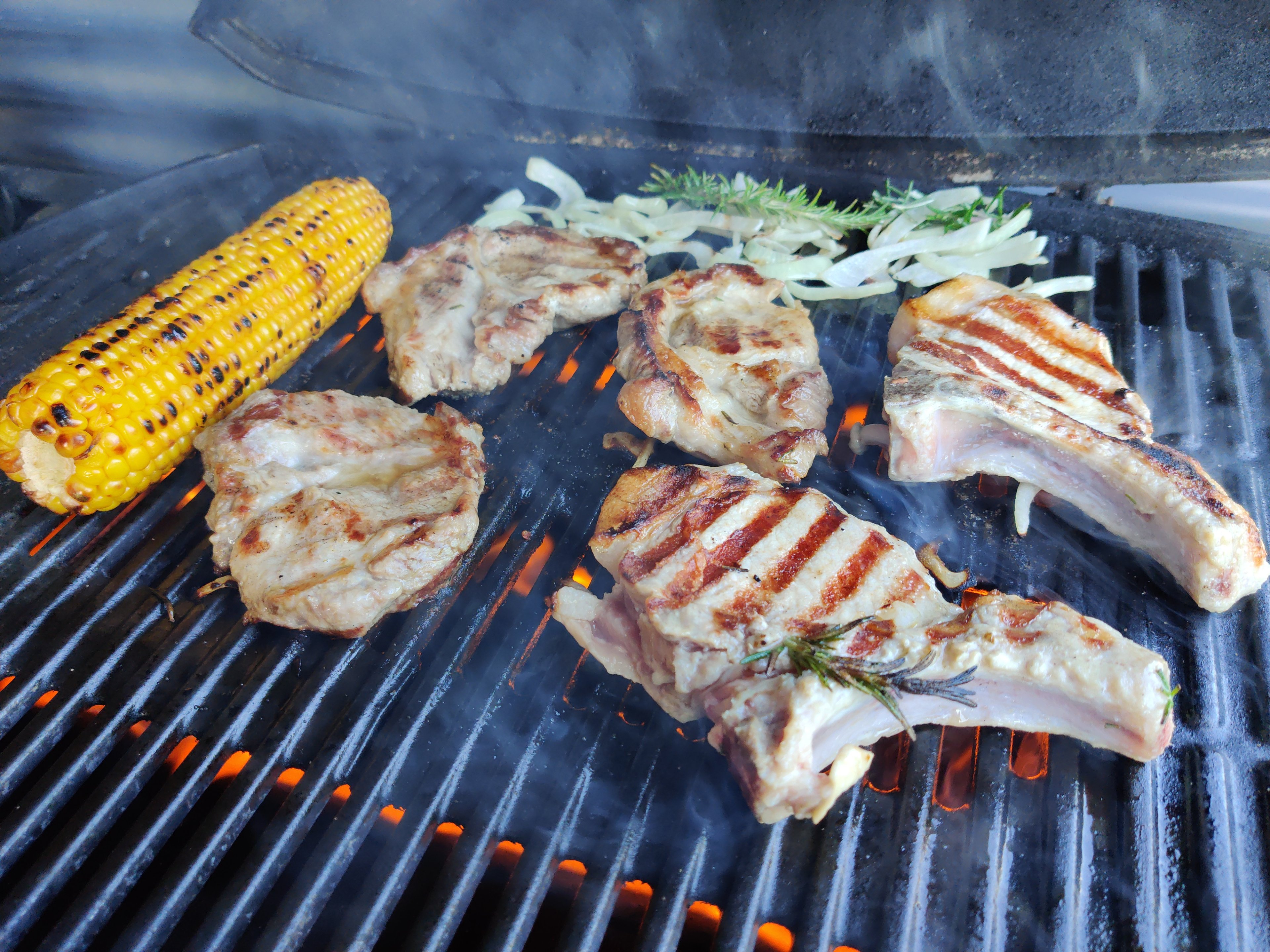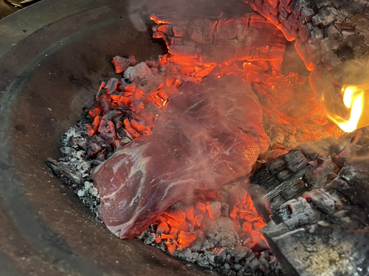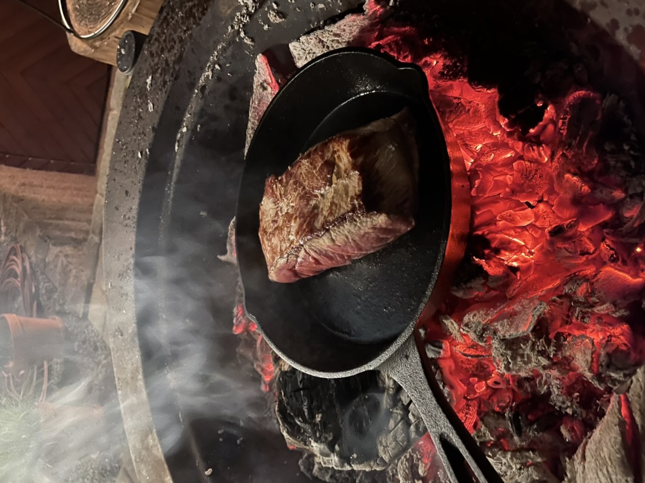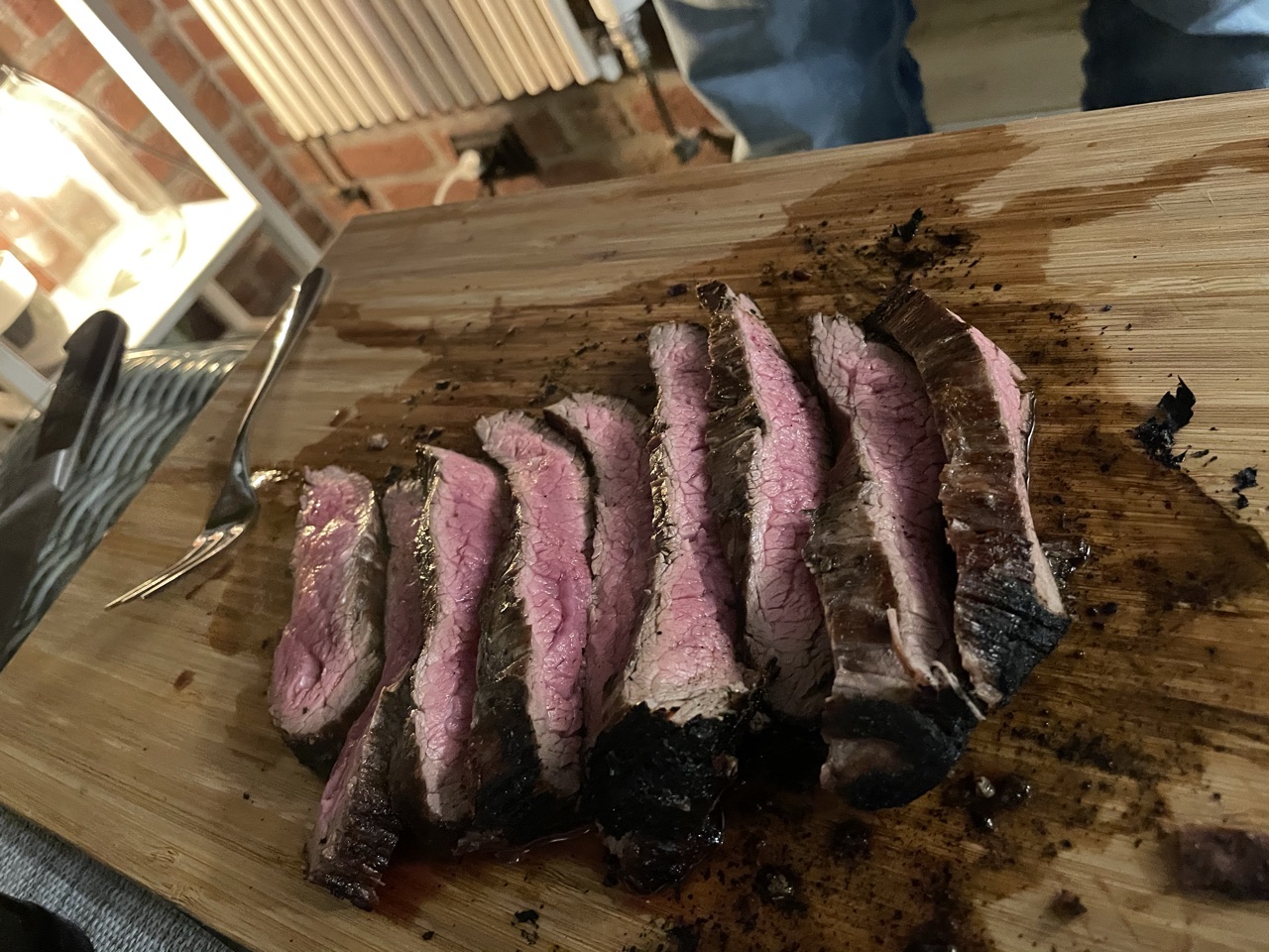 Flank Caveman, Entrecôte scharf und dann indirekt im Camado und Roastbeef in der Pfanne und dann auch in den Camado.