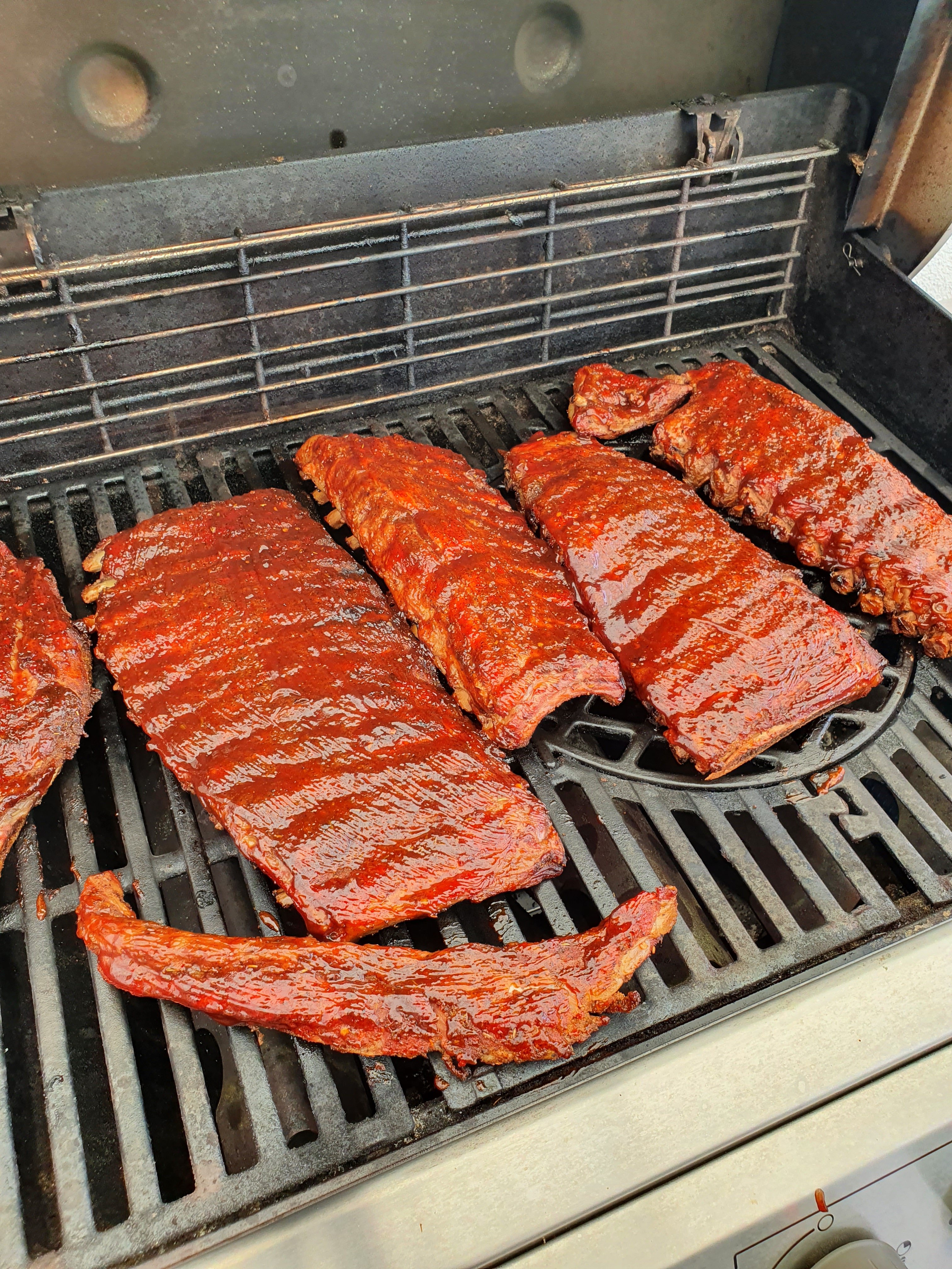 Am Freitag gabs 3-2-1 Ribs, also 3 Stunden mit Hickorychips geräuchert, 2h in Apfelsaft und Zwiebeln gedämpft und eine Stunde mit Sweet Baby Rays BBQ Sauce glasiert. Das erste mal in meinem Leben aufm Gasgrill, hat aber recht gut funktioniert. Hab da so ne Räucherbox, die direkt auf der Flavorbar aufliegt. Dazu gabs ein selbstgebackenes Dinkelvollkornbrot ausm Gusseisenbräter. Und, ja, es waren zwei verschiedene Sorten Ribs, einmal Baby Backs vom Schwarzwälder Kräuterschwein, vom