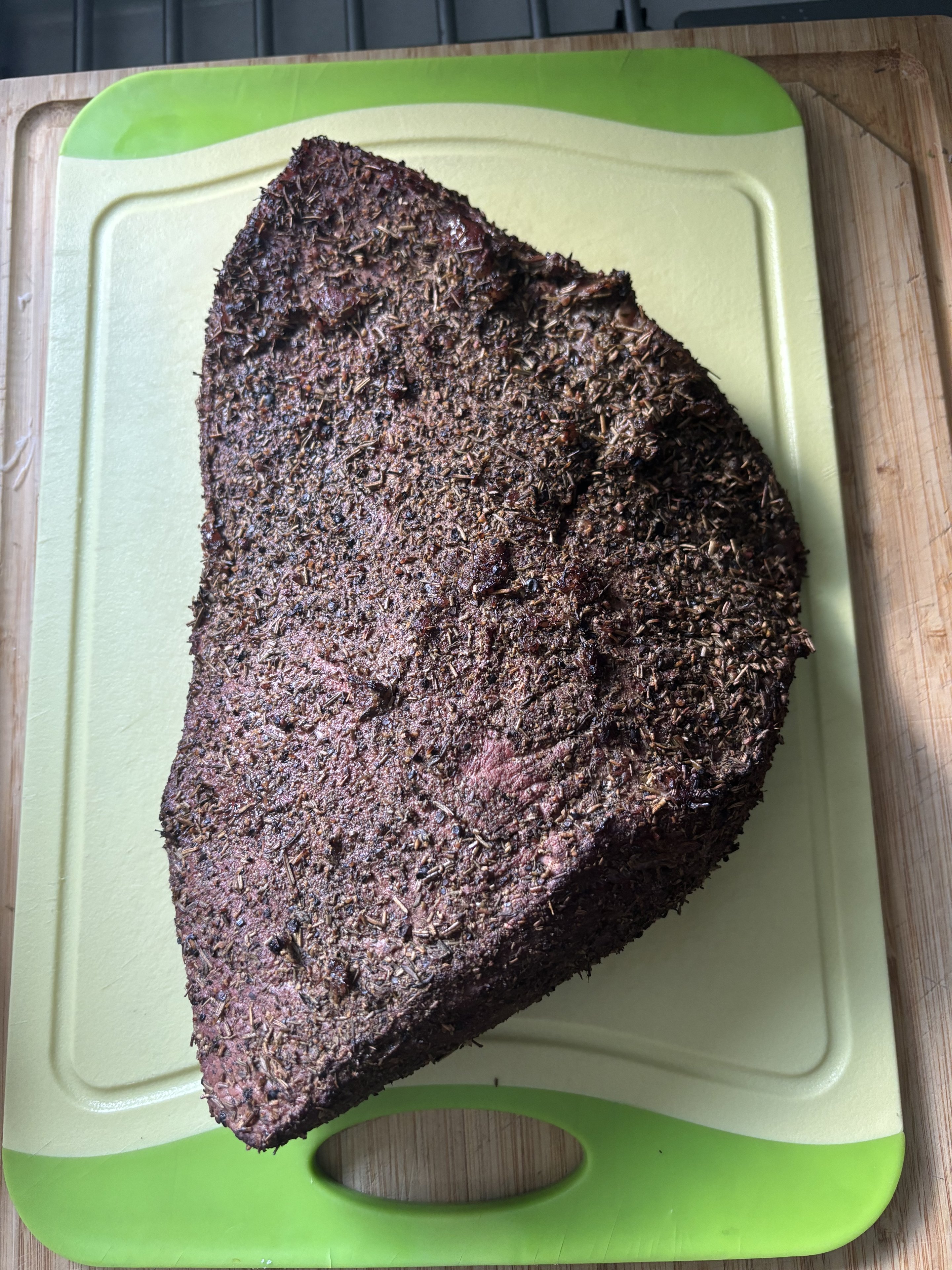 Ich habe am WE das 9 Tage gepökelte Pastrami aus Tafelspitz gesmoked. Gute Nachricht an dieser Stelle: die Lüftungserweiterung hat funktioniert, ich bin bis 125/130 Grad gekommen.
