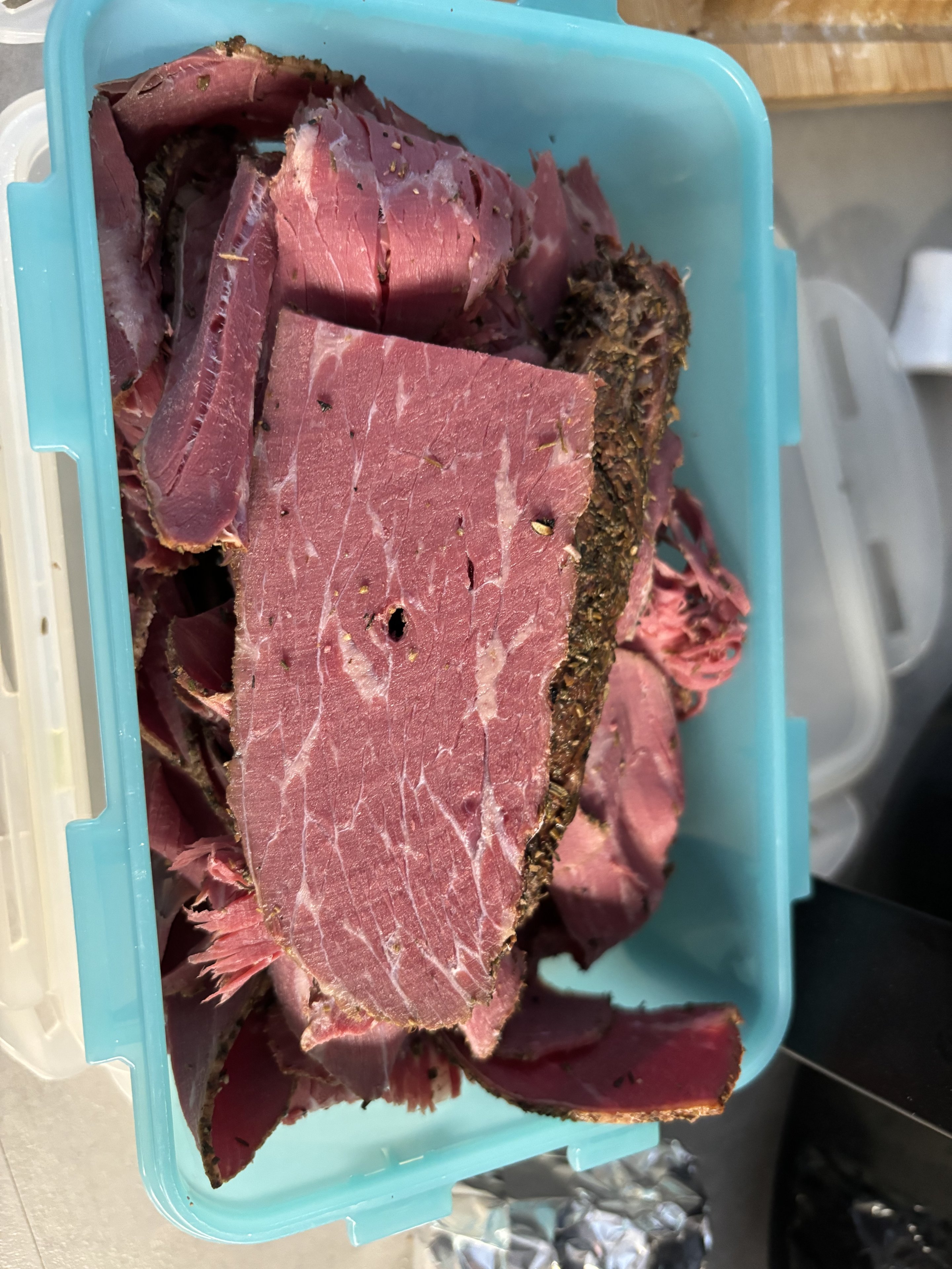 so sieht das pastrami im geschnittenen Zustand aus - wir haben es mit unserer Brotmaschine auf Stufe 0 möglichst dünn aufgeschnitten, einen Teil auf Sandwich gegessen und den Rest portionsweise eingefroren.