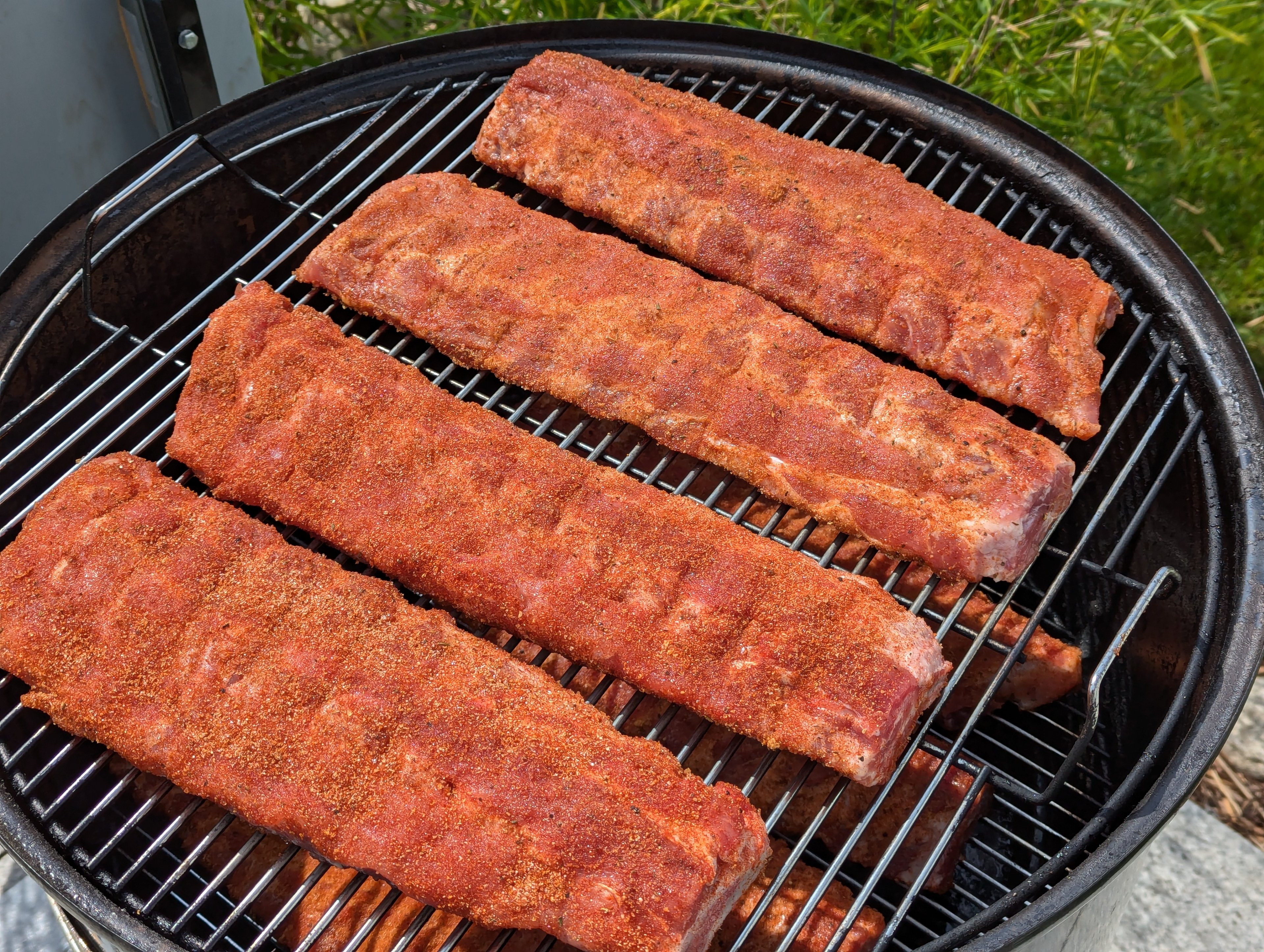 Bei den Ribs diesmal an Meathed gehalten und zunĂ€chst nur mit Salz ĂŒber Nacht gelagert und den Rub (ohne Salz) dann frisch aufgetragen - so bekommt man potentiell ne schönere Rub Verteilung und bessere Kruste, hab allerdings nicht so gleichmĂ€Ăig gearbeitet, man sieht auf dem Bild (ist noch vor der Folienphase) die Stellen wo zuviel Rub drauf ist und sich deshalb noch keine Kruste gebildet hat.