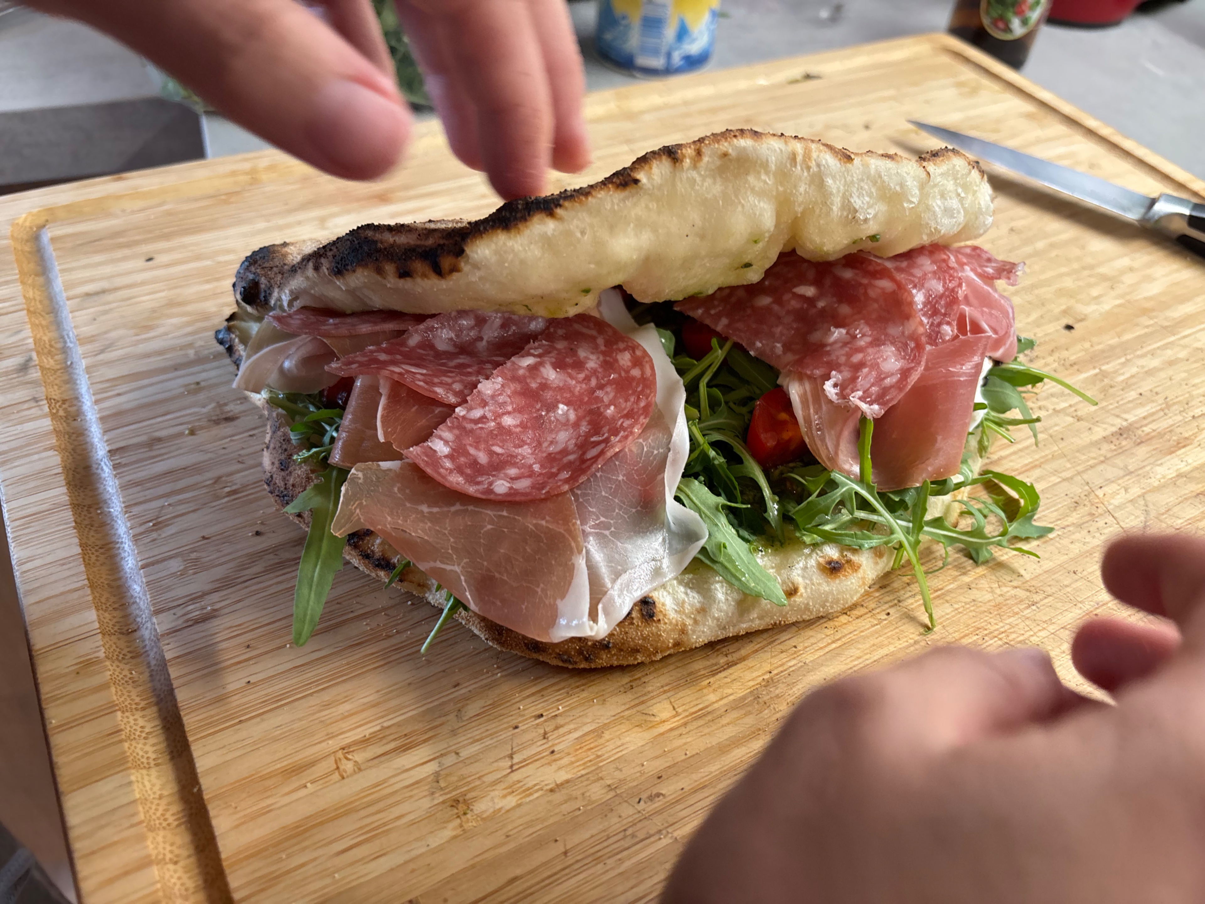 Heute haben wir was neues getestet: Ich habe vor ein paar Wochen mal diese Pizza Sandwich Sache im Internet irgendwo gesehen - Pizzateig fertig machen, ausbreiten und dann hälftig mit Olivenöl bestreichen und zufalten. Den halbierten Teig dann im ofen backen; durch das Olivenöl kann man ihn aufklappen und belegen wie ein Sandwich. Es ist ein Traum.