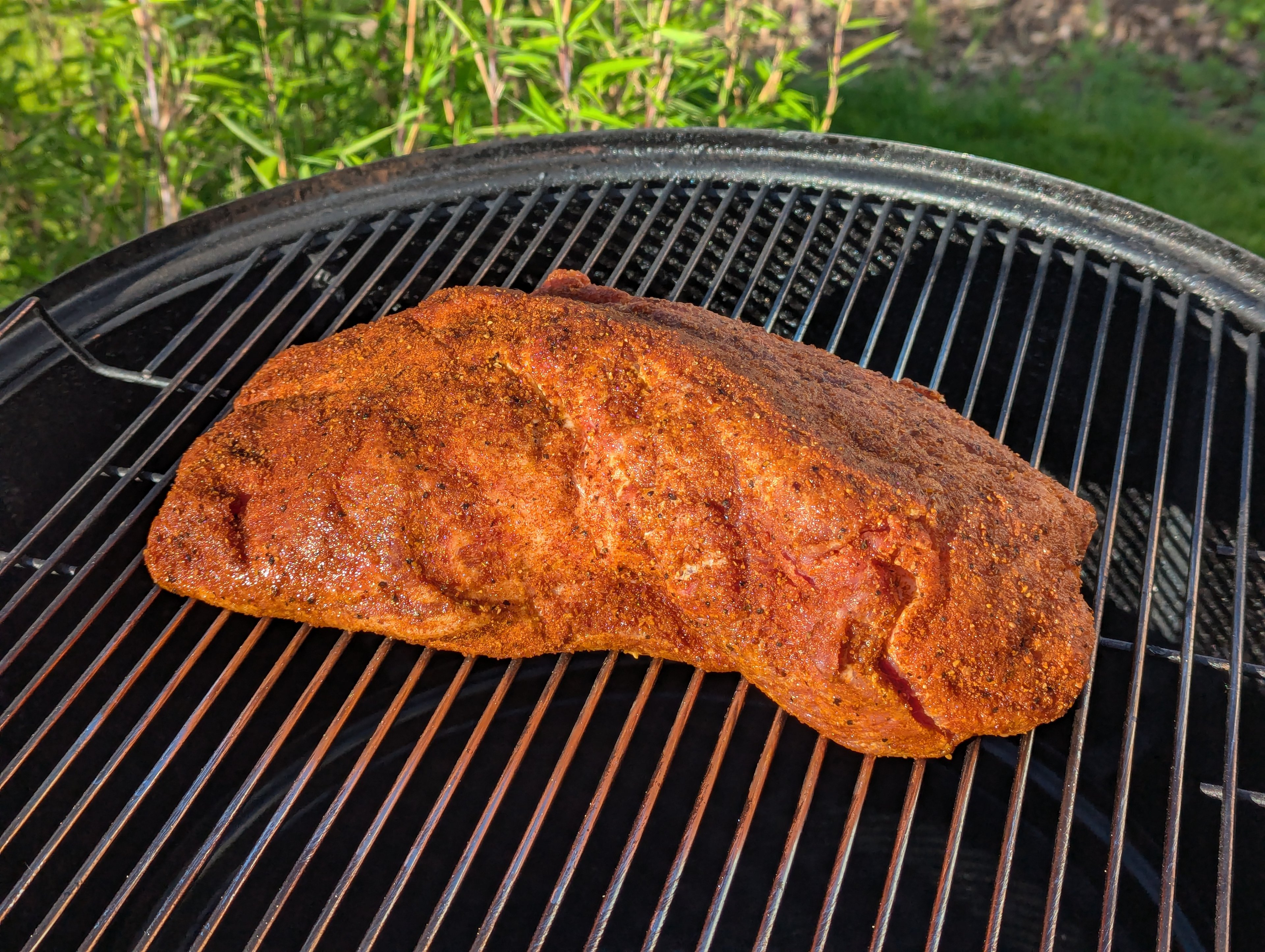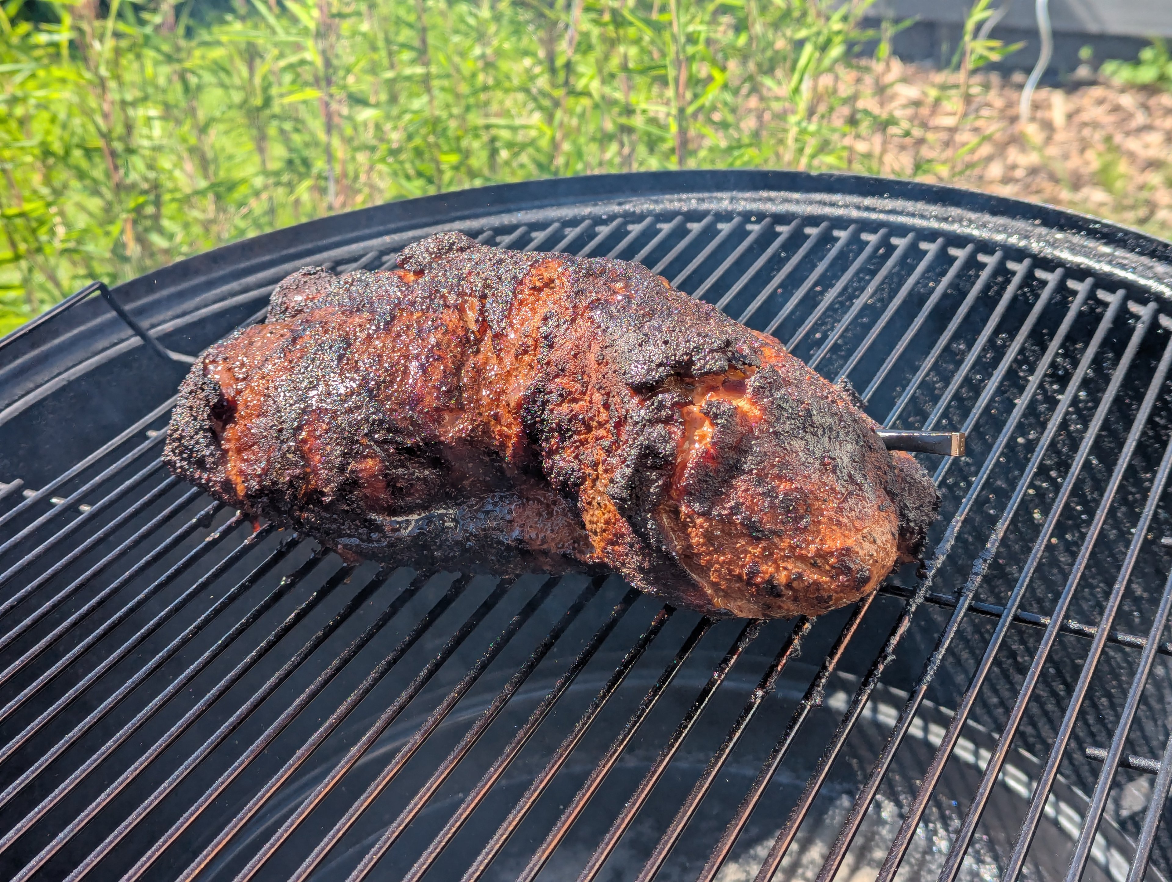 *Edit: nach einer weiteren Stunde habe ich komplett umgebaut und bin in den Gasgrill gewechsel in den Schwedenschalen mit Wasser. das war gegen 16 uhr, rausgeholt habe ich bei 95 Grad Kern und dann 30 Minuten Ruhezeit - gegessen haben wir um halb 7.