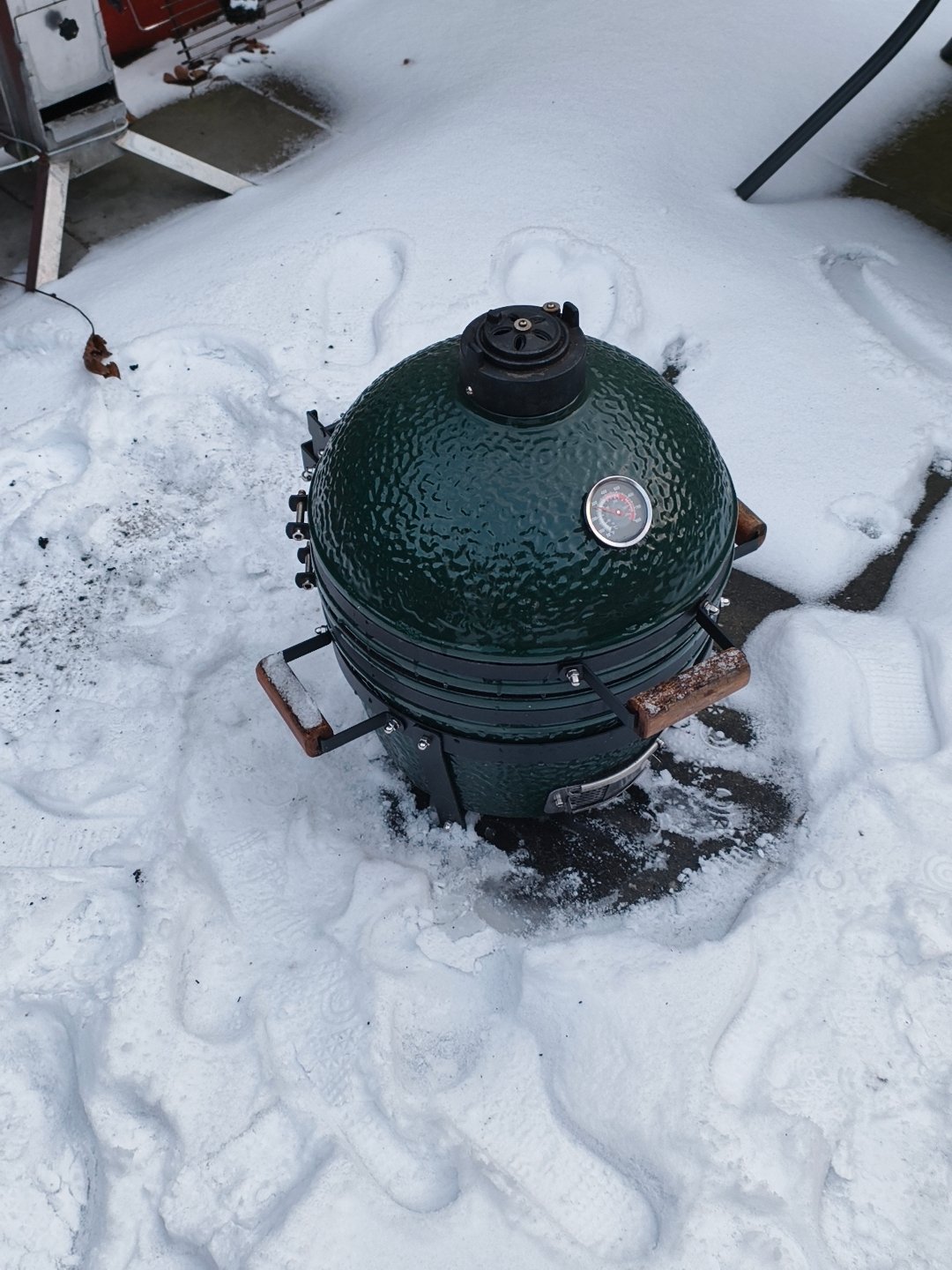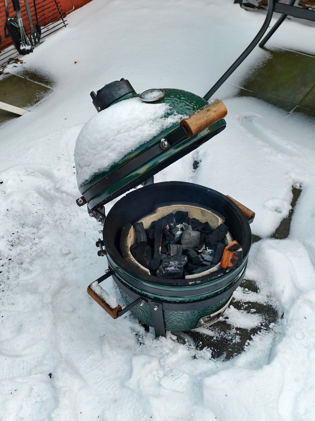 Das Klötzchen war da, damit der Deckel etwas auf steht weil mir mein großer Kamado schon mal komplett zugefroren war. Das war nicht lustig mit dem fertig vorbereitetem Pulled Pork wenn man den Grill nicht auf bekommt.
